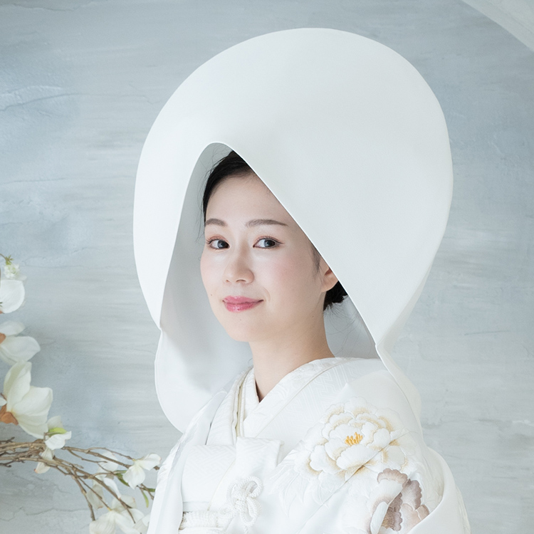 綿帽子は、白無垢を着用する際のみに使用できる、袋状の白い被り物です。綿帽子を被ることで、挙式が終わるまで新郎様以外にお顔を見せないという「恥じらい」を表現し、優しく清楚な花嫁姿を作ることができます。