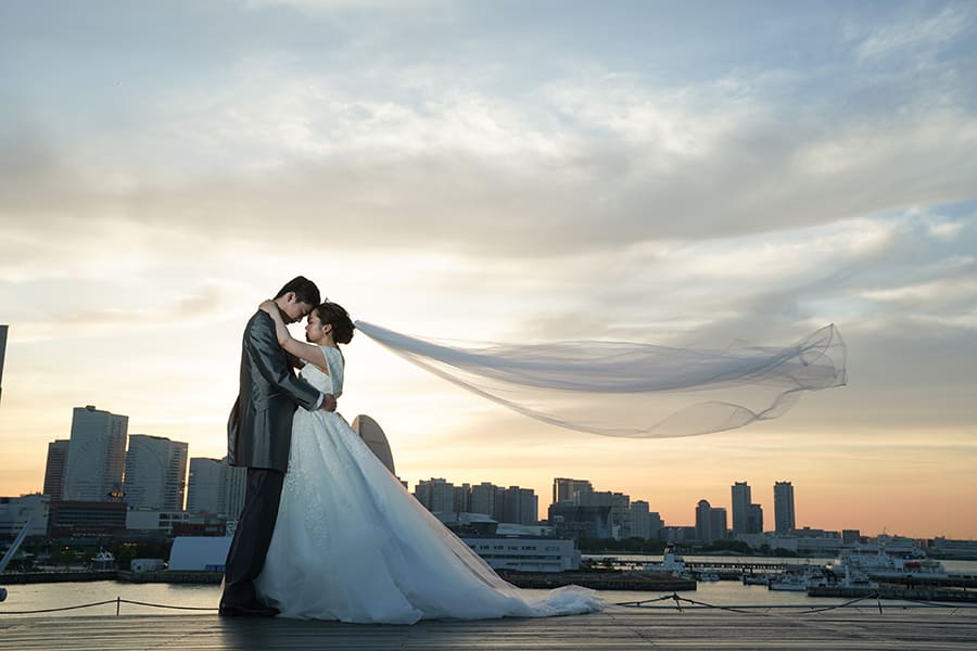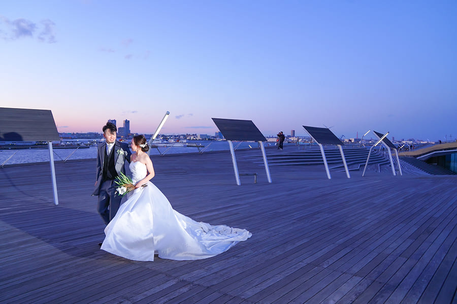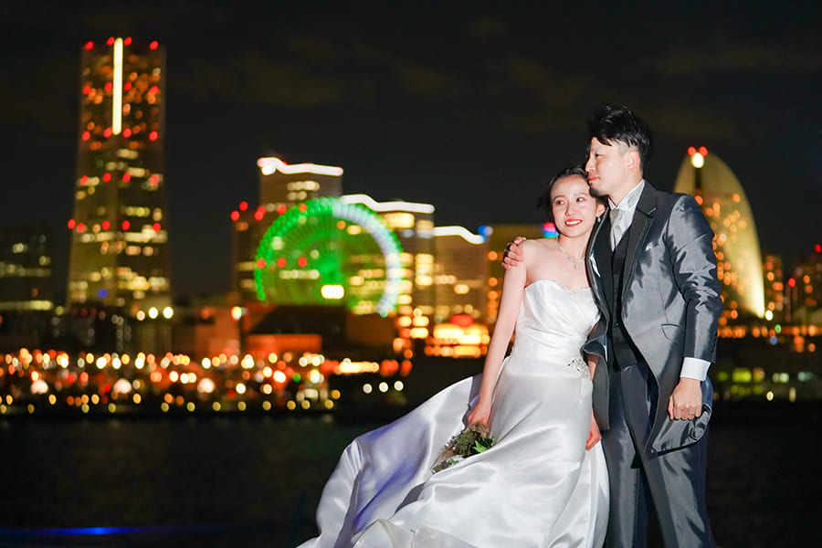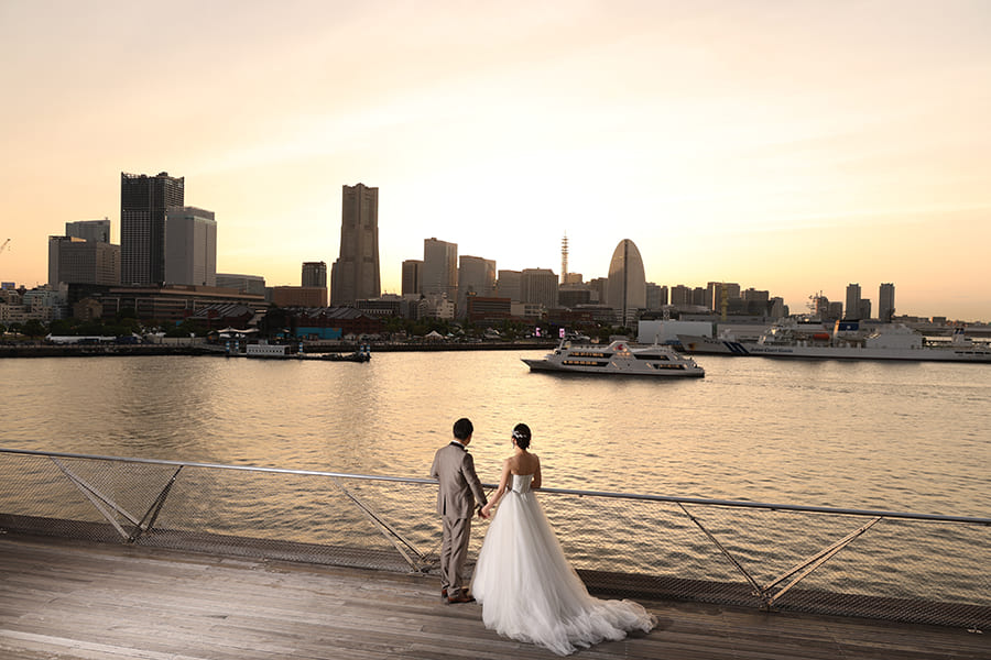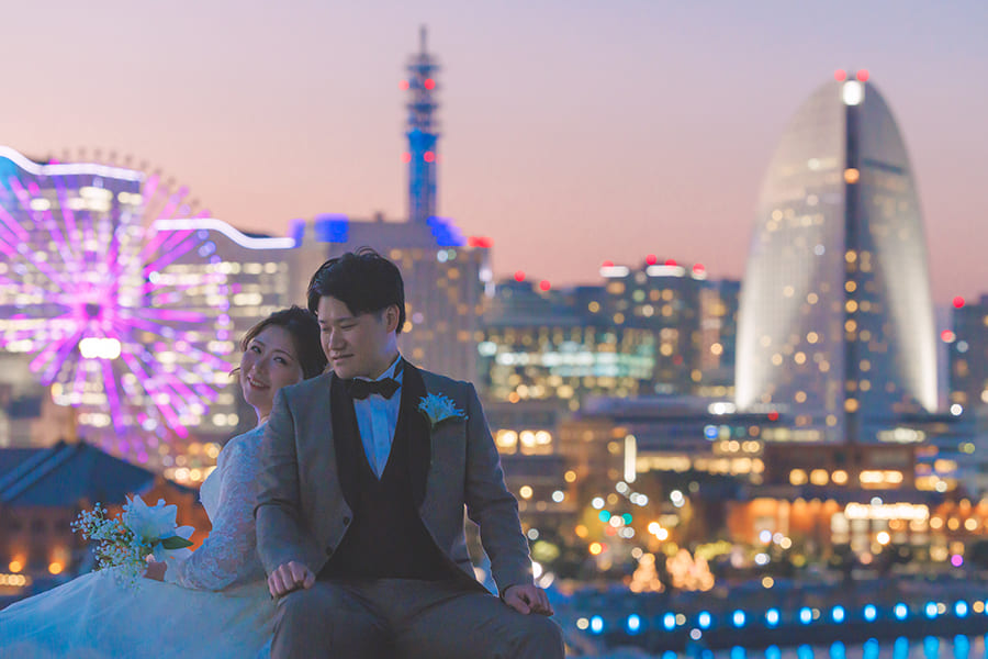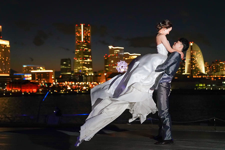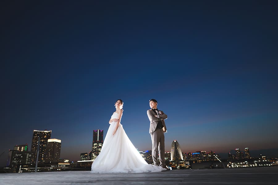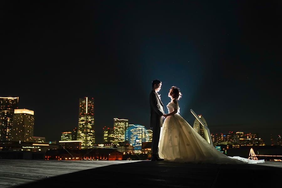 横浜の海に広がる大さん橋で、きらめく夜景に包まれるフォトウェディング。みなとみらいの光と水面の輝きが、おふたりの特別な時間をロマンチックに彩ります。開放感あふれるロケーションで、映画のワンシーンのような一枚を。