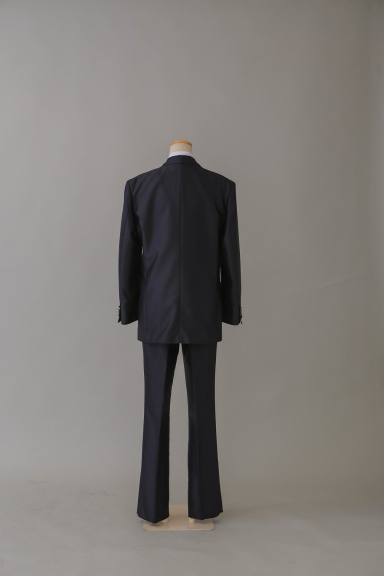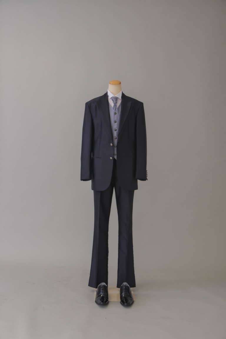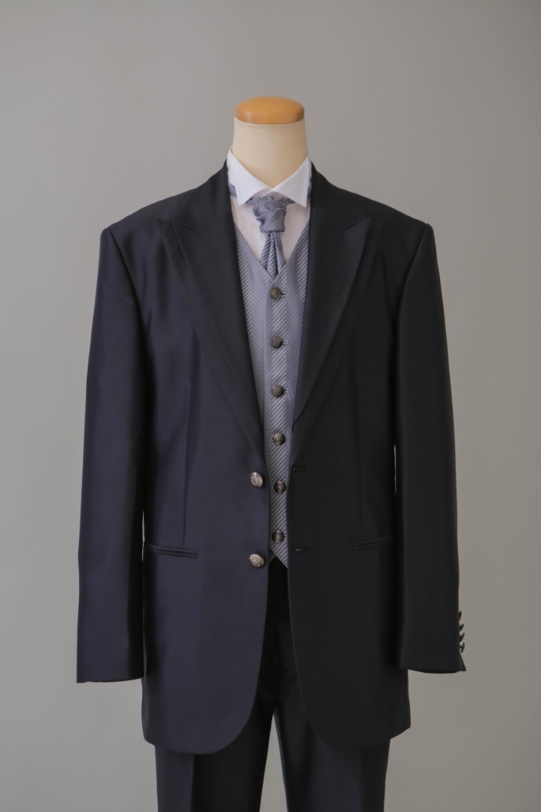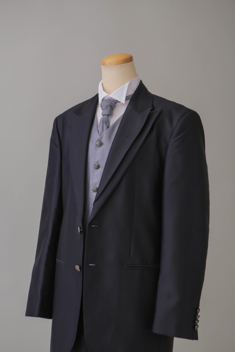 すっきりスマートなグレーのタキシード。くるみボタンでより上品に。
