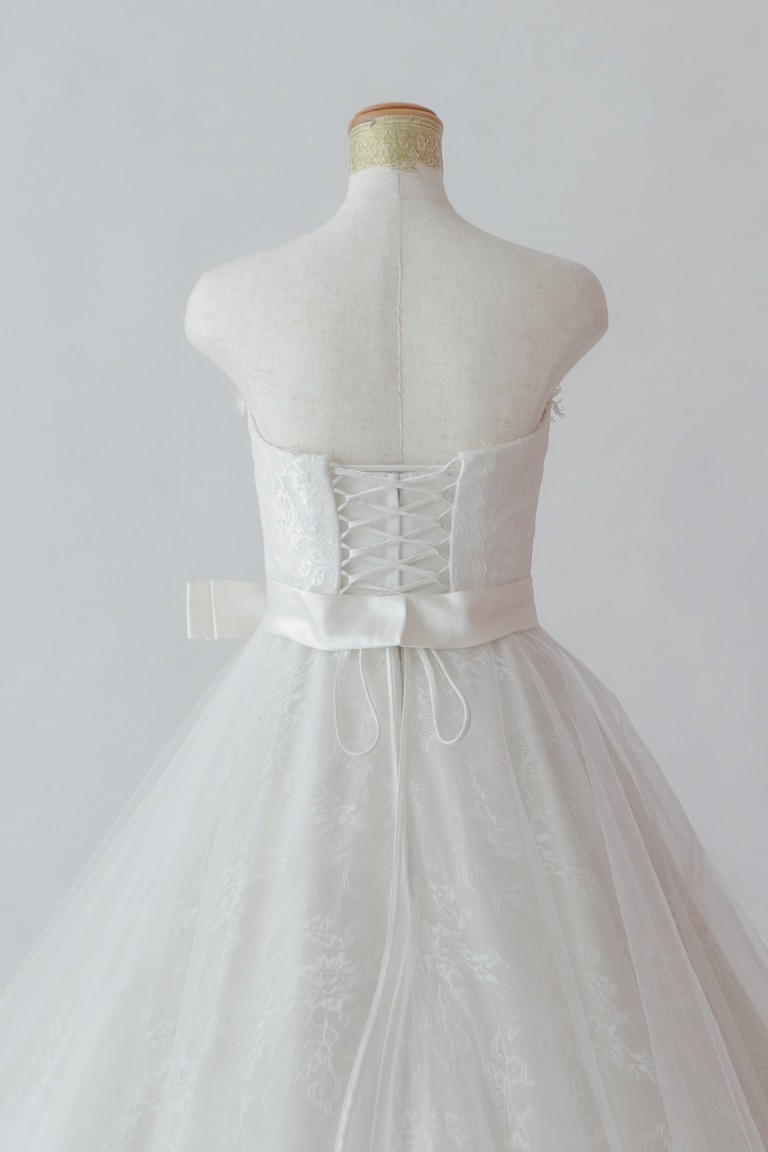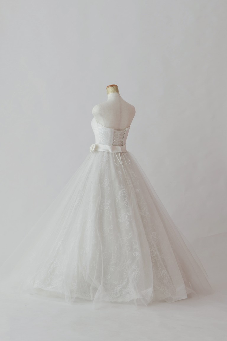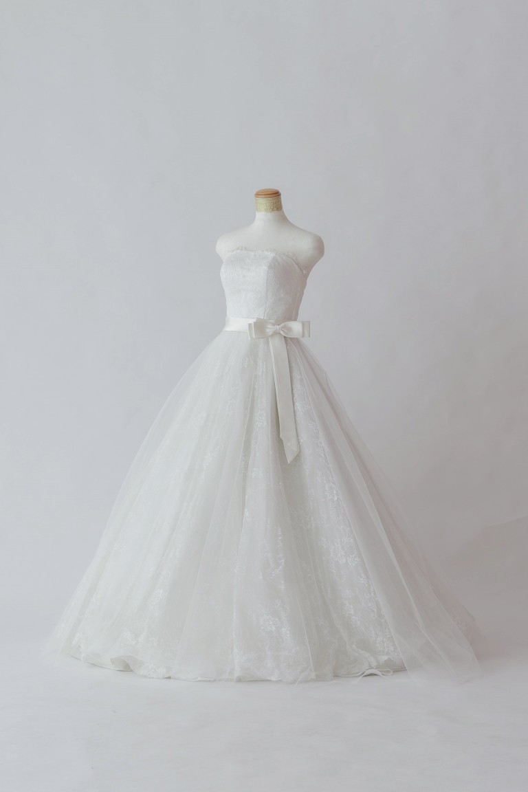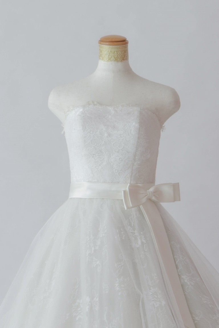 総レースのシンプルな形のプリンセスラインのウェディングドレス。ウェストに黒、白、水色、ピンクの4色から選べるサッシュベルトがついており、色々なアレンジを楽しめます。
