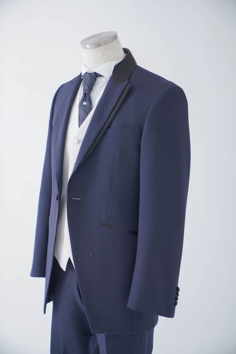 ネイビーのシンプルなタキシード。ベストの色味が柔らかい印象をあたえてくれます。