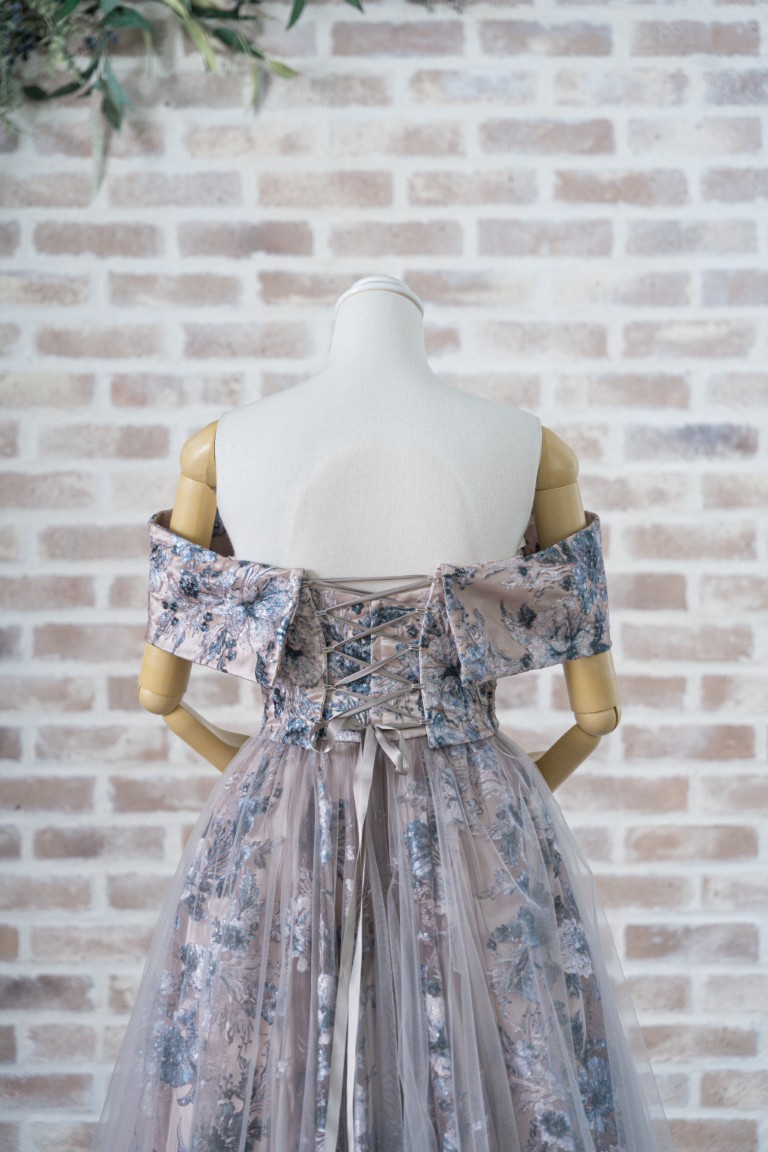 カラードレスとしてもお召いただけるような、グレージュのベースカラーにレース生地が重なったエレガントなドレス。大き目の花柄は背が高い方にも◎