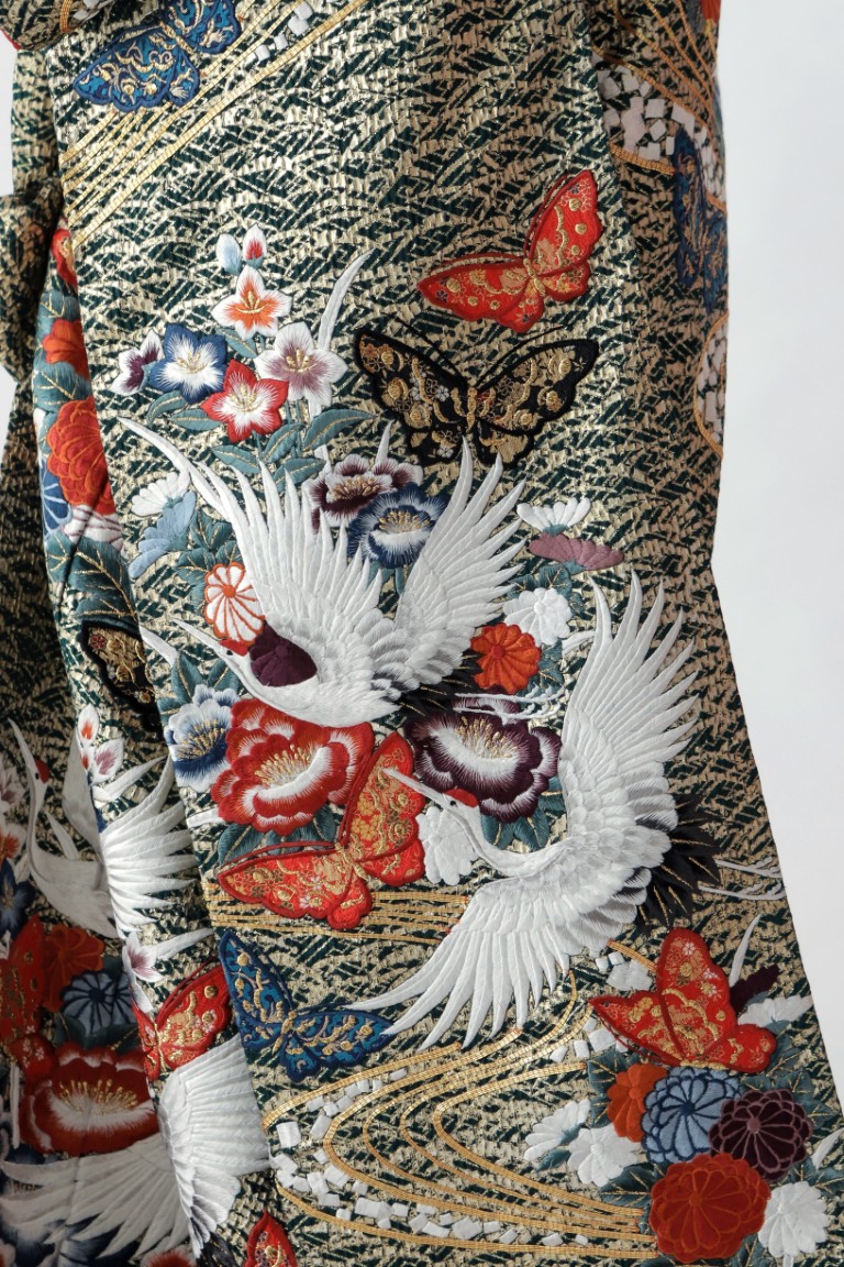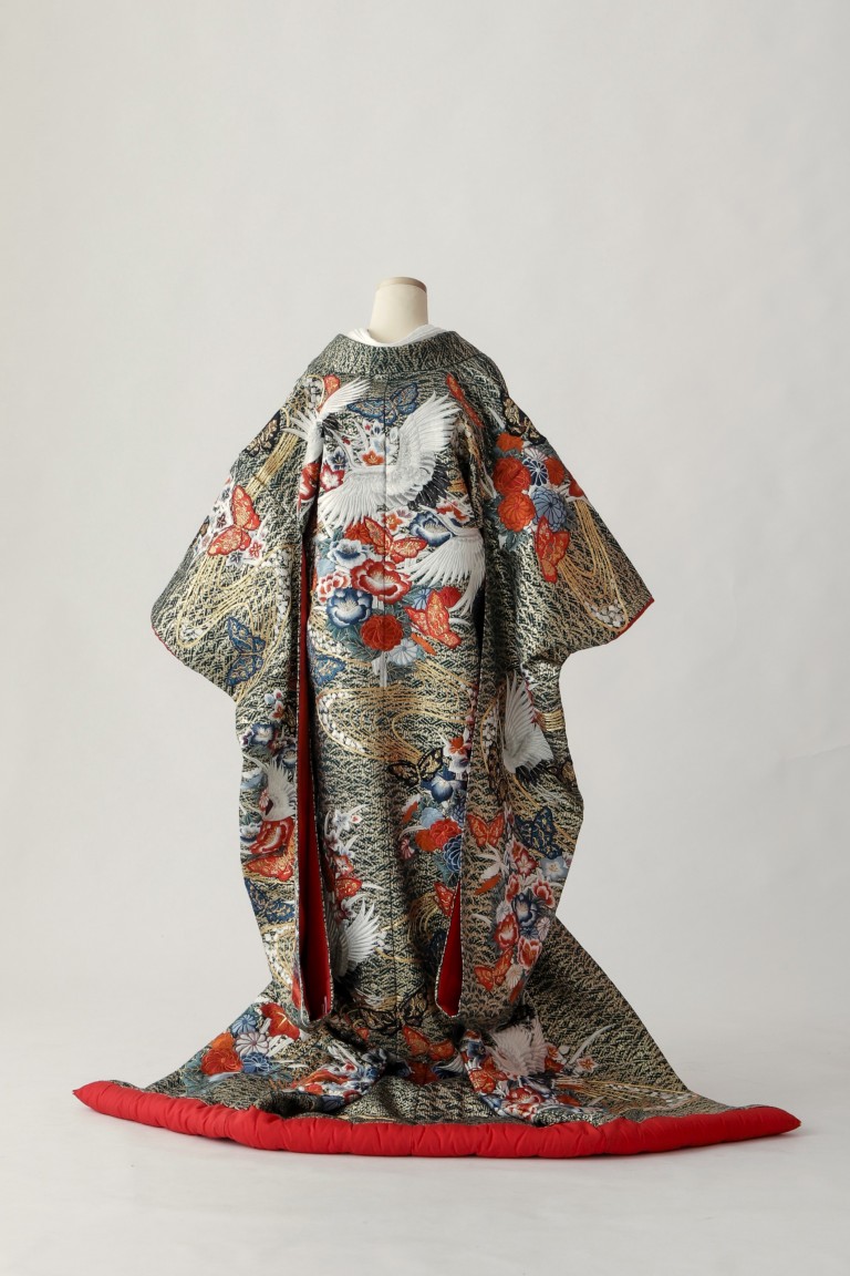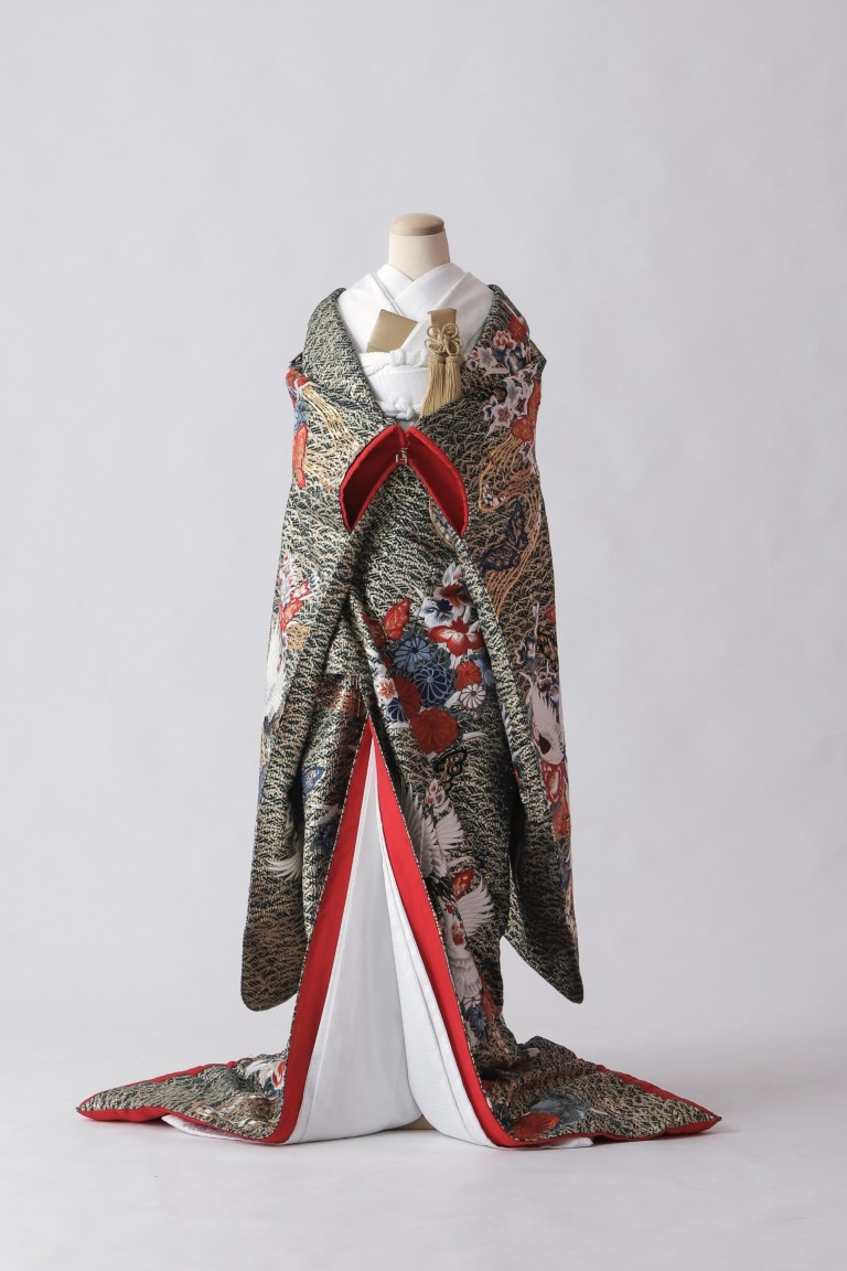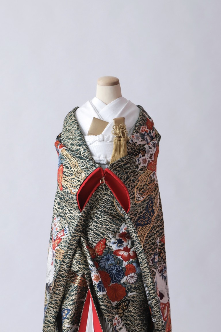 黒に近い深緑のベースカラーにたっぷりとゴールドの箔の模様がプリントされたかっこいい色打掛。鶴の他にも流水紋や蝶など、きりりと見える和柄がふんだんに使用されています。