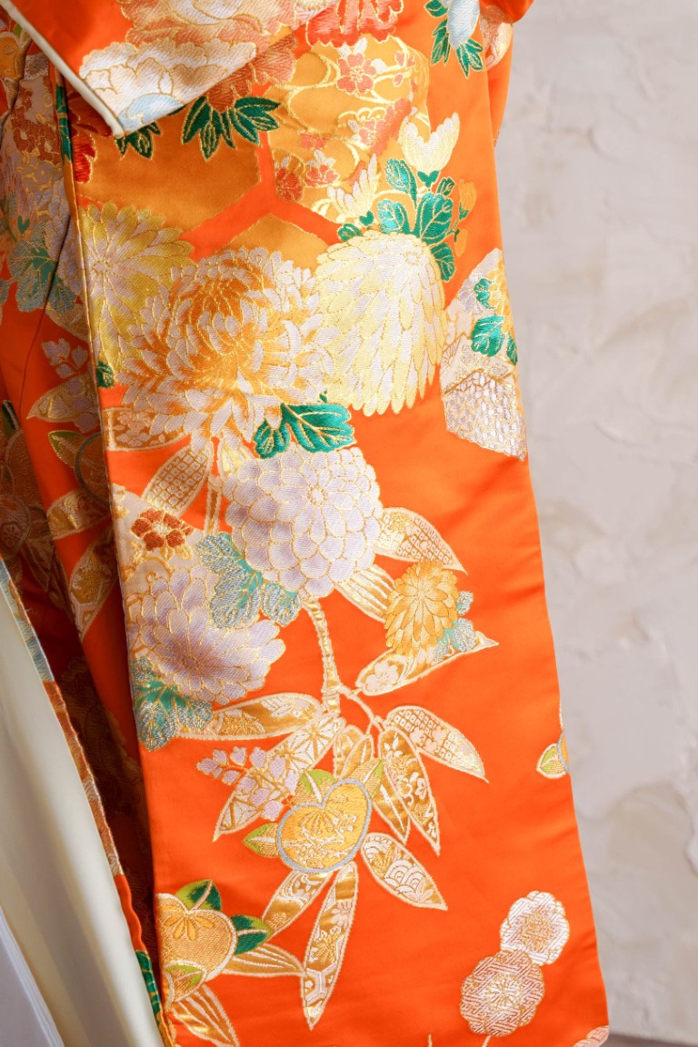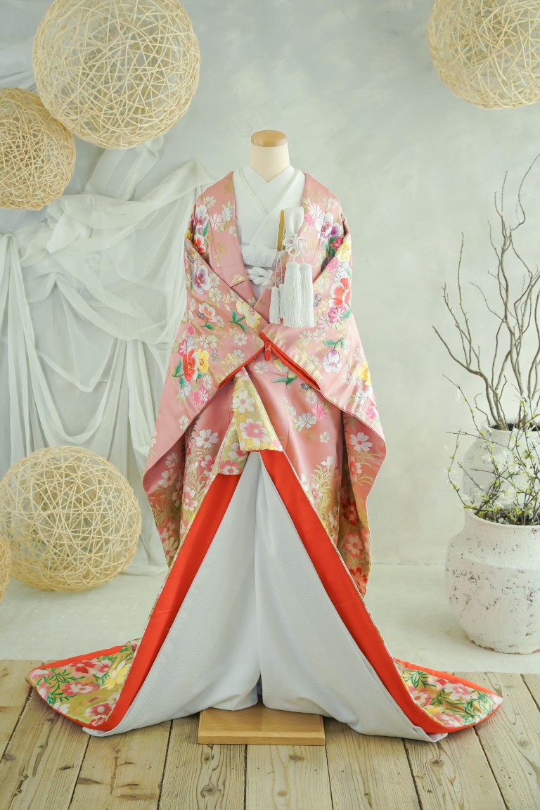 赤がベースカラーですが、全体的にカラフルな柄があしらわれ、トレンド感のある着こなしが叶う色打掛です。