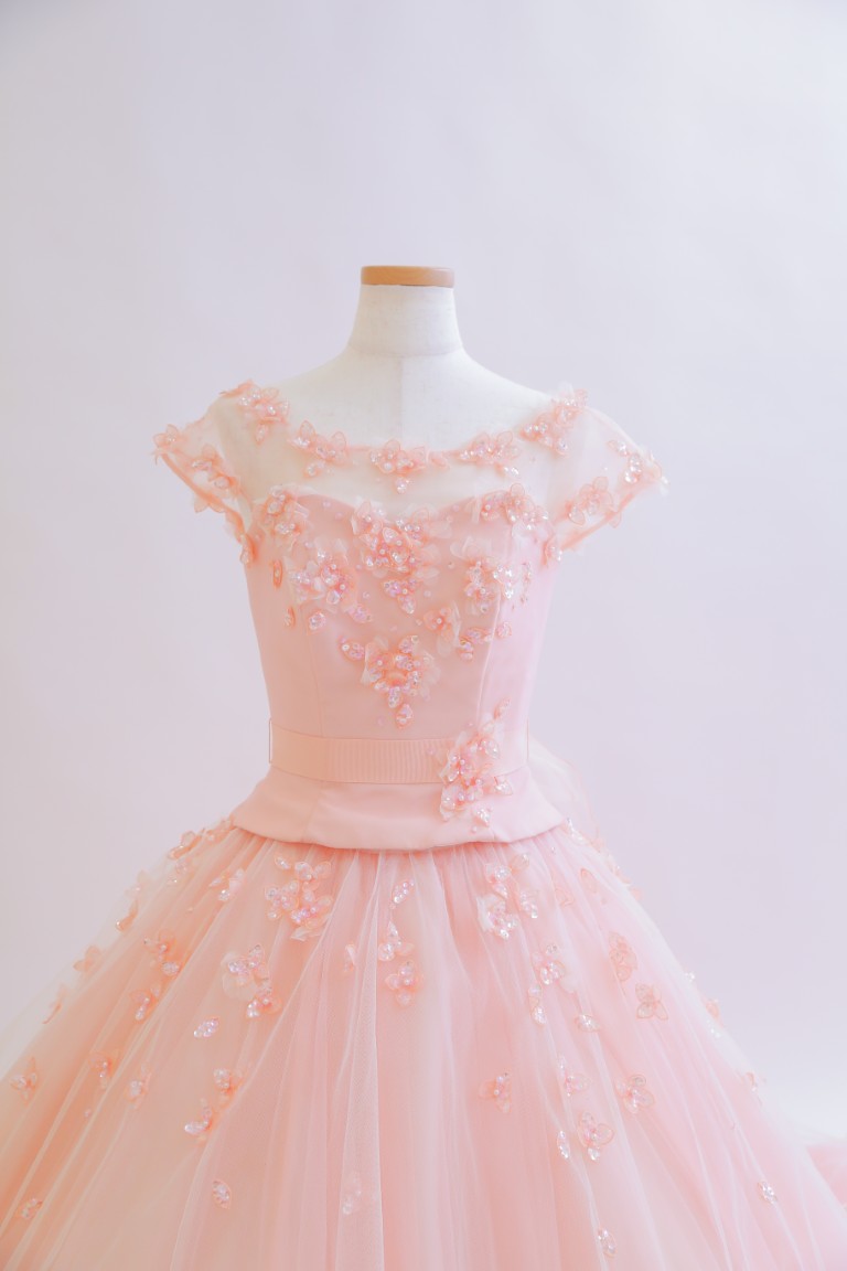 胸元の刺繍とスカートに広がるキラキラがキュートな印象。