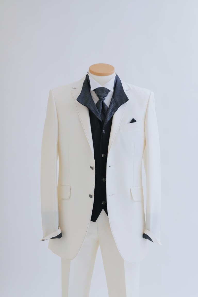 落ち着いたトーンのベージュ系のタキシード。ライトベージュのタイがお顔周りを明るく華やかにみせてくれます。