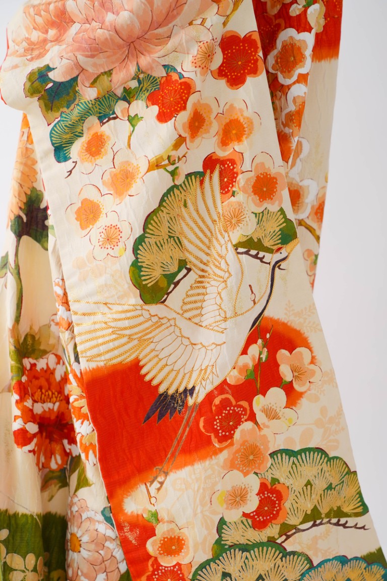 ゴールドが艶やかな色打掛。裾が重なっている点も個性的でゴージャスな印象をもたらしてくれます。