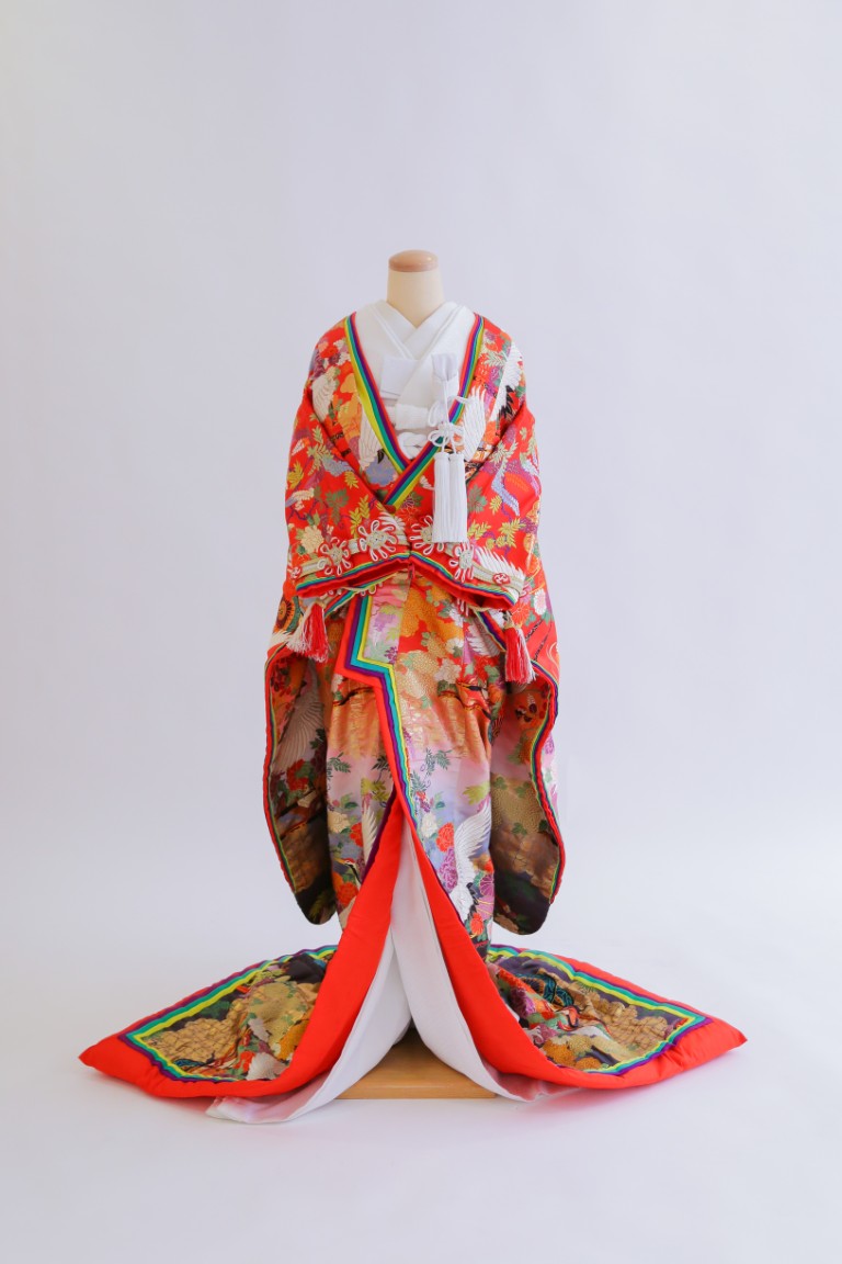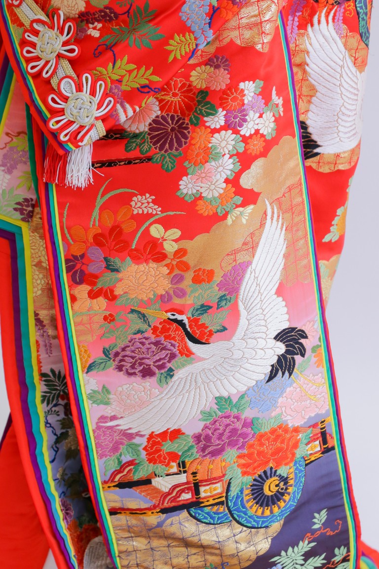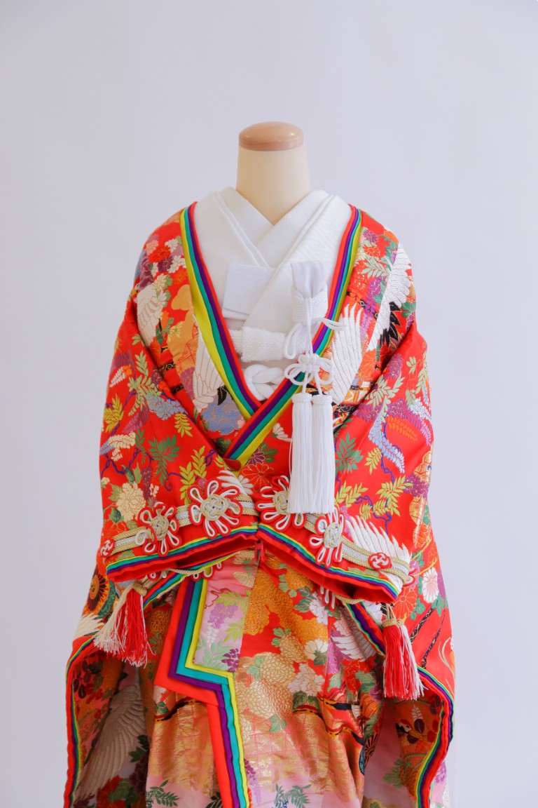 裏地やふきが黄色で、少し彩度を抑えた上品な赤とピンク、という珍しい配色の色打掛。柄も華やかなので、個性的でゴージャスなものを好まれる方におすすめ。