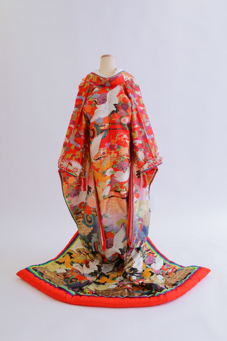 重ねられた生地が華やかな印象をもたらす、クラシカルな柄の色打掛。そで口にあしらわれた房飾りがポイント。