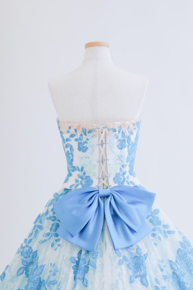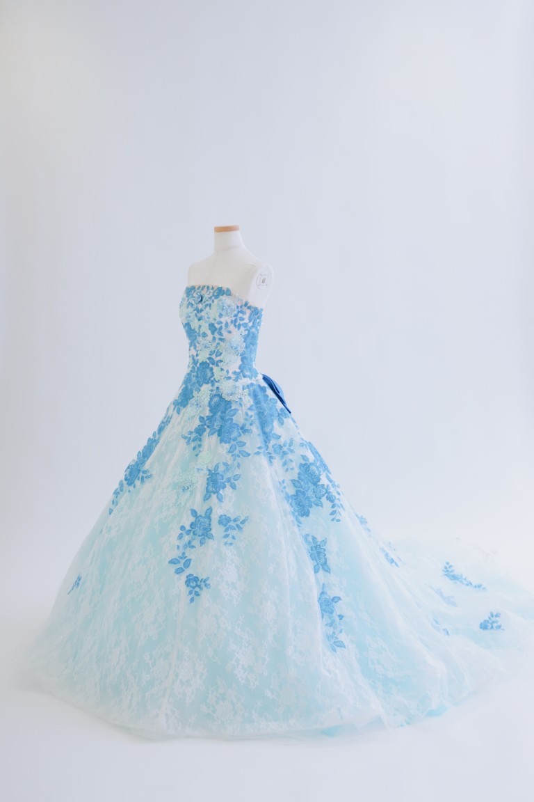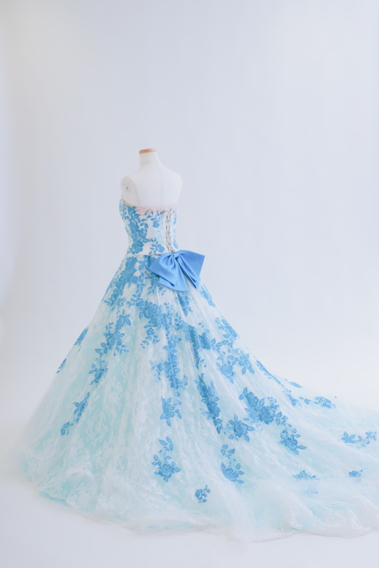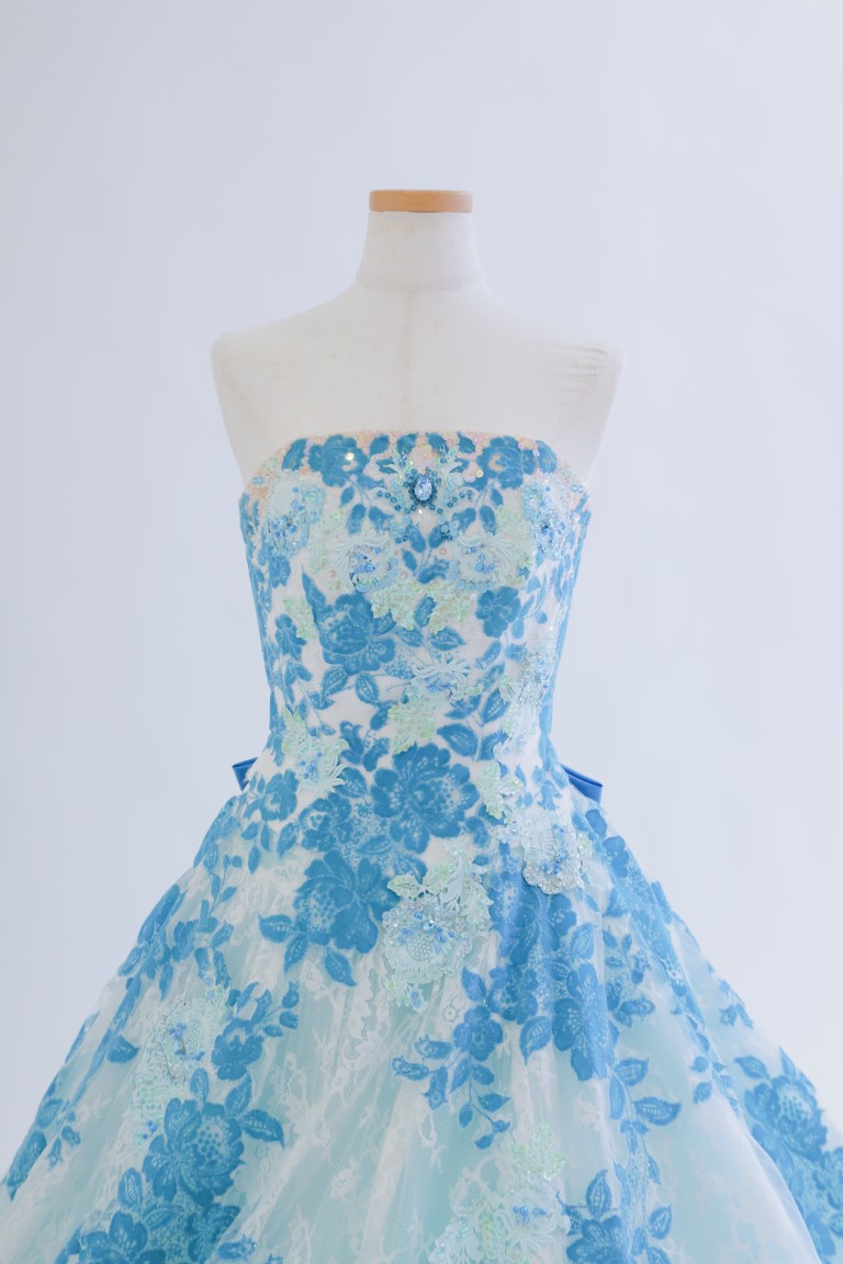 鮮やかなブルーに、抹茶色の刺繍がワンポイントになった、凛とした印象の色打掛。柄の多くは淡い色味でまとめられているため、上品な装いに。