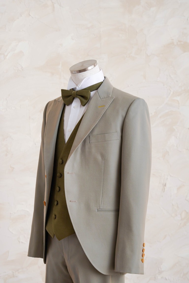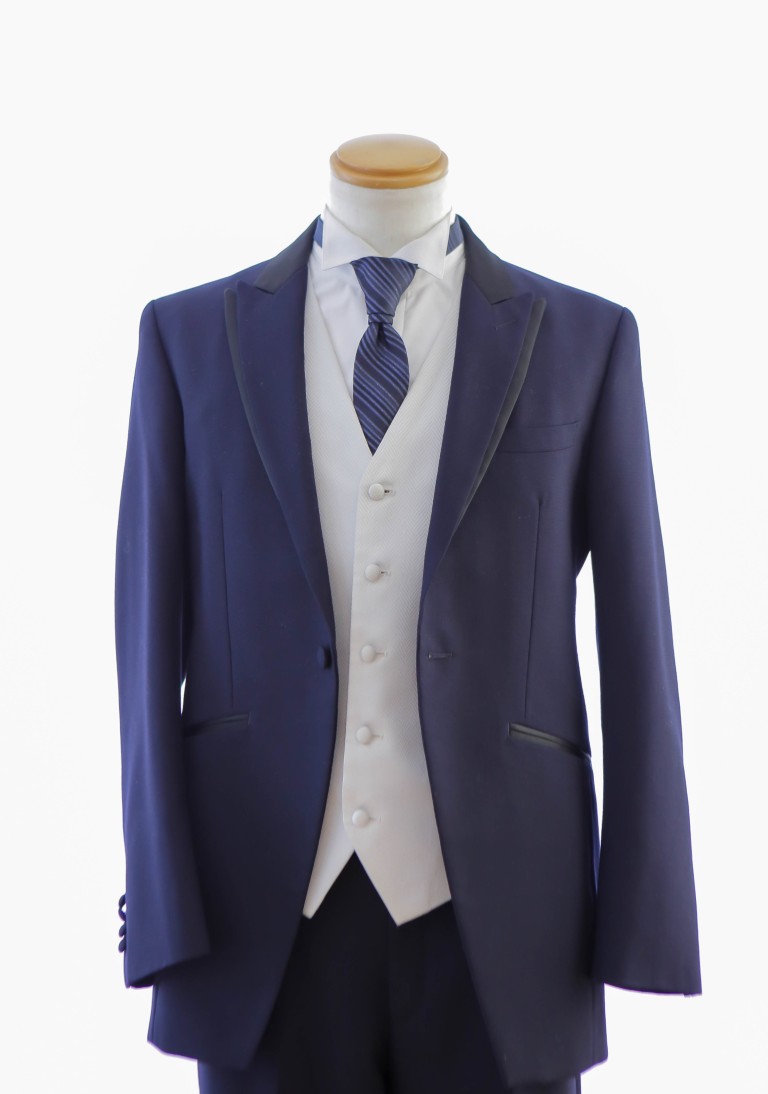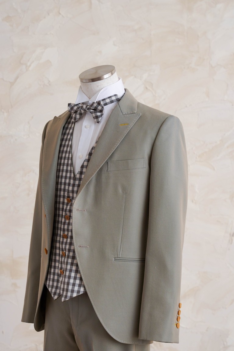 定番の白のタキシードに、襟付きベストがポイント。襟は出してアクセントにしたり、ジャケットの中にしまってすっきり着ることもできます。