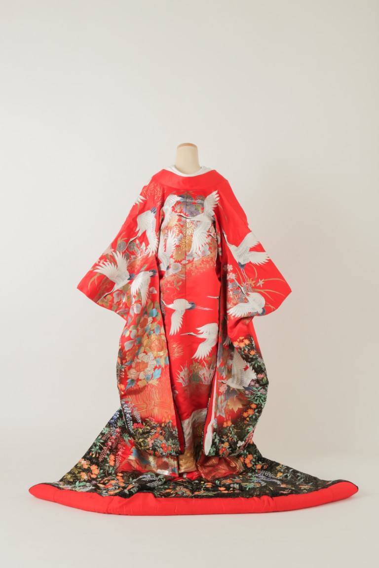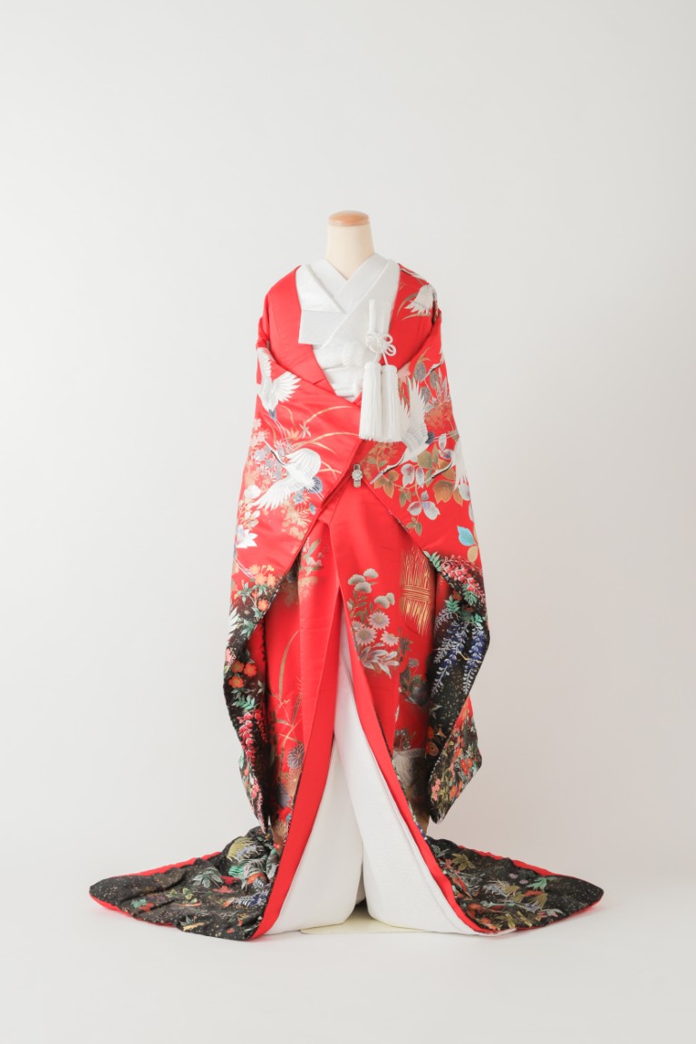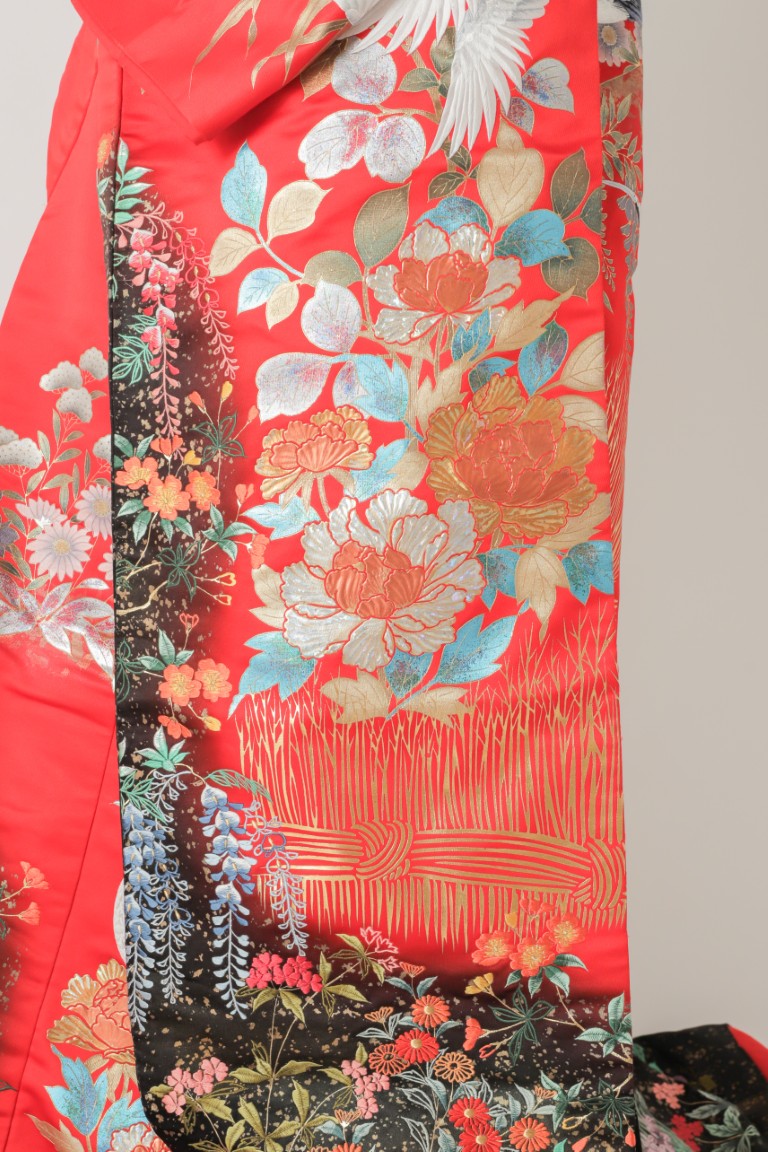 赤地がベースで、裾にかけて黒のグラデーションになっているこの色打掛は、飛び立つように流れで配置された鶴の柄が美しい1着。きらきらとした牡丹柄の箔プリントが艶やかさをプラスしてくれます。