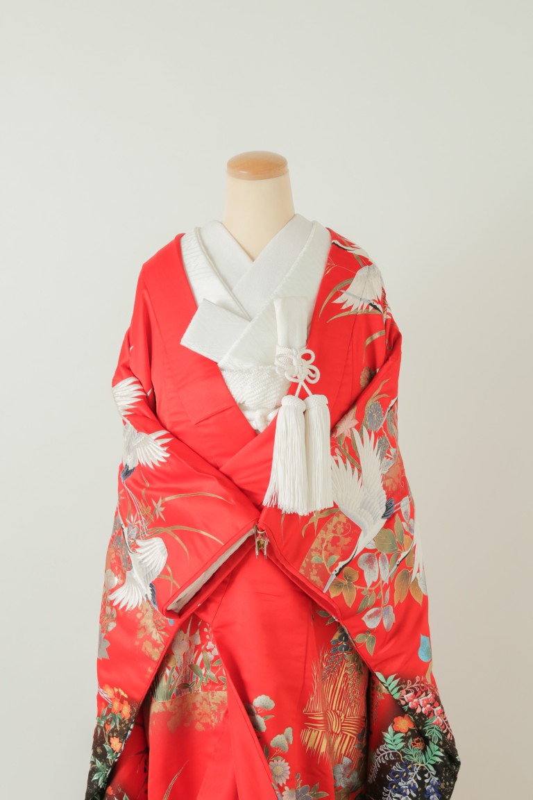 古典的な赤系の色打掛。色とりどりの花と御所車、鶴、松の柄が刺繍されており、ゴールドの箔プリントが和装らしい華やかさを演出してくれます。
