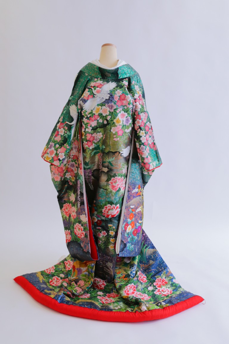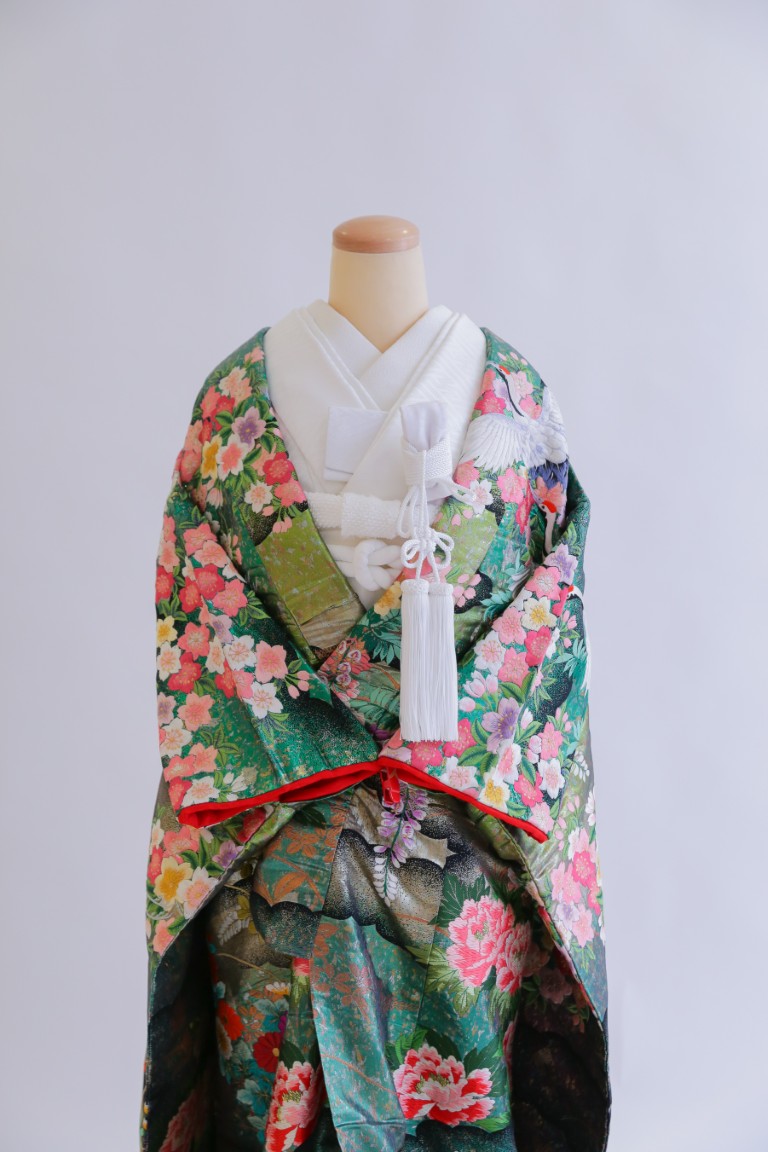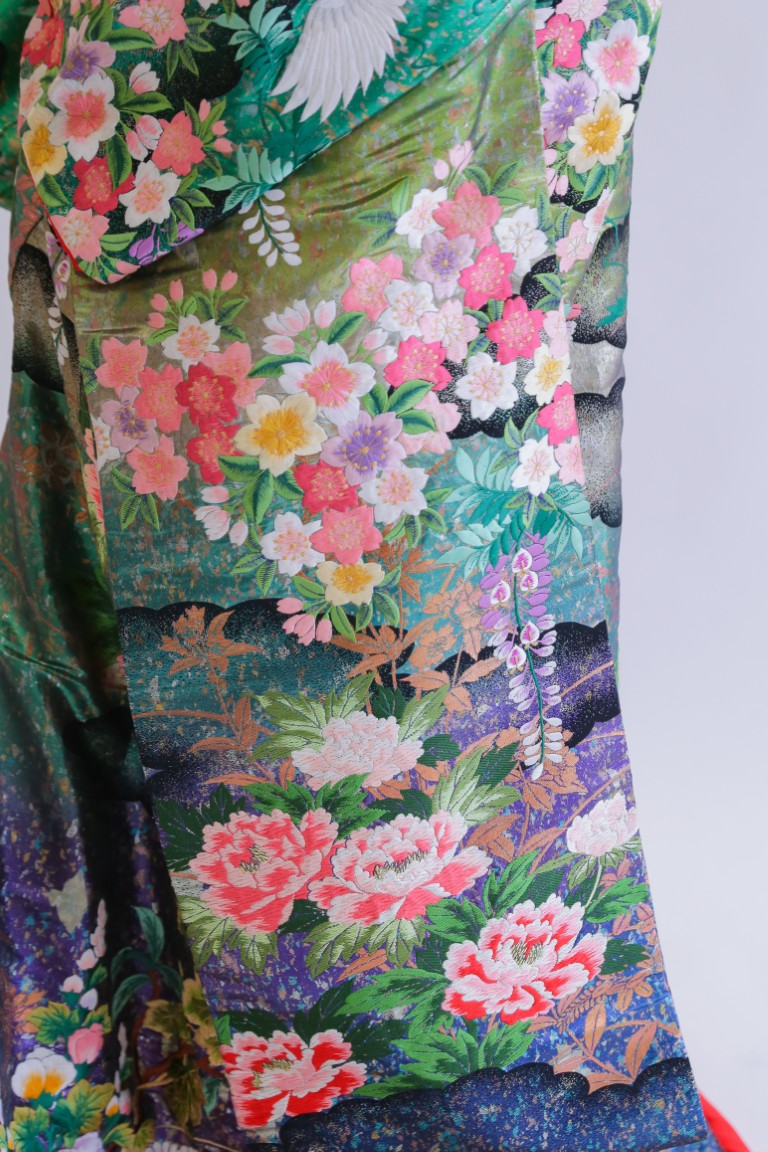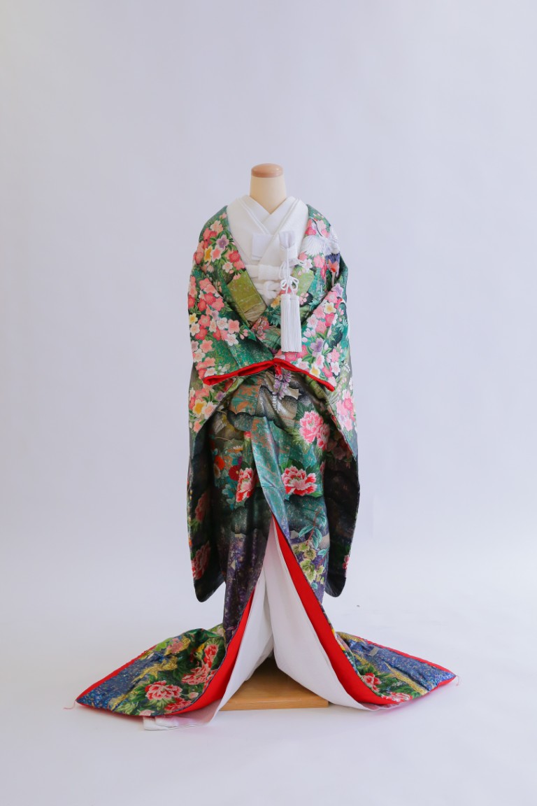 グリーンのベースカラーに、裾にかけて鮮やかなブルーのグラデーションが美しい、個性的な色打掛。桜や牡丹の花柄は淡色のピンクやライトパープルが使われているため、優しい雰囲気をプラスしてくれます。