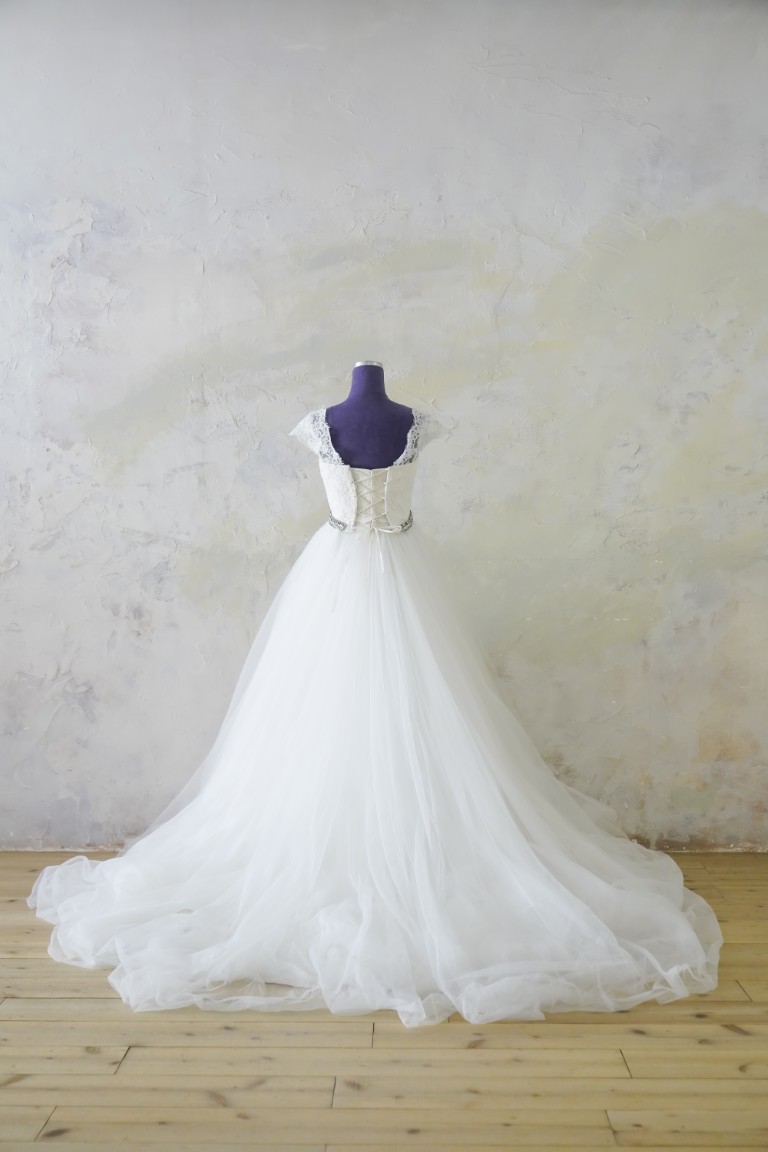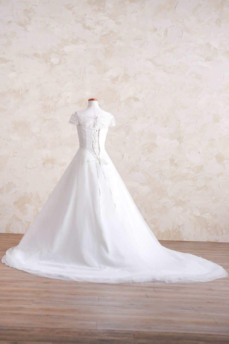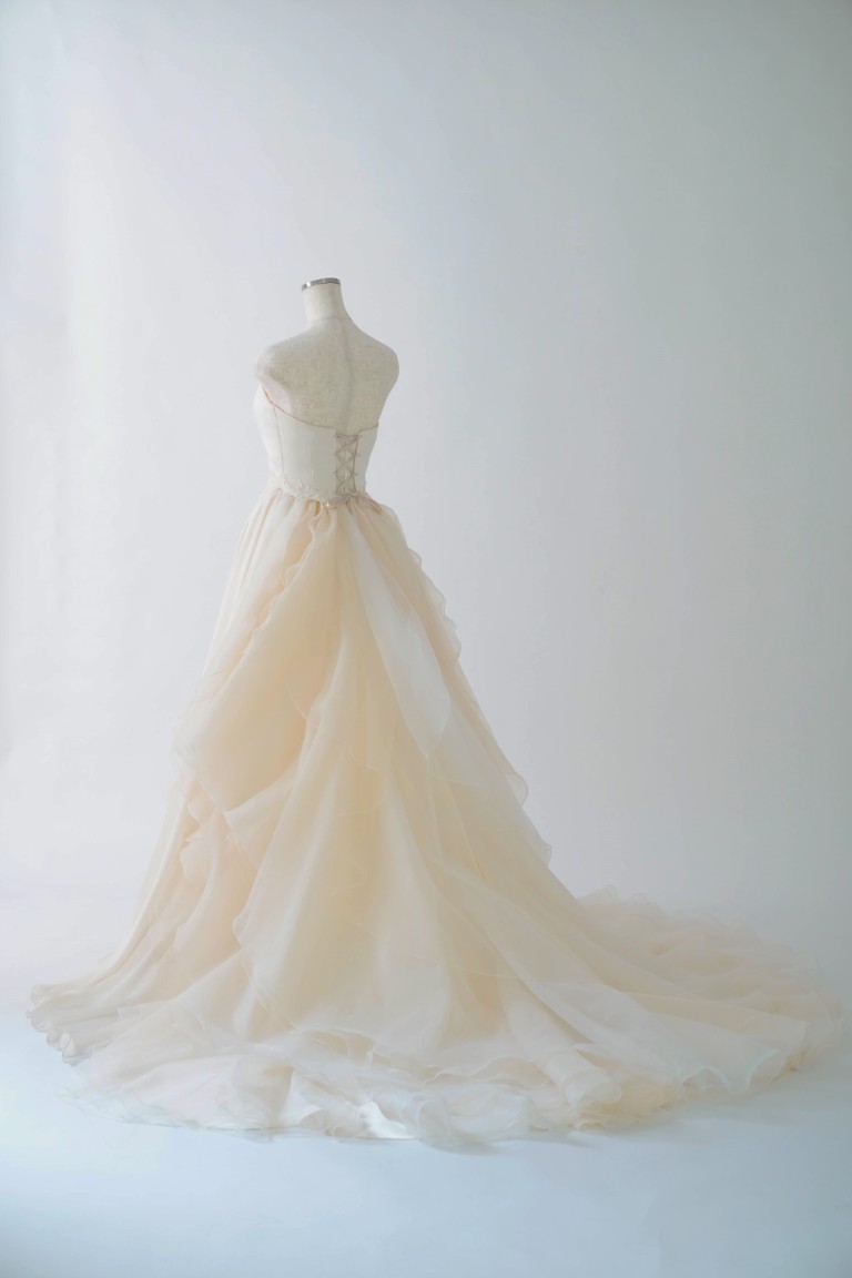 ハリのある生地のソフトマーメイドドレスで、斜めに入れられたタックや胸下の部分にあしらわれたビーズが体のラインをより細く綺麗に見せてくれます。パフスリーブのボレロをつけると、さらにかわいらしい印象に。