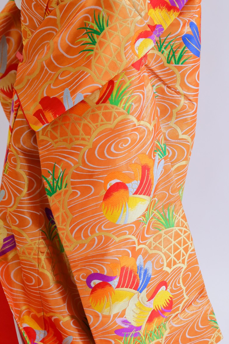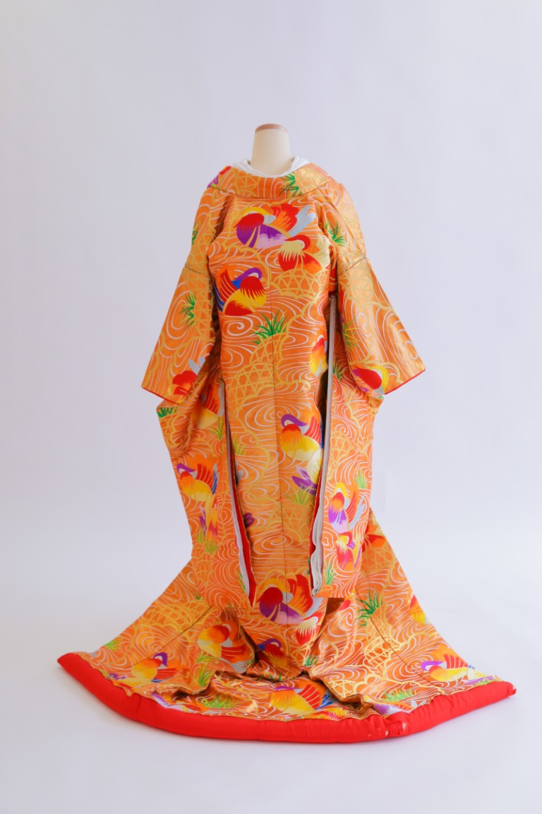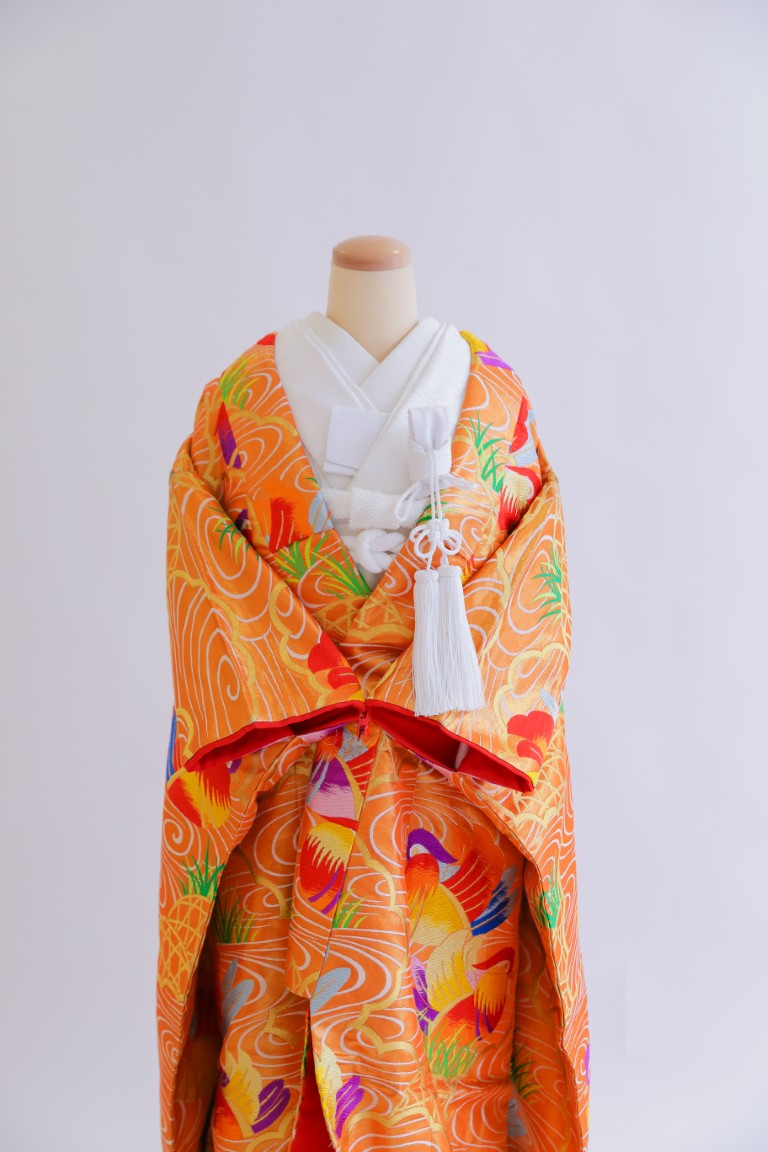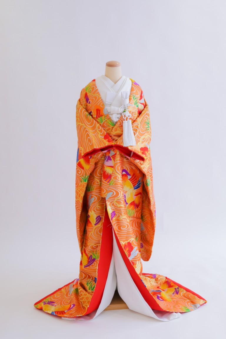 全体的にゴールドの流水紋があしらわれたモダンな印象のオレンジの色打掛。鴛鴦柄の刺繍が差し色となり、華やかさをプラスしてくれます。