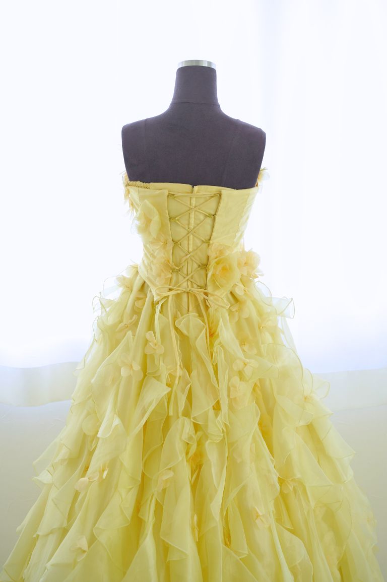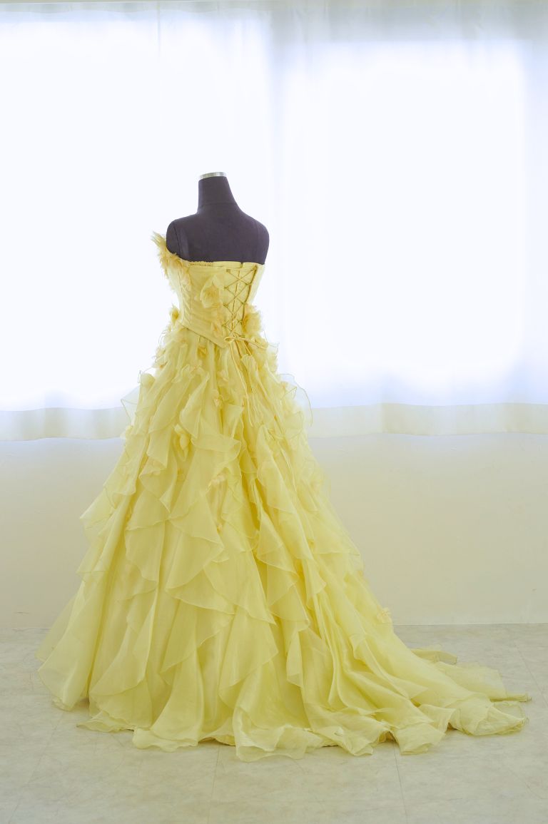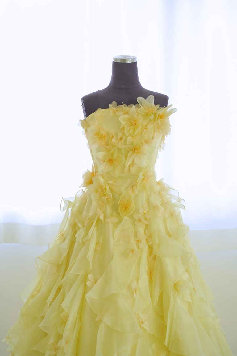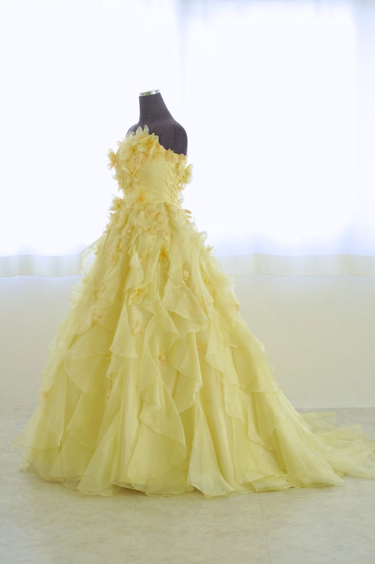 たっぷりフリルで彩られた、レモンイエローのカラードレス。小花のコサージュがちりばめられ、可憐で可愛らしい印象を与えてくれます。フリルは多めですが、ドレスシルエットがAラインなので、全体的にすっきり見える着やせ効果が期待できる1着です。