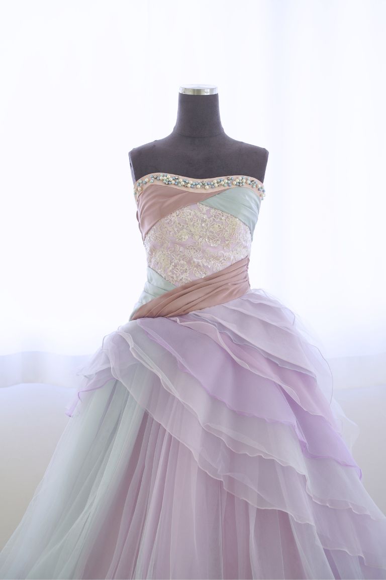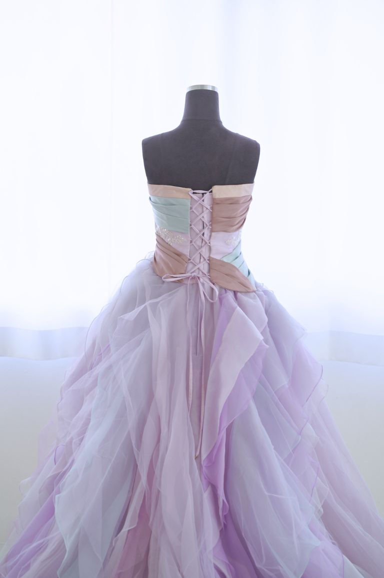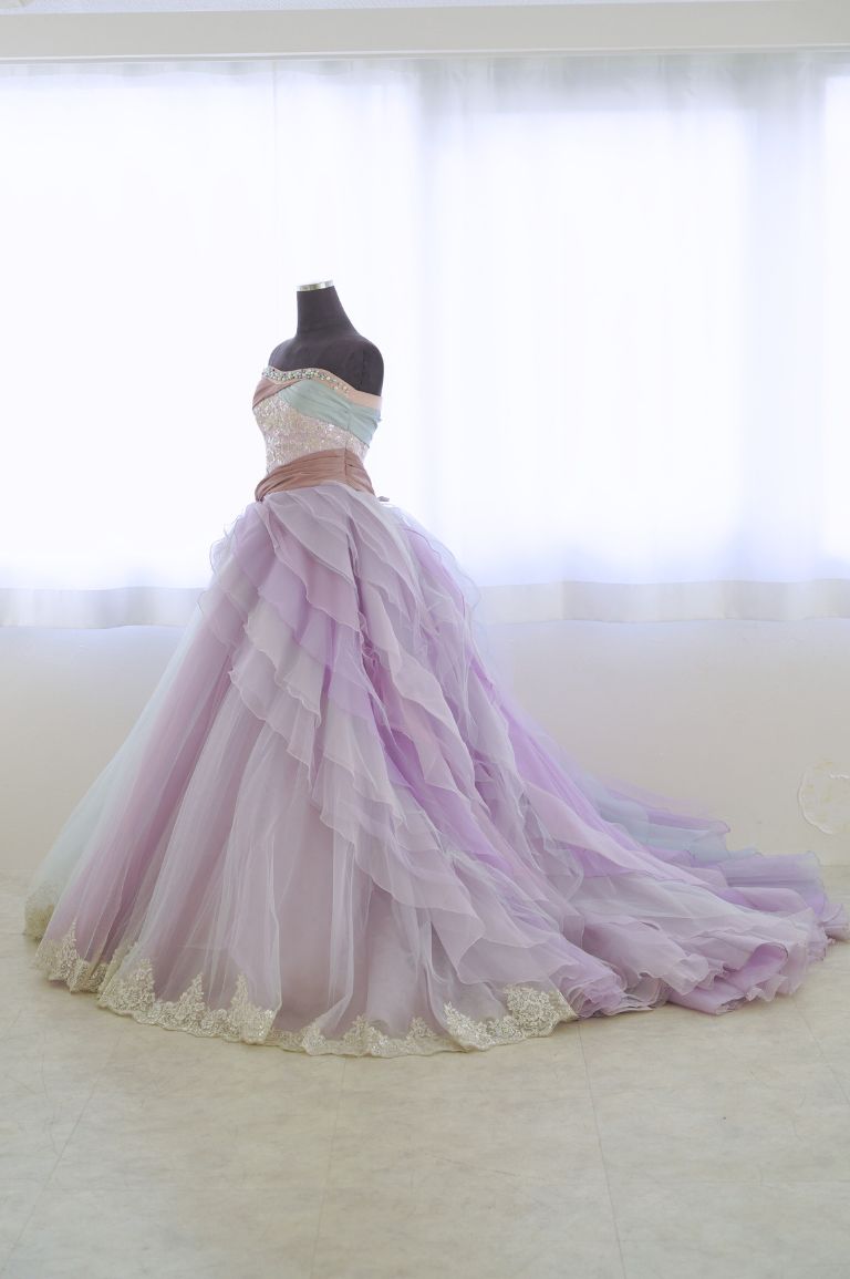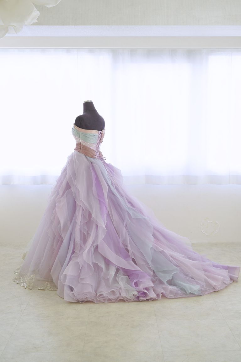 寒色系のグラデーション生地がたっぷり重なった、華やかなカラードレス。ポイントとなる色味でななめに入ったドレープのデザインで、ウェストの細見え効果も期待できます。