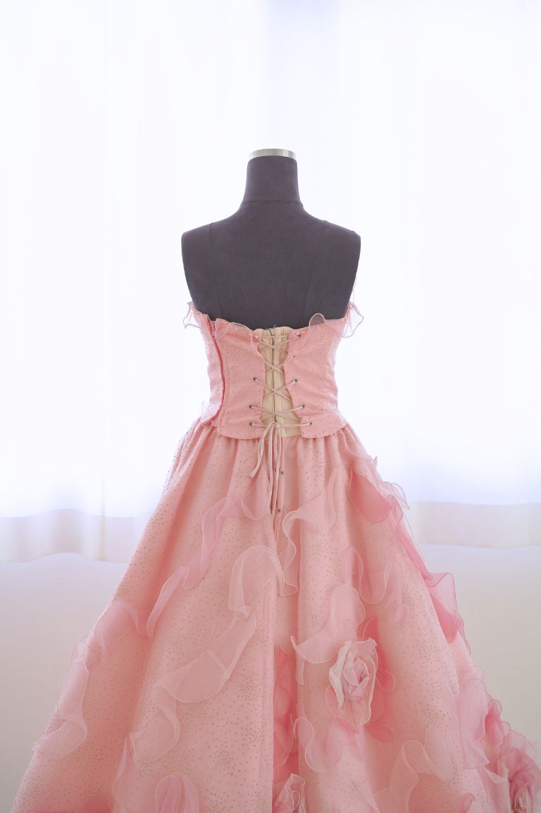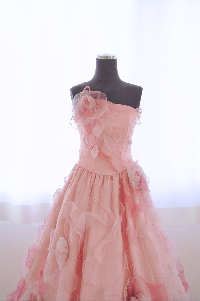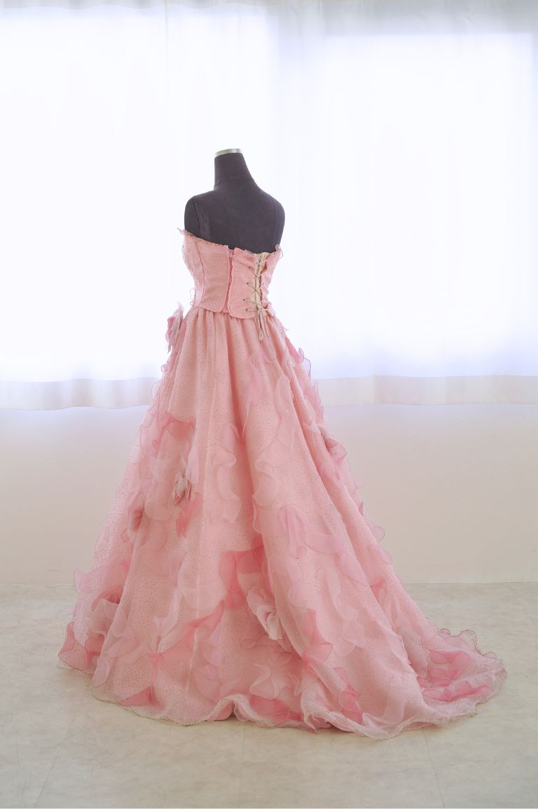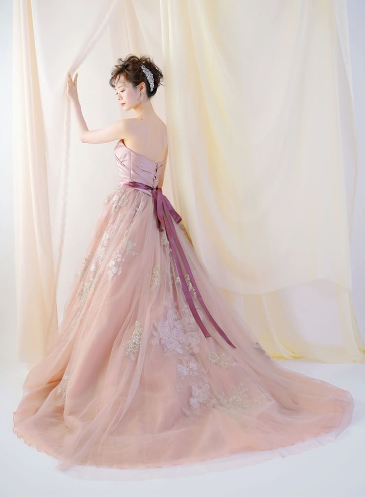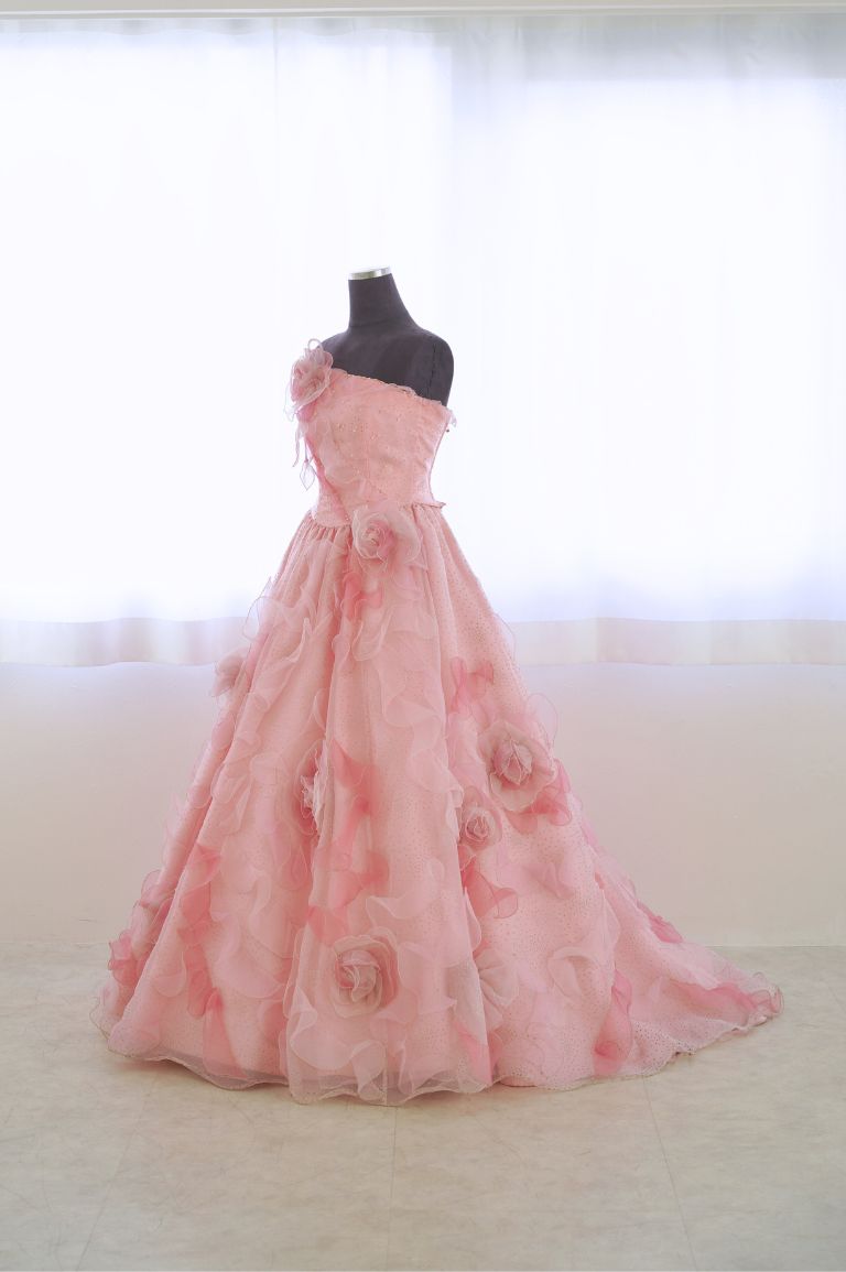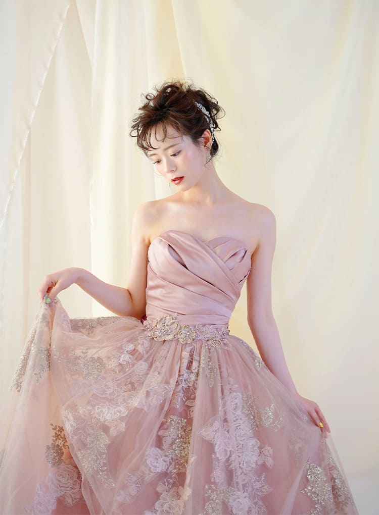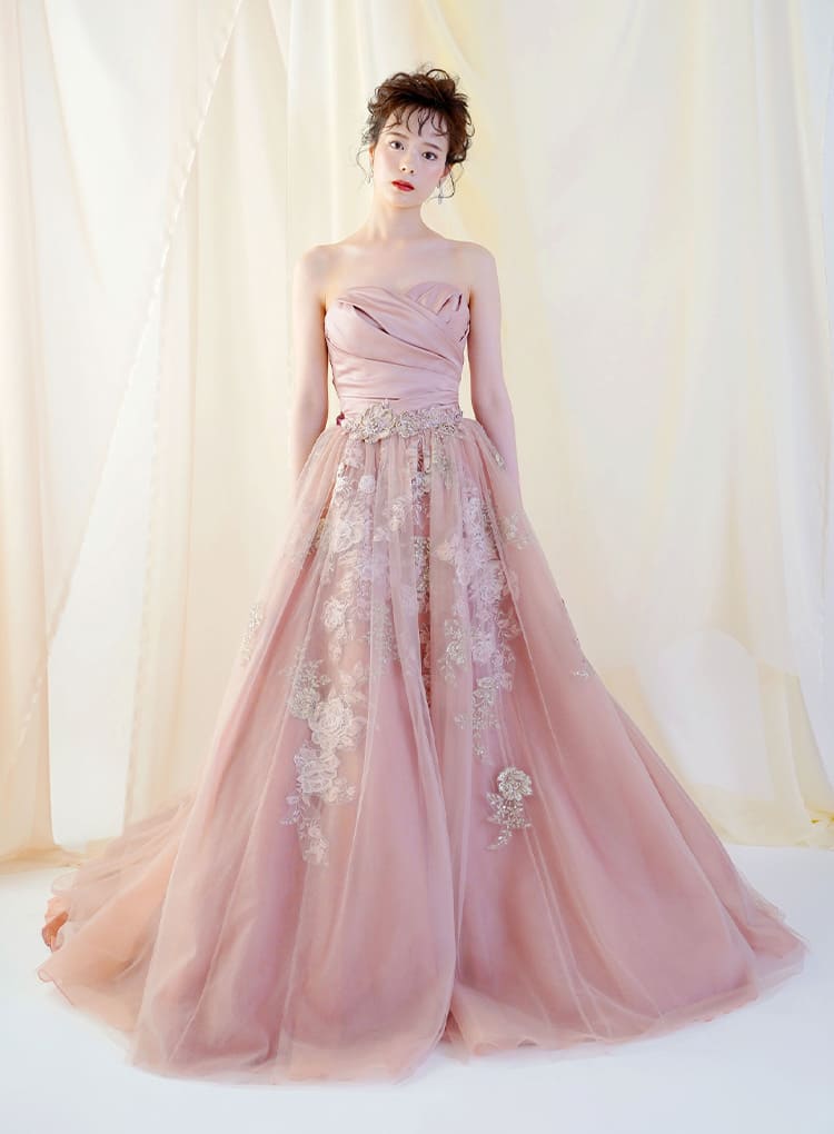 ふんわり柔らかい印象のピンクのカラードレス。全体にちりばめられた花びらが、華やかな印象をもたらしてくれます。