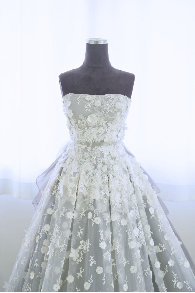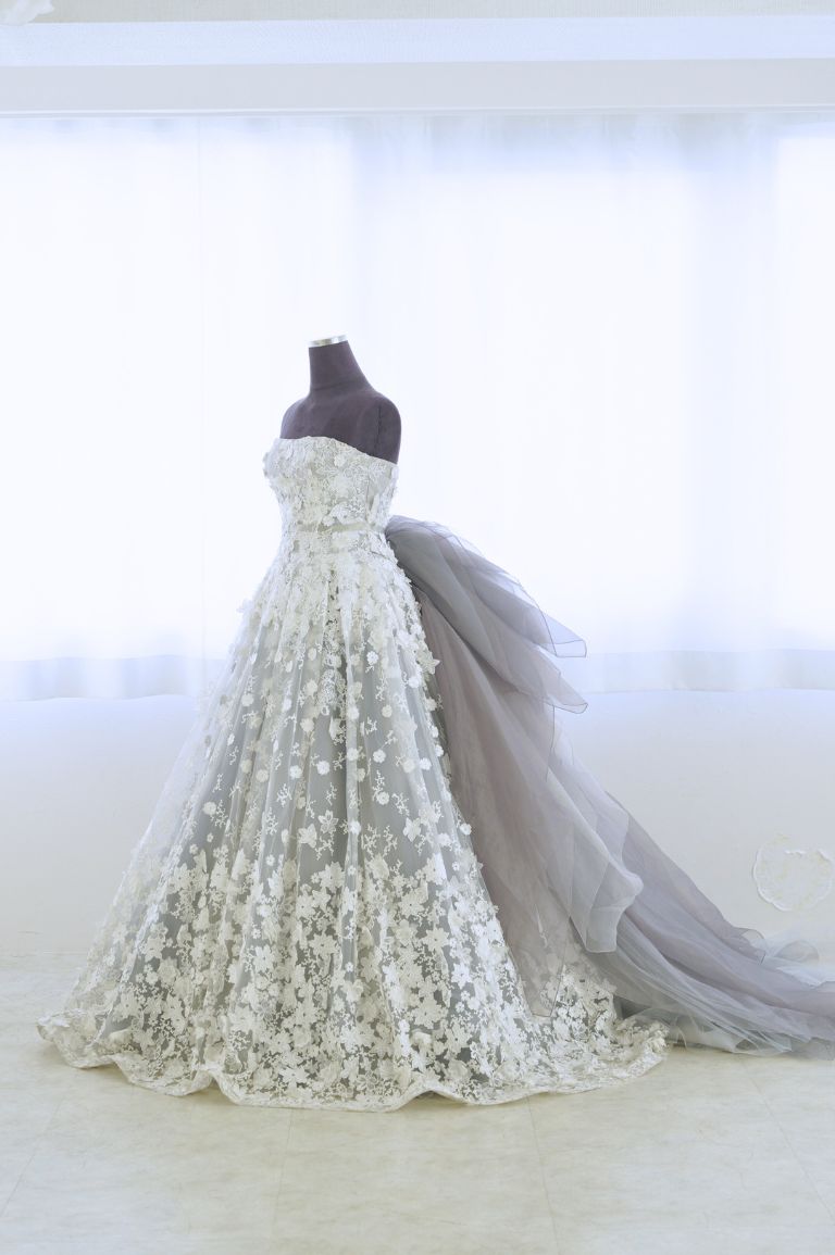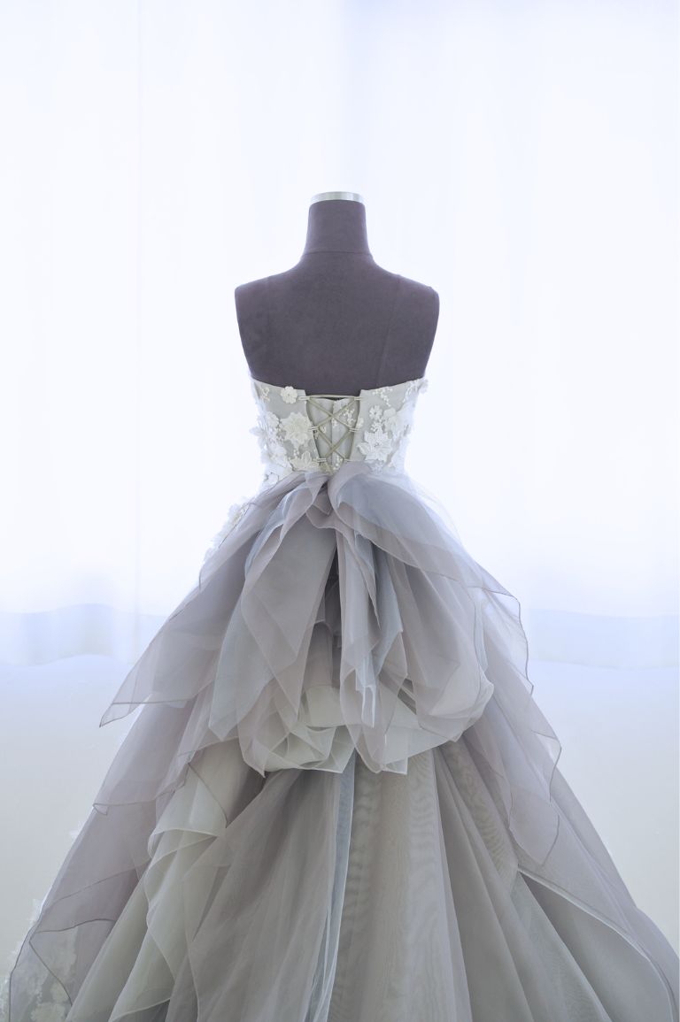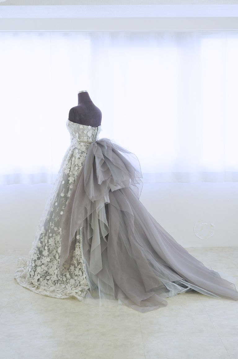 全体を小花のレースで彩った可愛らしいデザインながらも、色味が珍しいグレーで、全体的にすっきり大人な印象にもまとめられる1着。腰のリボンのボリュームが華やかで、バックスタイルまでとても美しいカラードレスです。