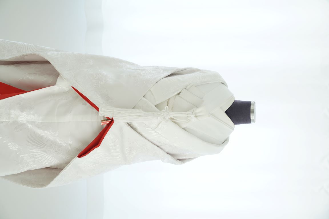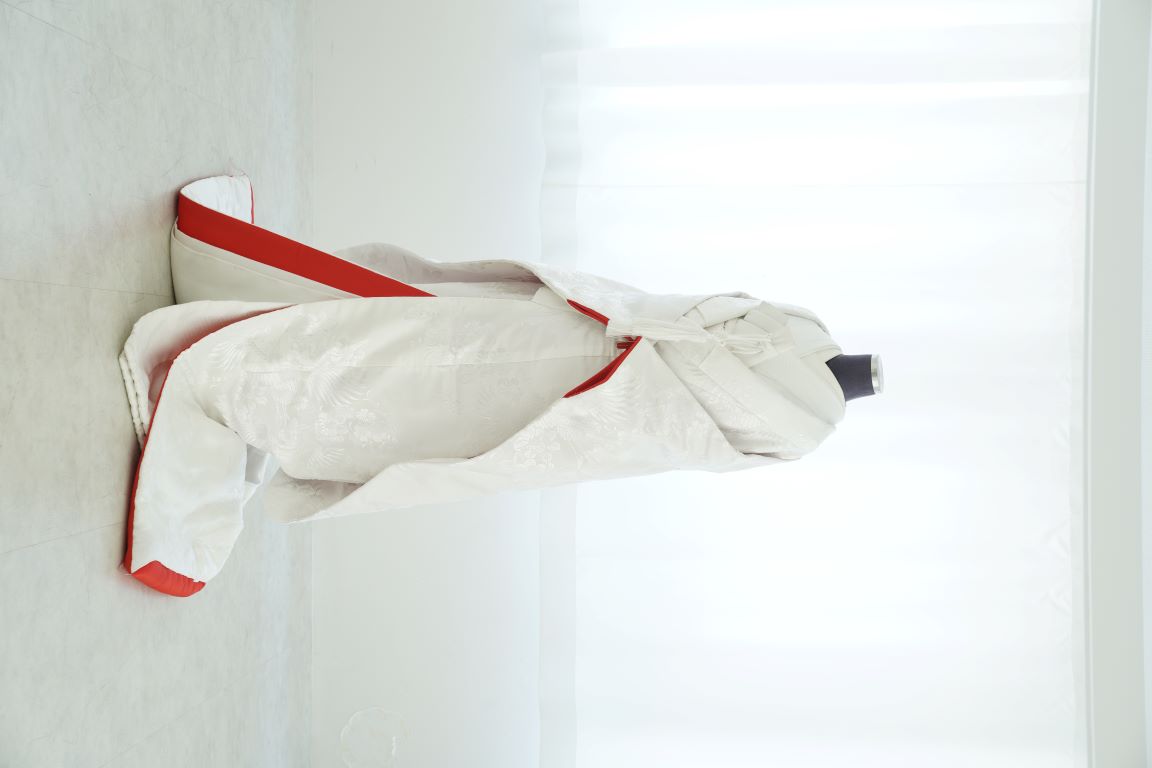 赤ふきの白無垢。胸元辺りはベーシックな白無垢の雰囲気で、手元と裾にかけて赤がポイントとして入るので、赤系の小物を組み合わせた白無垢コーディネートもおすすめです。