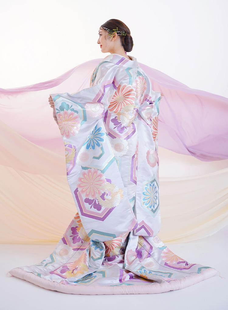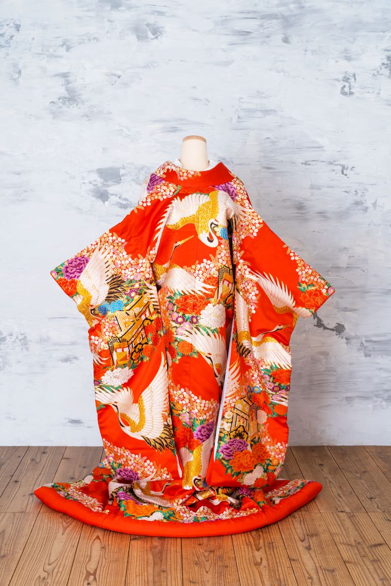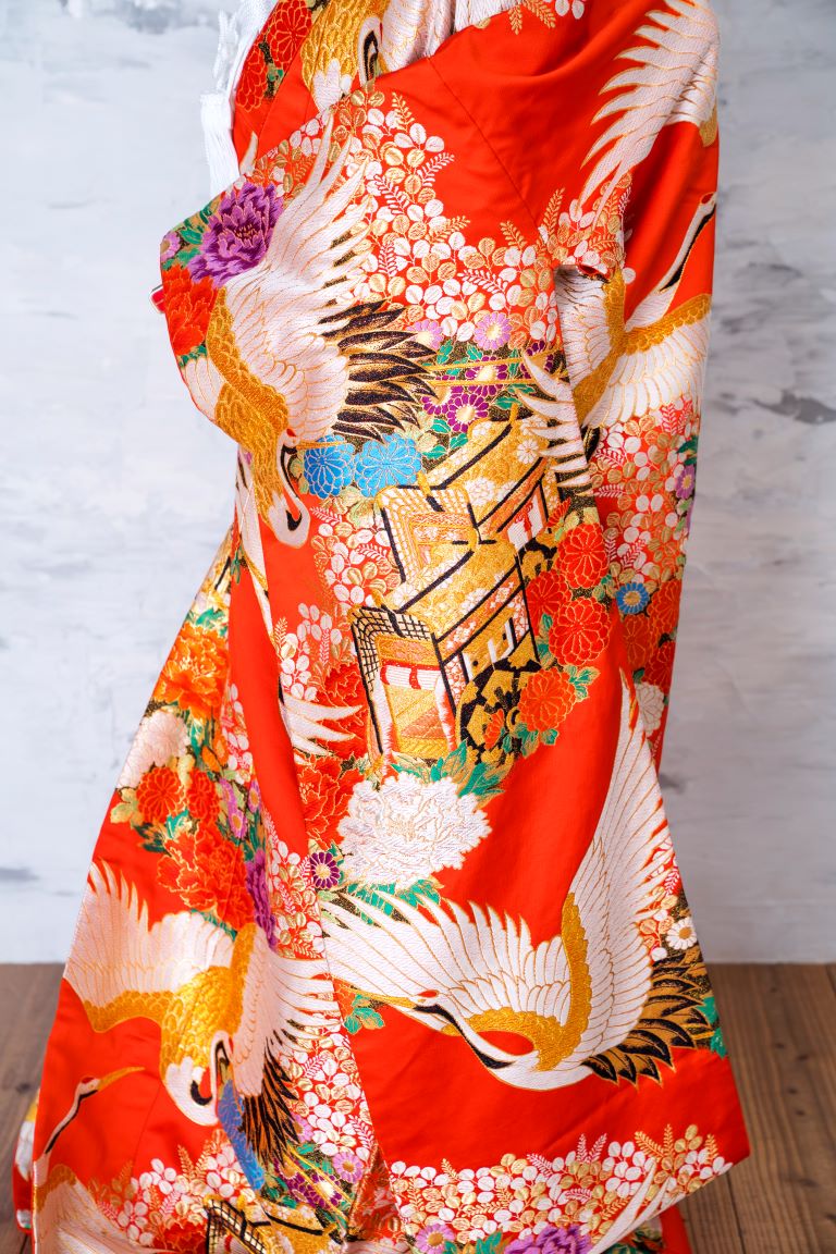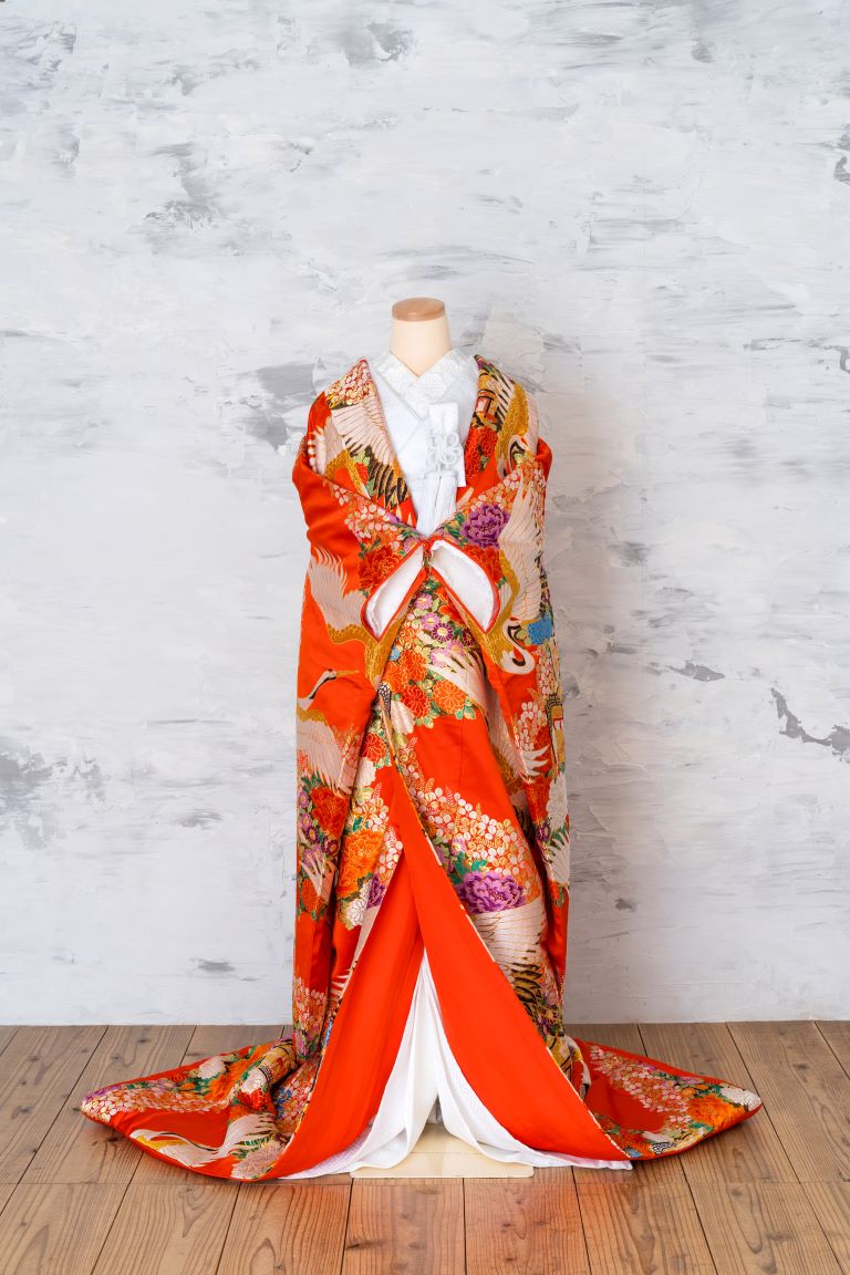 鶴や御所車などの柄が、伝統的でおめでたい印象をもたらす、婚礼衣装らしい赤の色打掛。紫や青の差し色が効いた花柄は、コーディネート次第でよりモダンな印象にもできます。