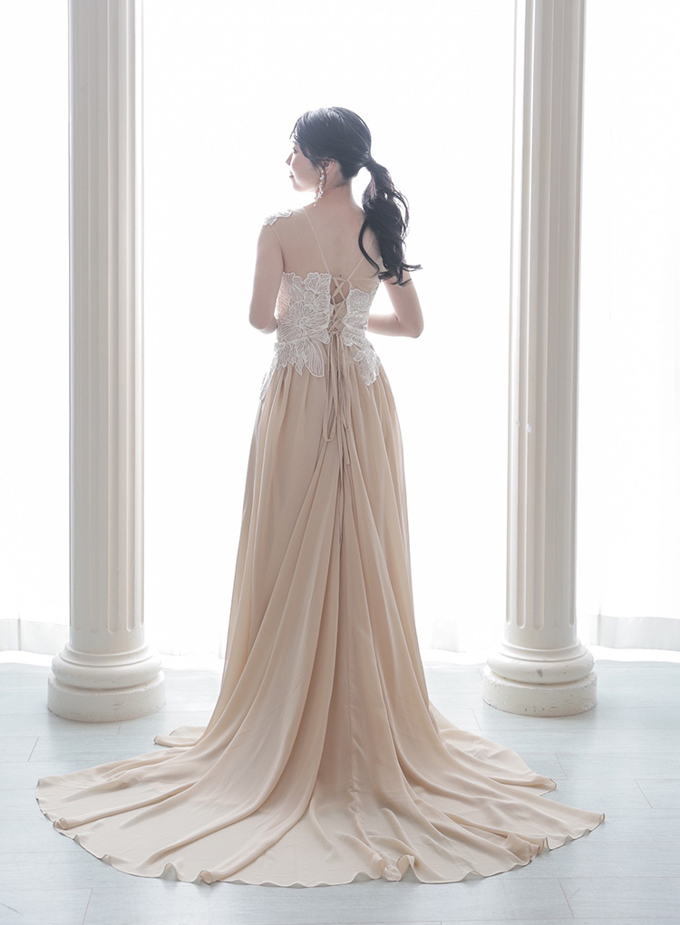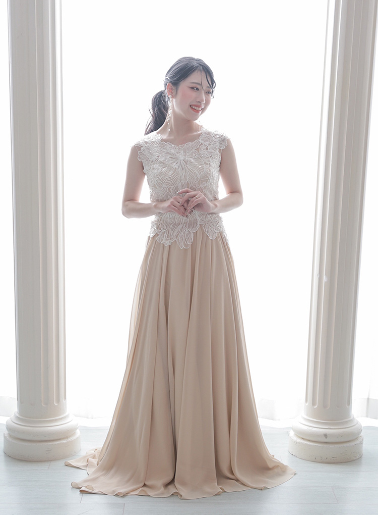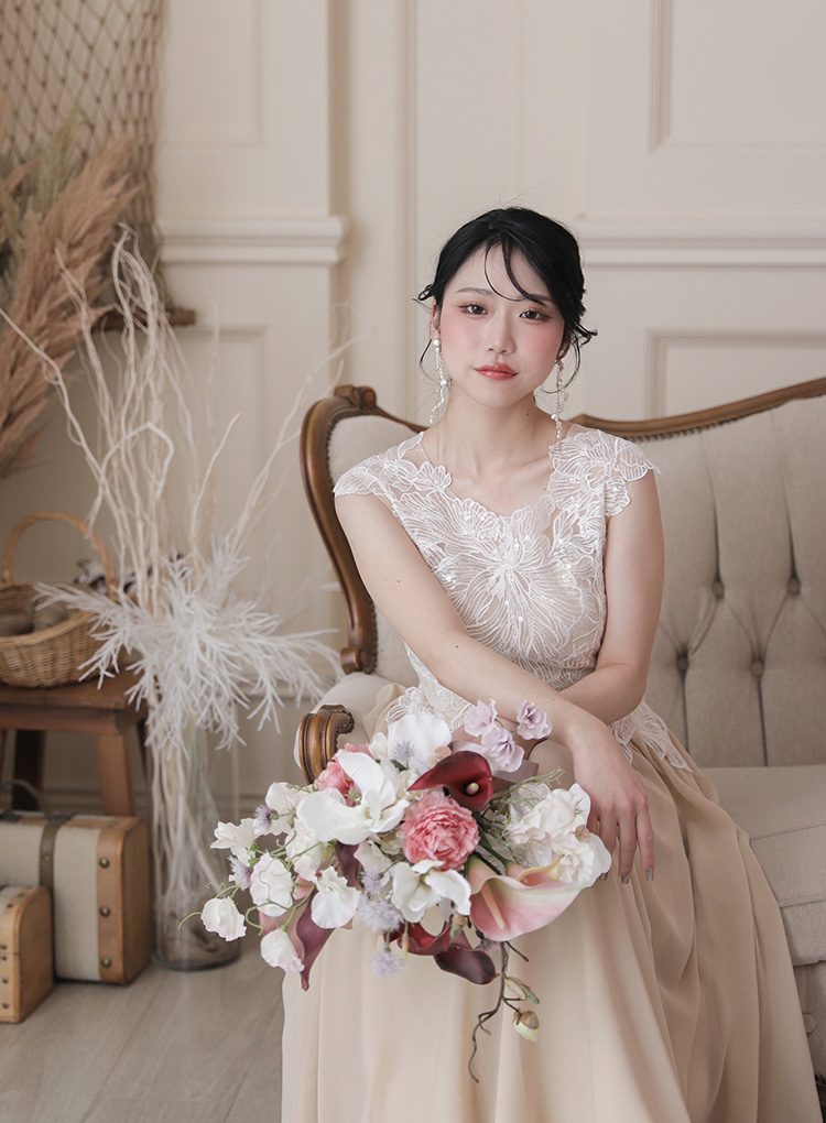 お肌に馴染みやすいベージュ系のスレンダーラインのカラードレス。花のレースが印象的なトップスと、とろみのある生地感で女性らしい1着に。ボリュームのあるブーケとの相性も◎
