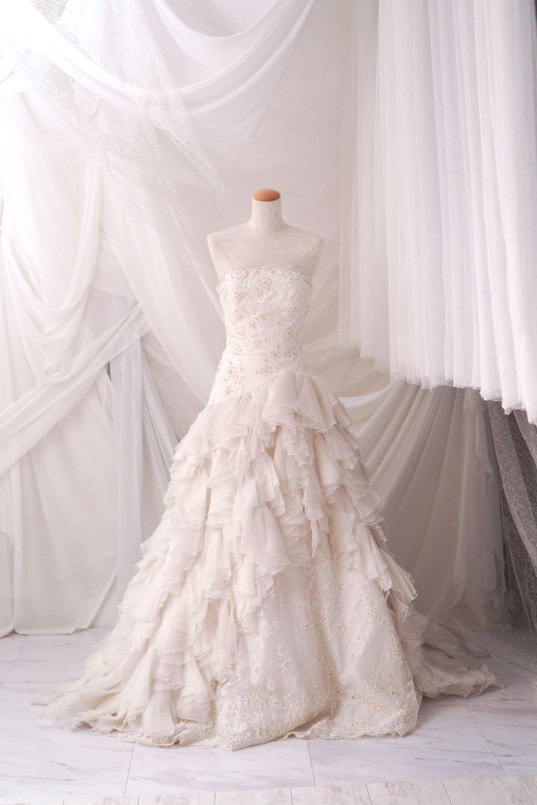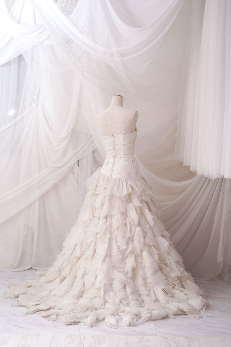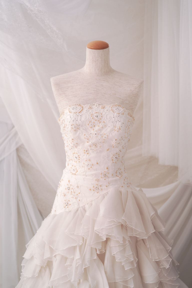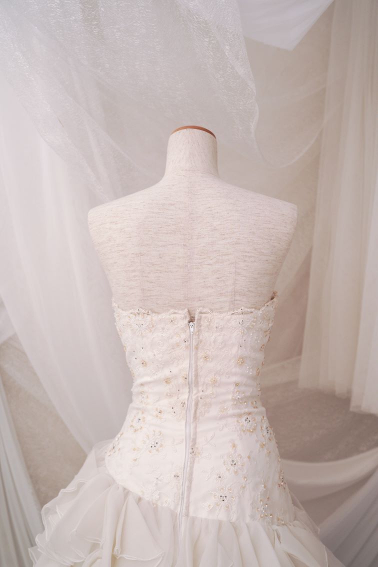 アシンメトリーのデザインと、重心を下にもってくることで、くびれが強調されスタイルアップが狙えるようなAラインのウェディングドレス。ビーズとフリルで華やかな印象に。