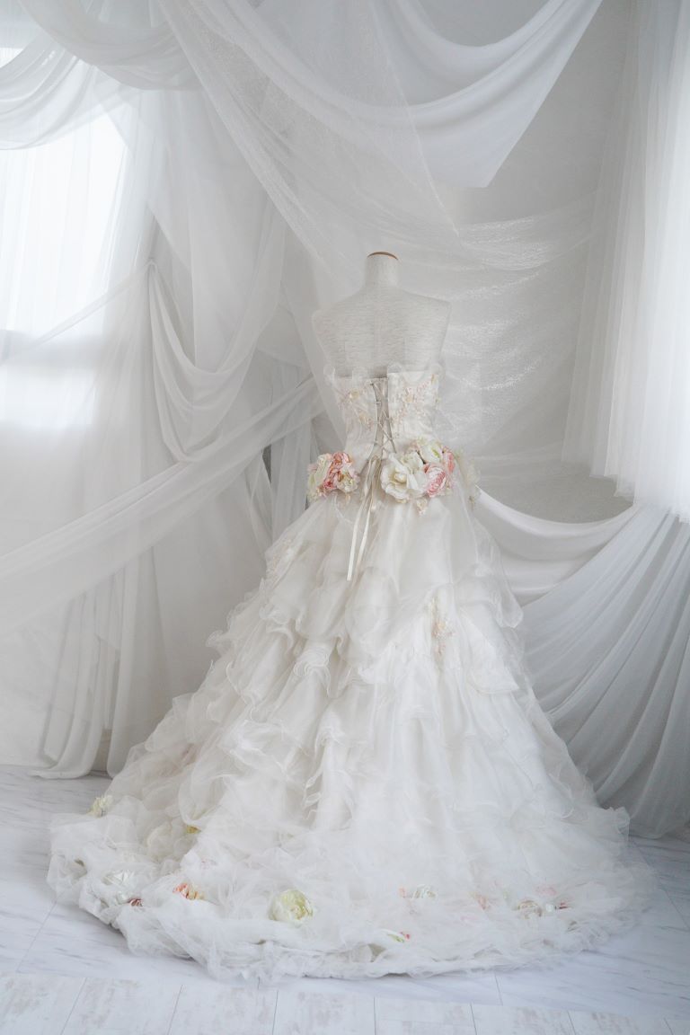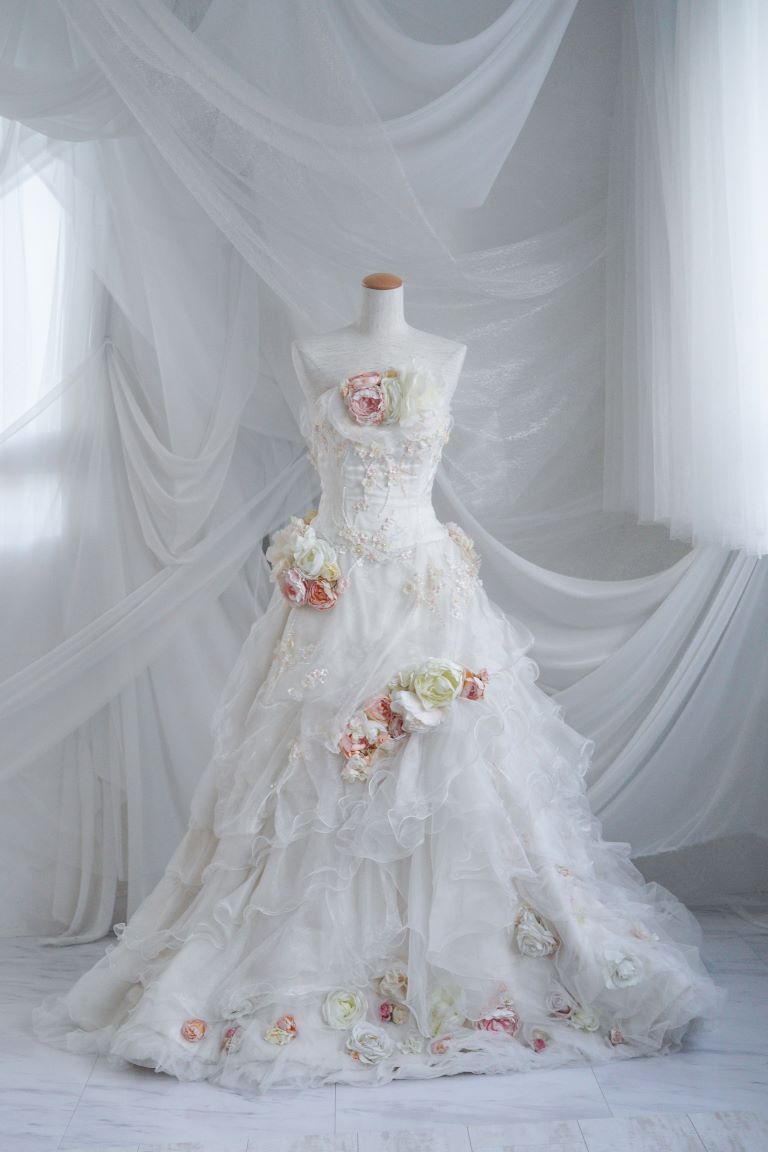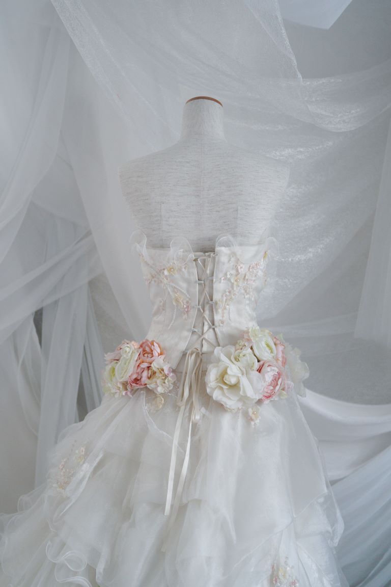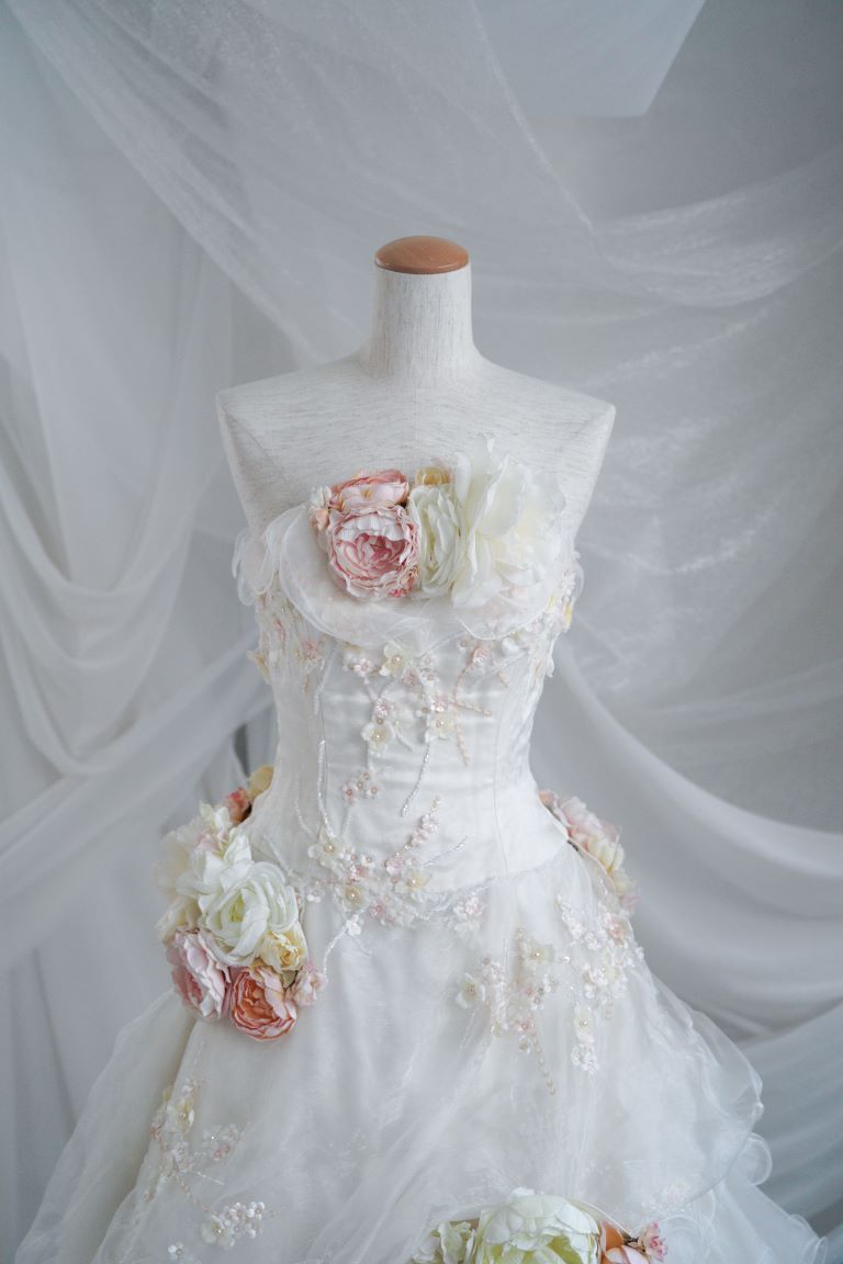可愛らしい印象を与えるパステルカラーの花のモチーフがふんだんにちりばめられた、とても華やかなウェディングドレスです。全体はAラインですっきり見えます。花のモチーフでカバーされるので、胸元にボリュームが欲しい方にもおすすめです。