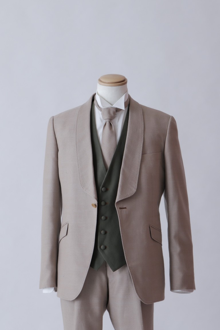 襟元のパイピングとベストの締めカラーがポイントになります。