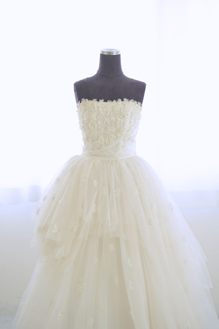 プレ花嫁から絶大な人気のKIYOKO HATA(キヨコハタ)プロデュース、MIGLIORAREのウェディングドレス。真っ白な小花がドレス全体に施され、軽やかで柔らかい生地が何段にも重なったスカートが、可愛らしい印象を与えてくれます。上品にも、可愛らしくも、カジュアルなイメージでも着ていただける1着です。
