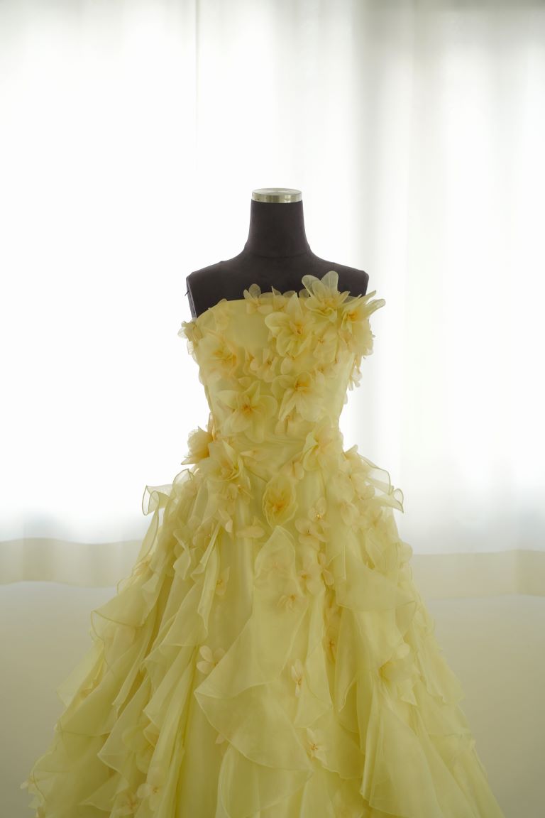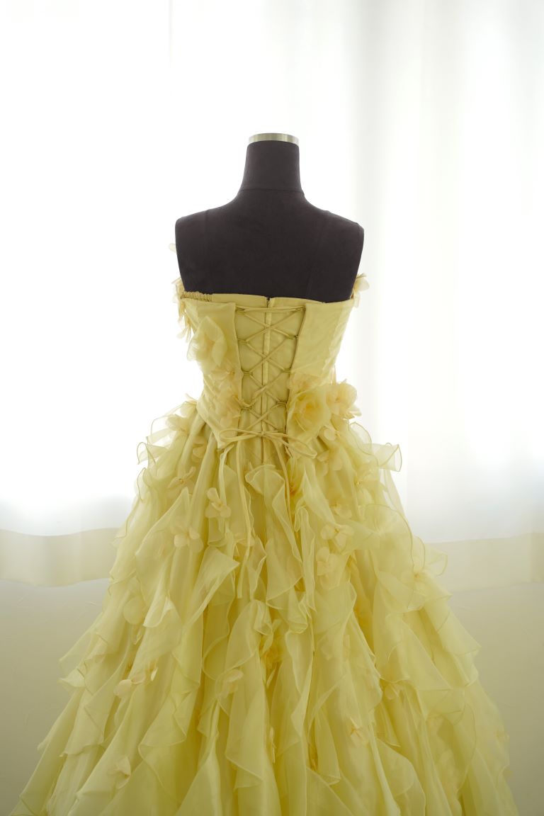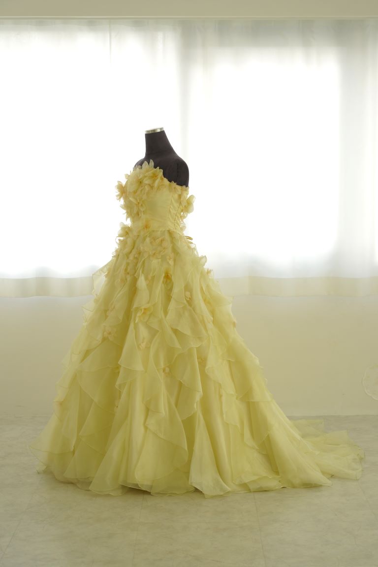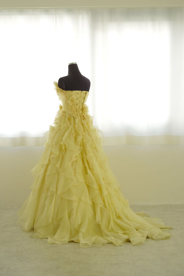 たっぷりフリルで彩られた、レモンイエローのカラードレス。小花のコサージュがちりばめられ、可憐で可愛らしい印象を与えてくれます。フリルは多めですが、ドレスシルエットがAラインなので、全体的にすっきり見える着やせ効果が期待できる1着です。