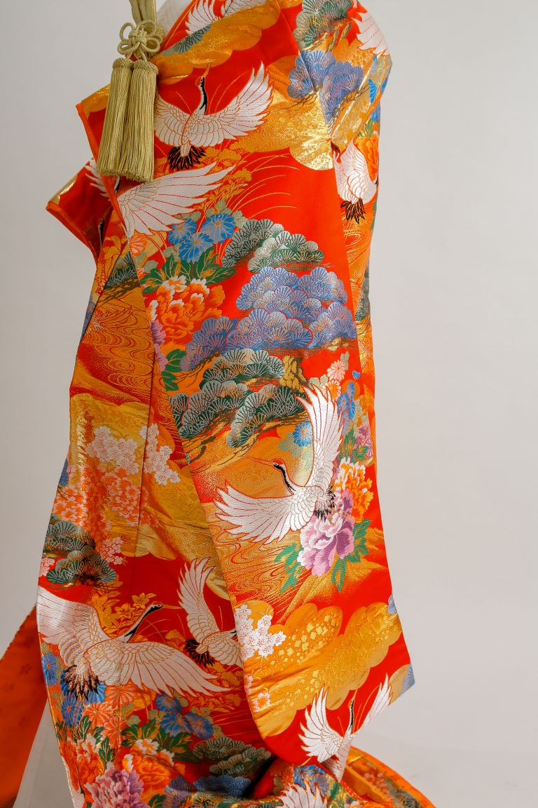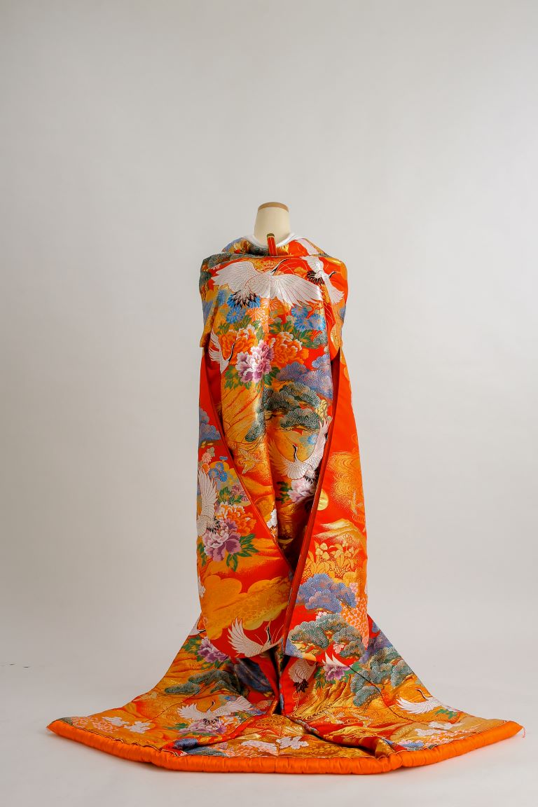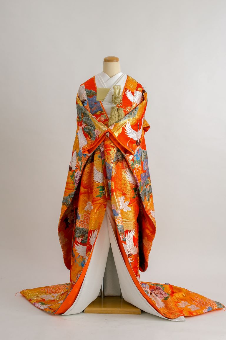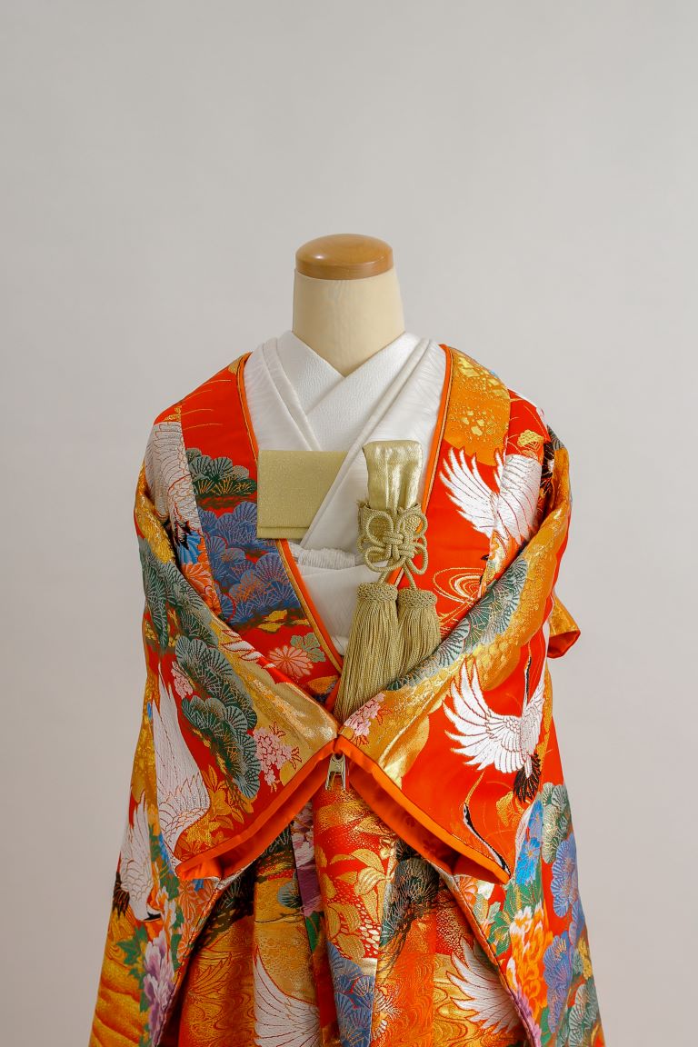 鶴や松や牡丹が描かれた、ベーシックな朱色の色打掛。全体に入っているゴールドの模様が婚礼衣装らしい豪華さを演出してくれます。お顔周りが華やかになるよう、重ね仕立てになっているのがポイント。