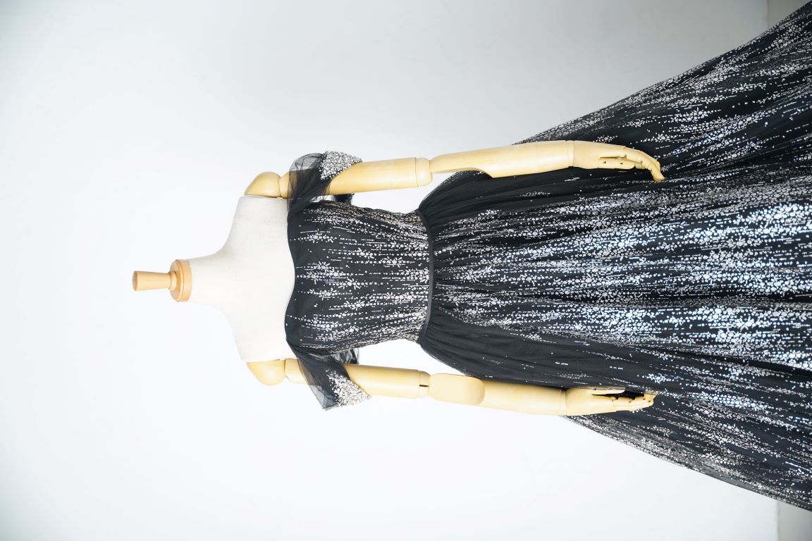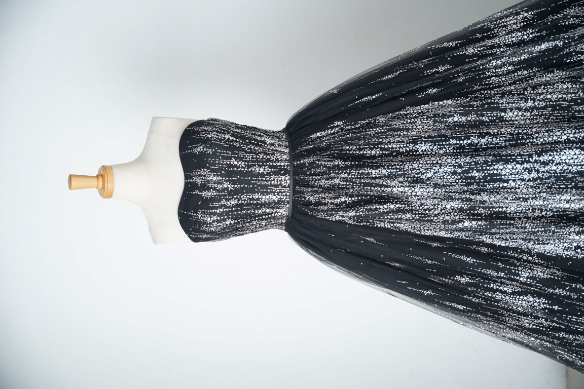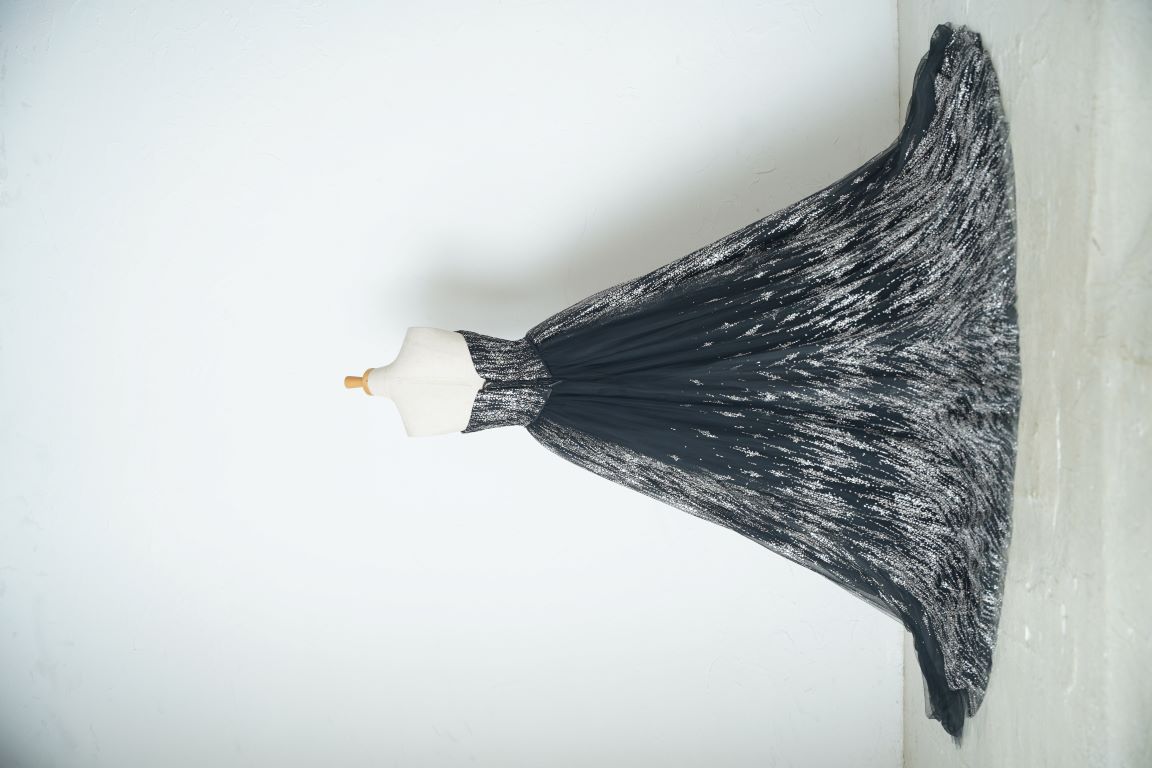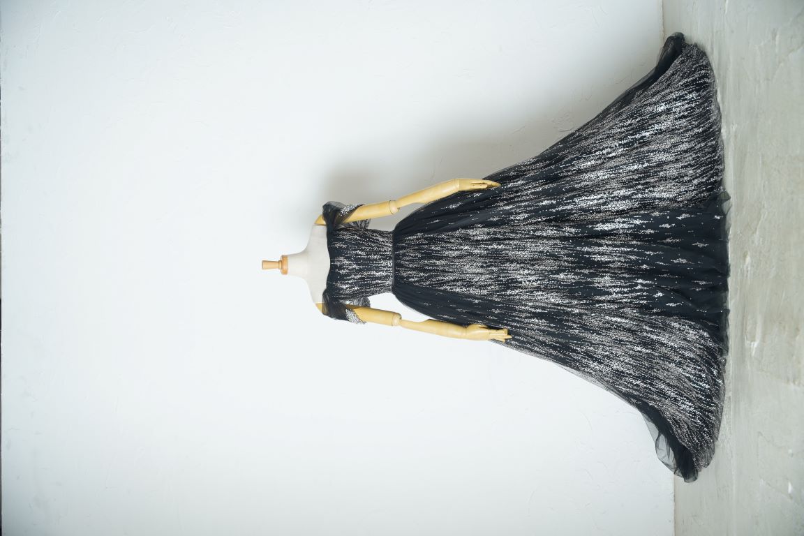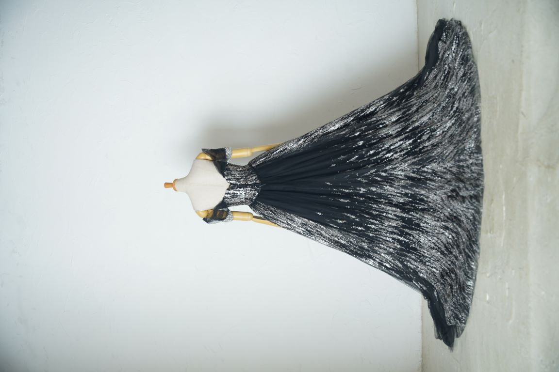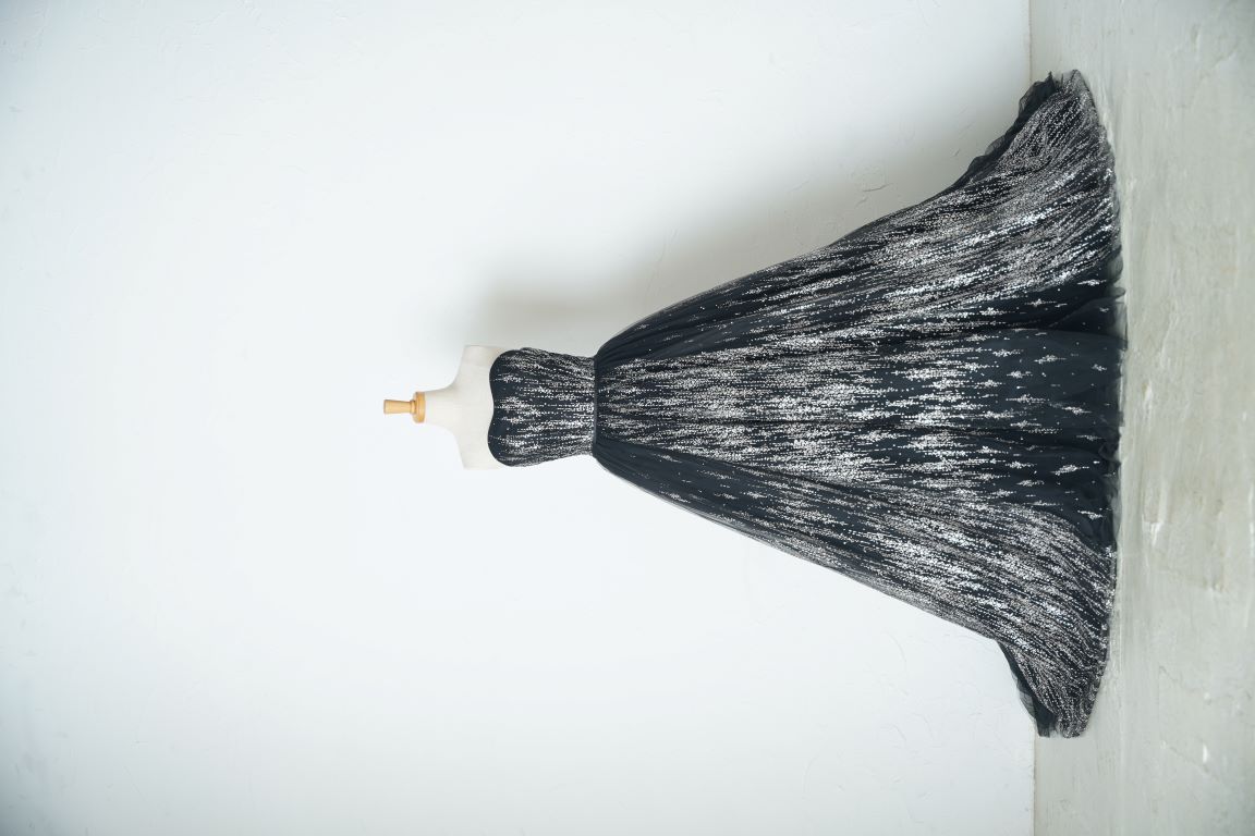 人気のブラックのグリッタードレスは、縦に流れるようなラインで細見え効果抜群。付け袖ありで柔らかい印象で着こなしてもいいし、付け袖を外してスタイリッシュな印象にまとめても良し。