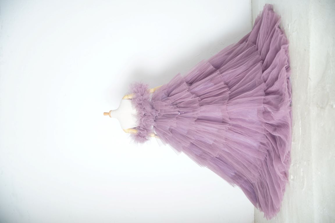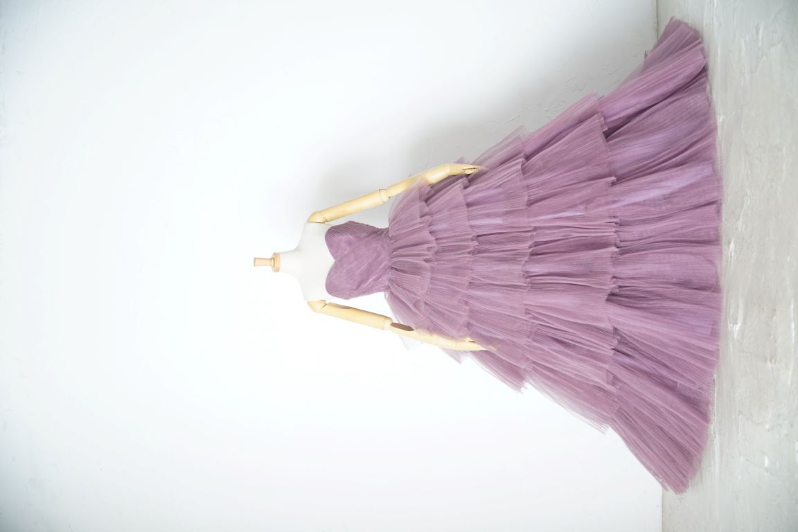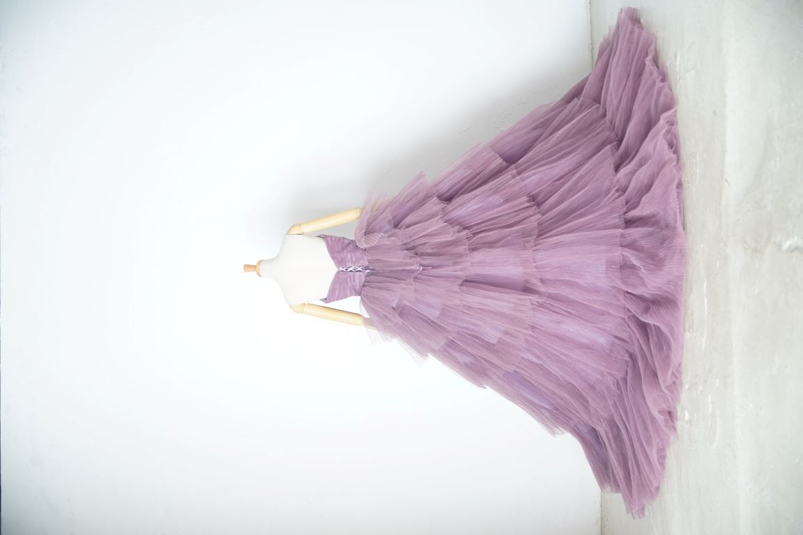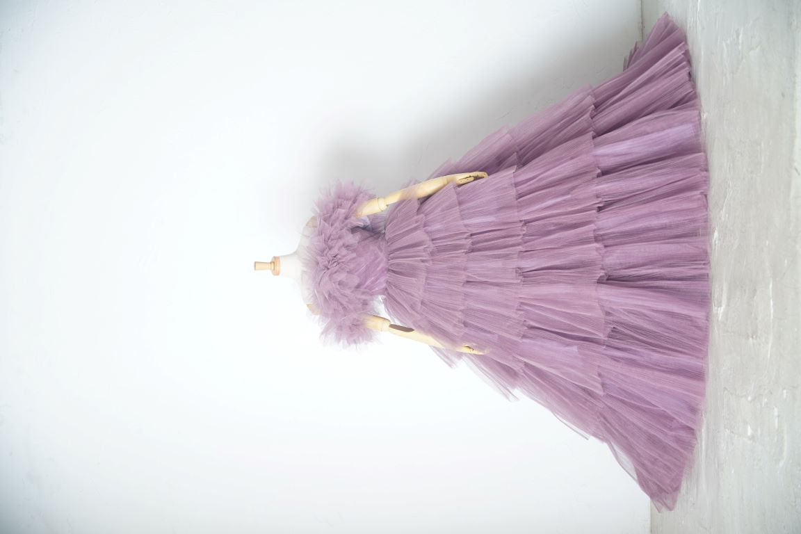 ピンク寄りのパープルのボリューミーなドレスは、アレンジ自在の付け袖で印象ががらりと変わるので、色々な表情が楽しめます。