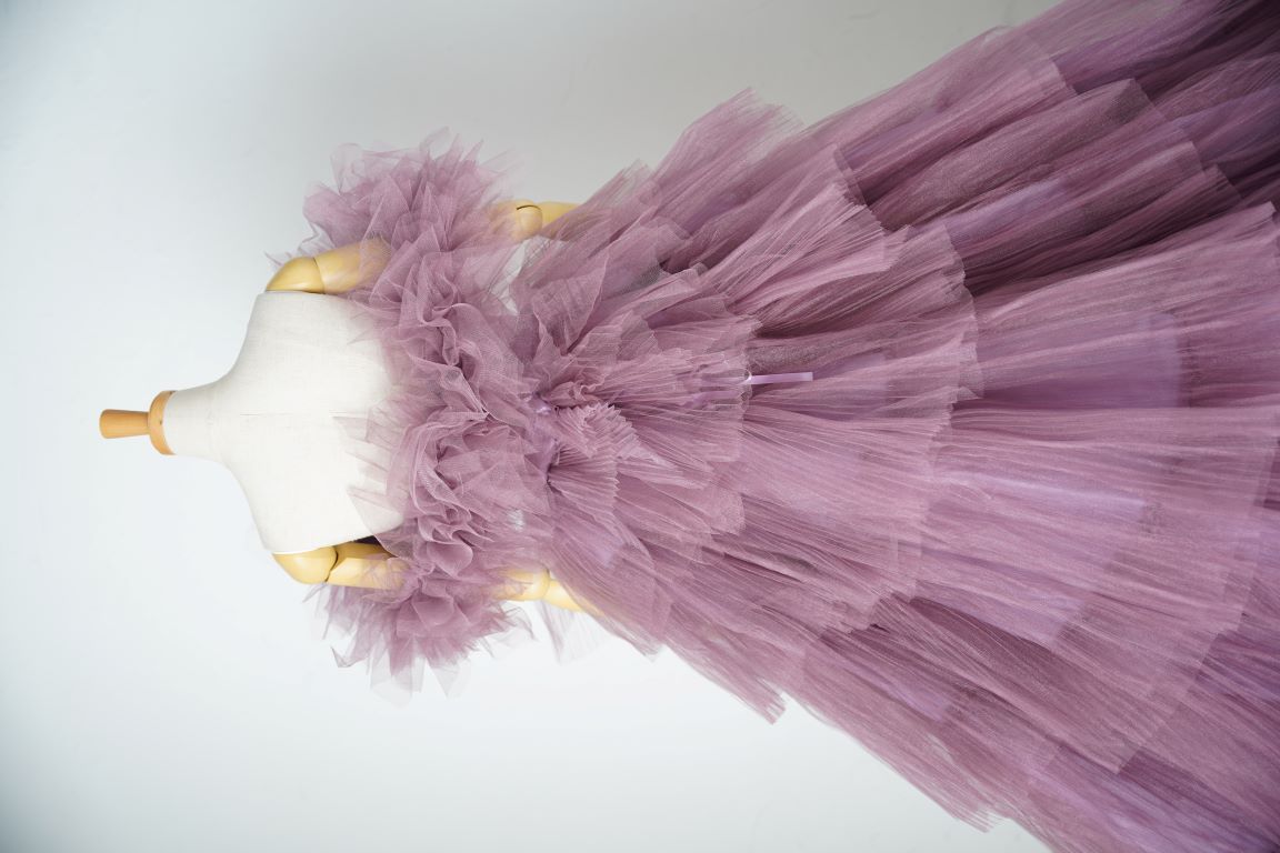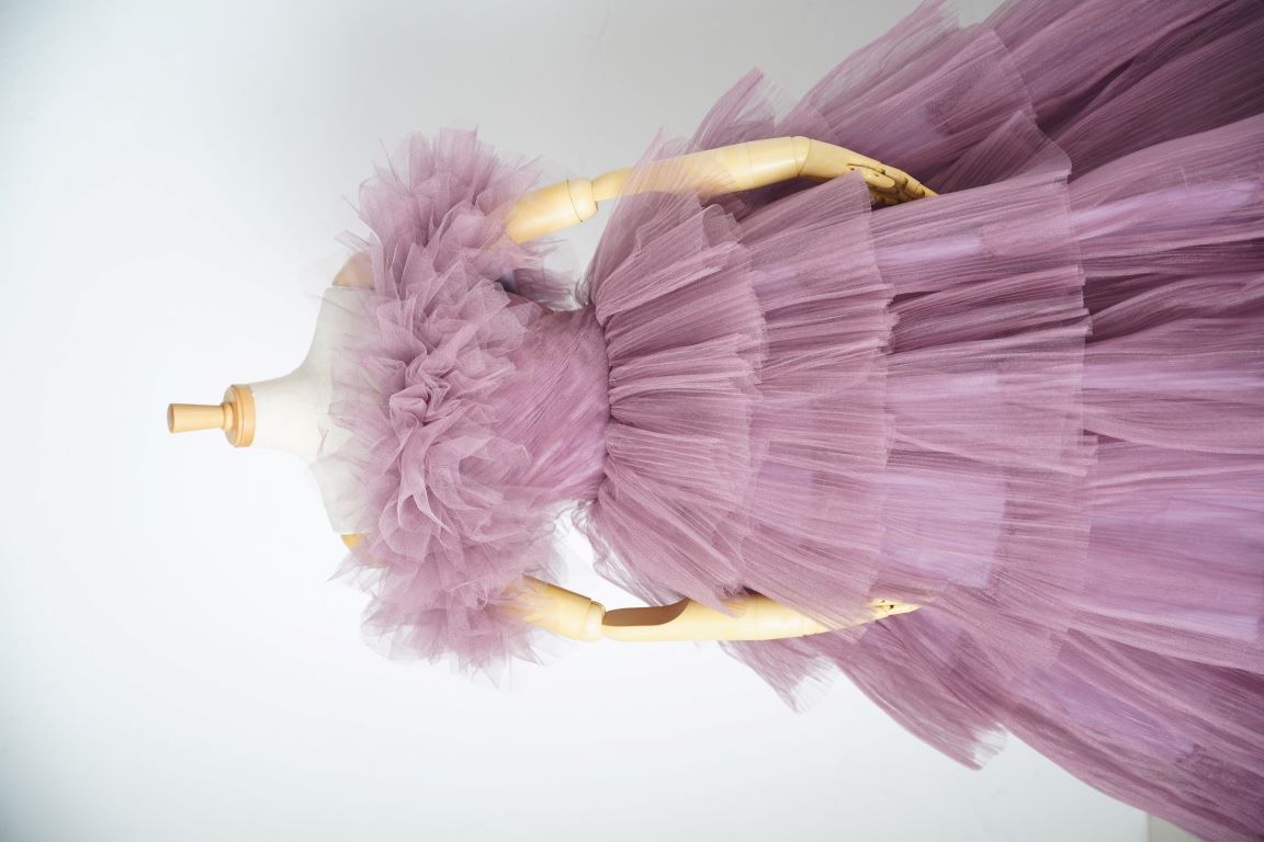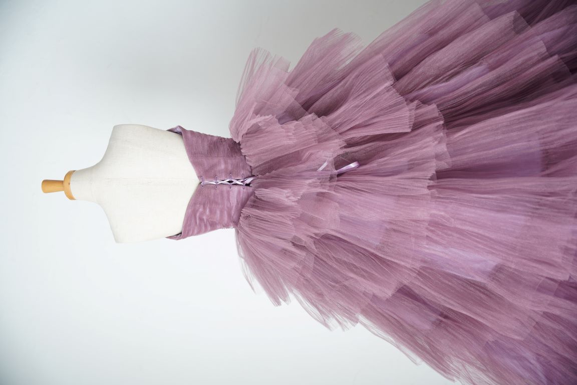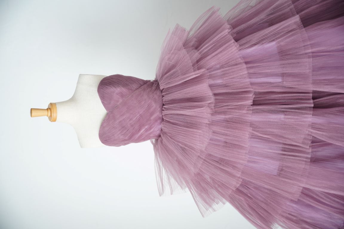 ピンク寄りのパープルのボリューミーなドレスは、アレンジ自在の付け袖で印象ががらりと変わるので、色々な表情が楽しめます。