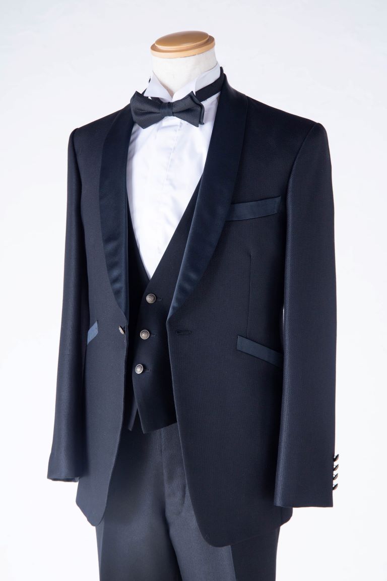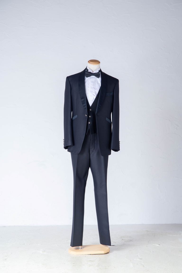 シンプルでスタンダードな黒のタキシード。何にでも合わせやすいからこそ、黒シャツを合わせてクールな印象にまとめたり、色々なアレンジも可能。