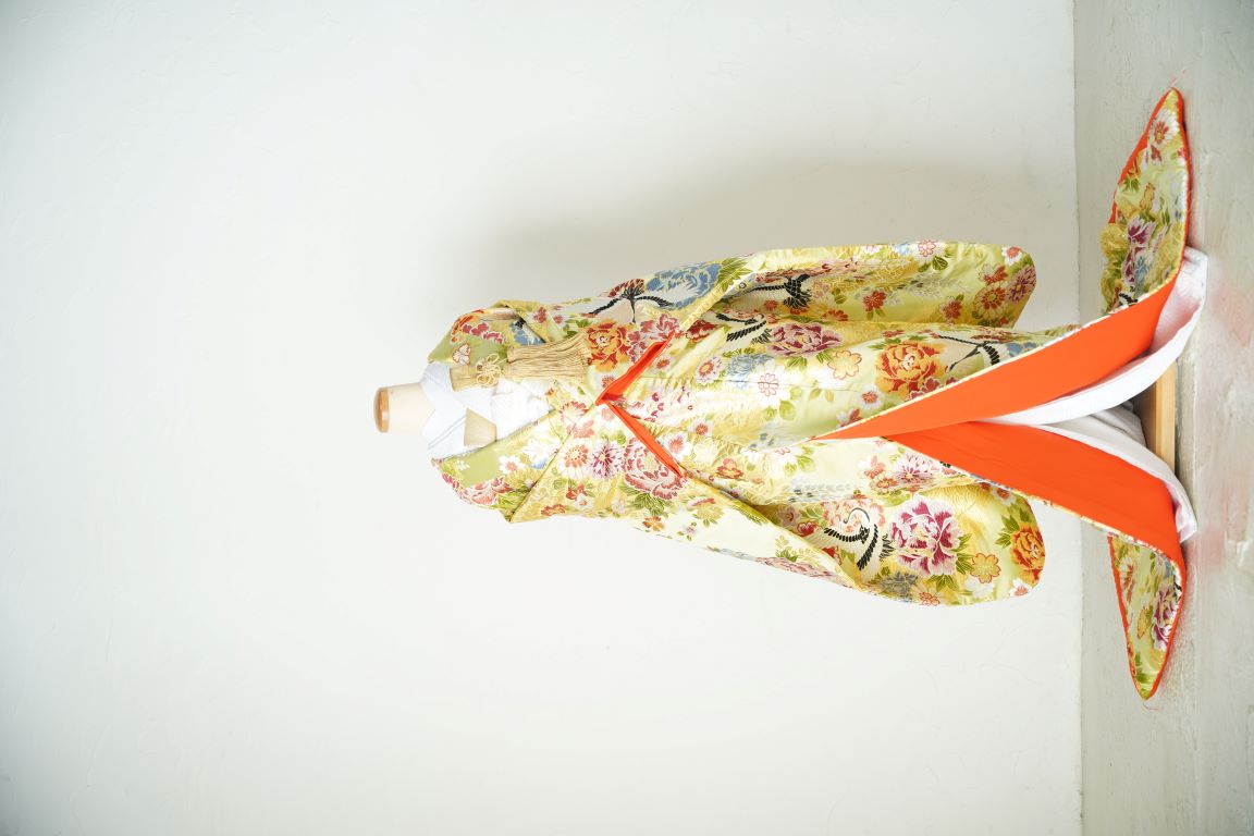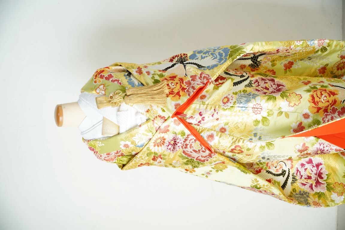 淡い黄緑色が美しい、上品かつ華やかな色打掛。黄み寄りの色味なので、イエローベースの方にも似合いやすいです。鶴や牡丹、桜などが描かれ、ロケーション撮影でもどんな景観にもなじみやすい1着。