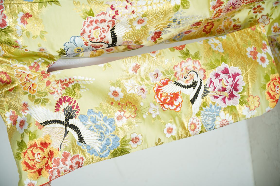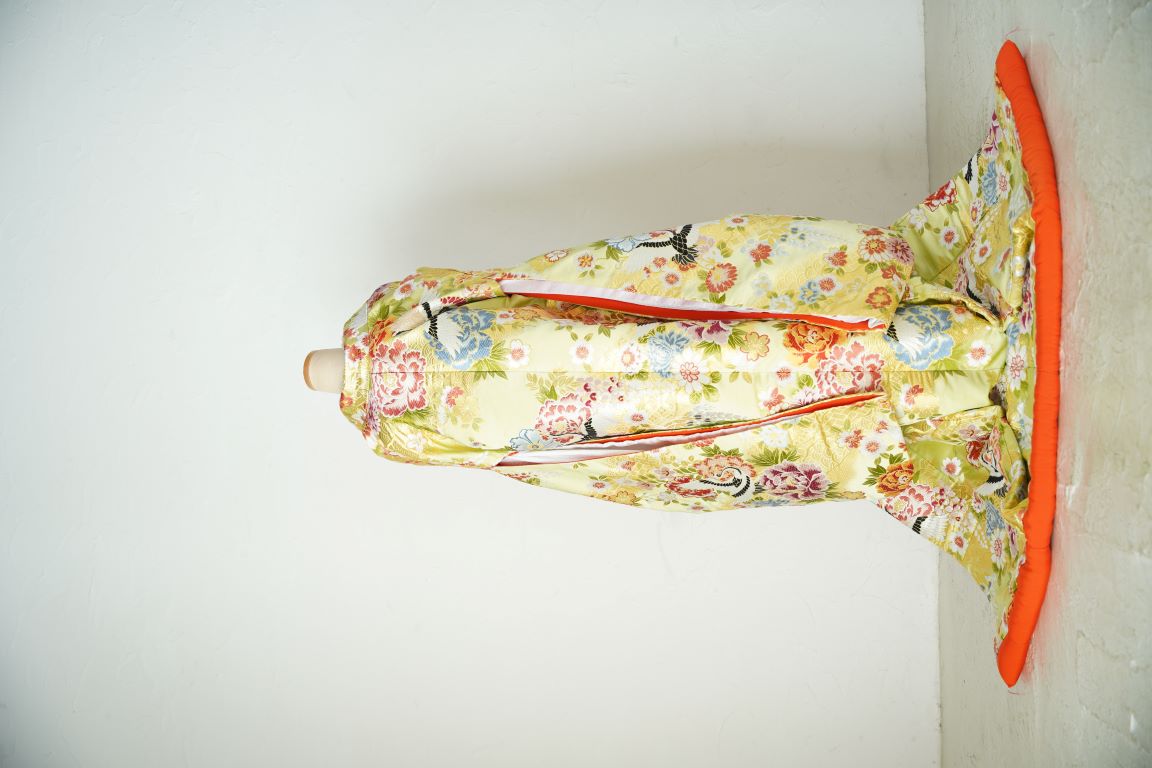 目の覚めるようなぱきっとした黄色が明るい雰囲気を作り出す古典的な色打掛。全体的にビビッドな色で構成された花の刺繍がふんだんに施されており、とても華やかな1着です。