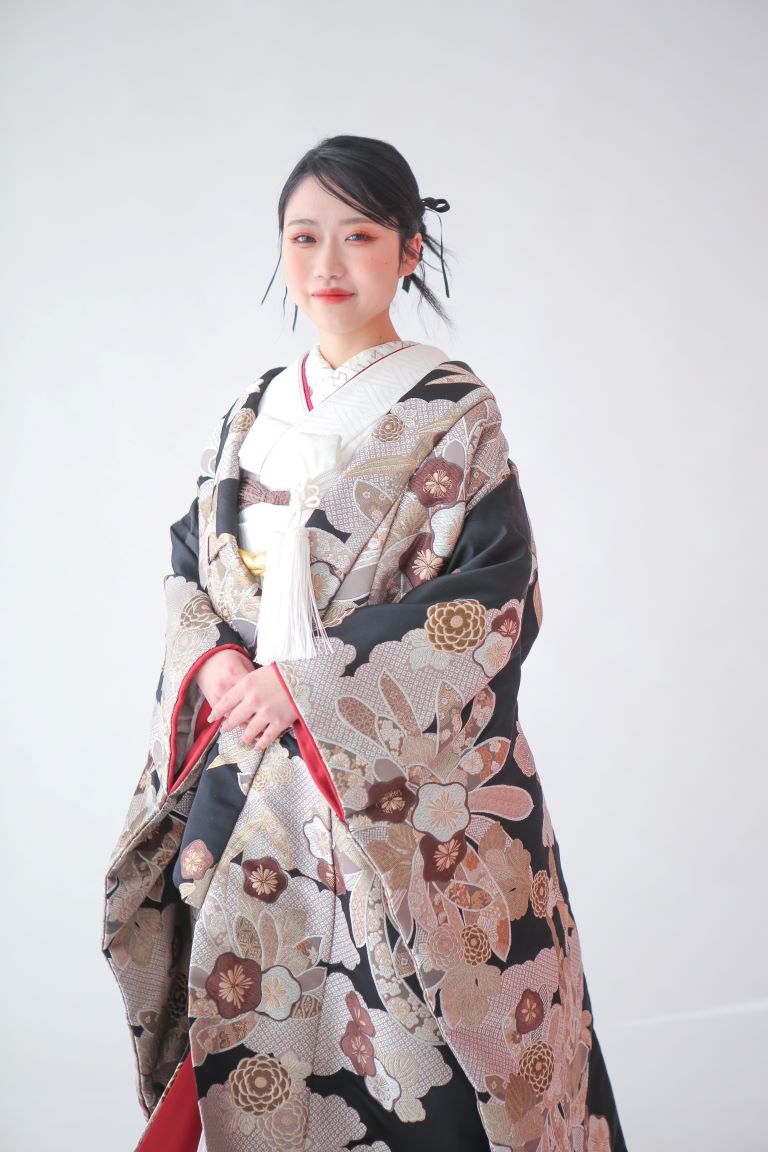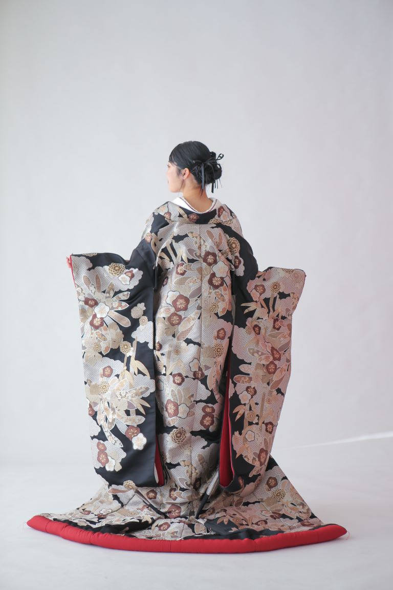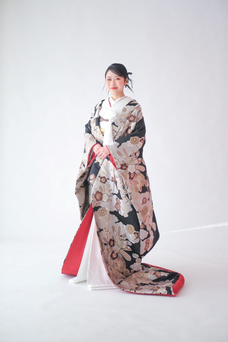黒地にあえて色味を抑えて描かれたモダンな柄が美しい色打掛。髪型もシンプルにまとめて全体的にスタイリッシュな印象に仕上げるのもおすすめです。余白を持たせた流れるような柄で、全体をすっきり見せる効果もあります。