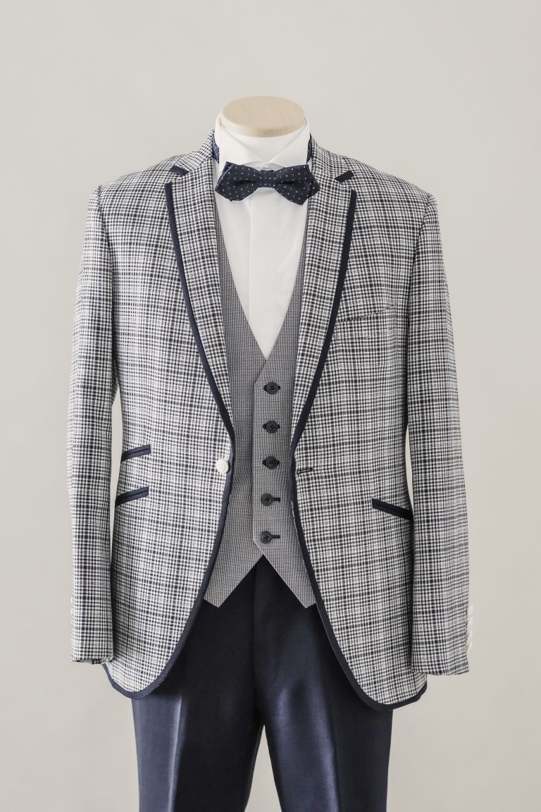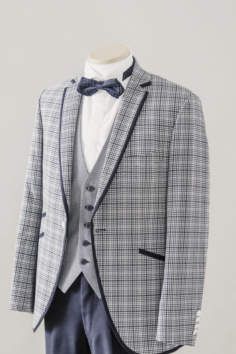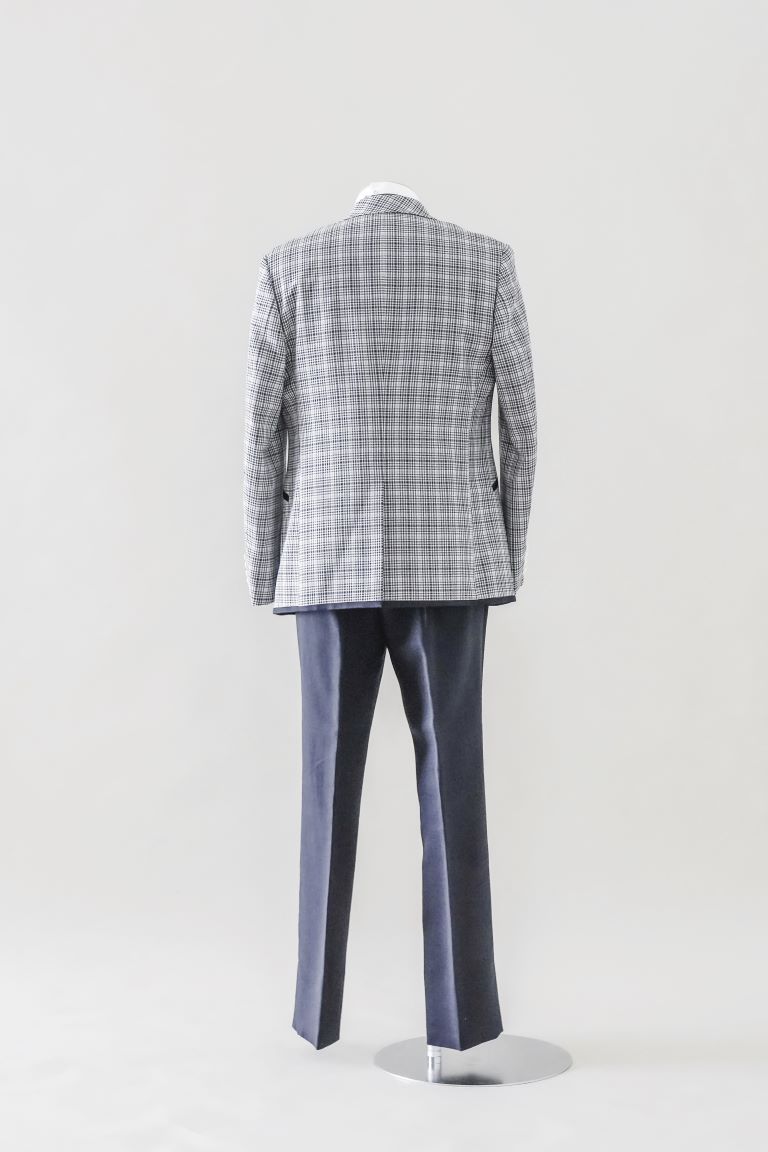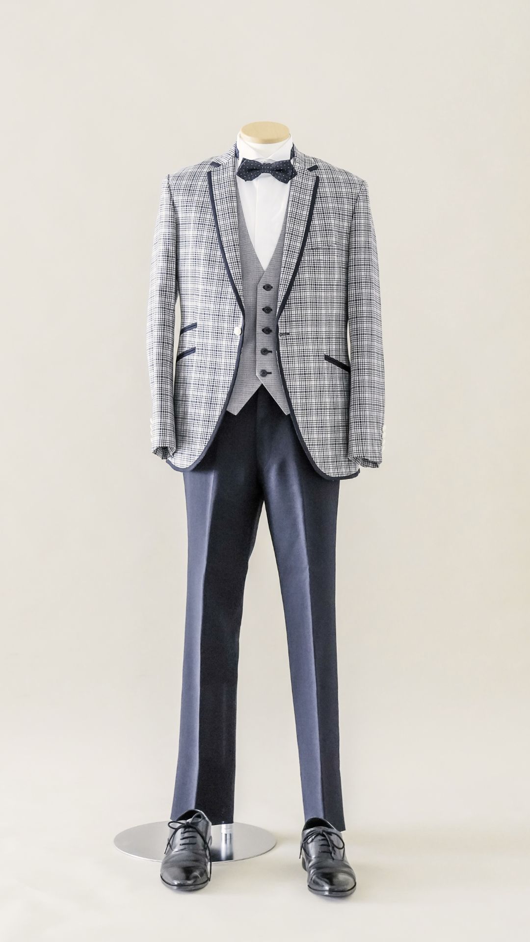 グレーのチェックに黒のパイピングが個性的なタキシード。チェックの視覚効果と黒のパンツで細見え効果も期待できます。カジュアルなドレスとの相性も◎