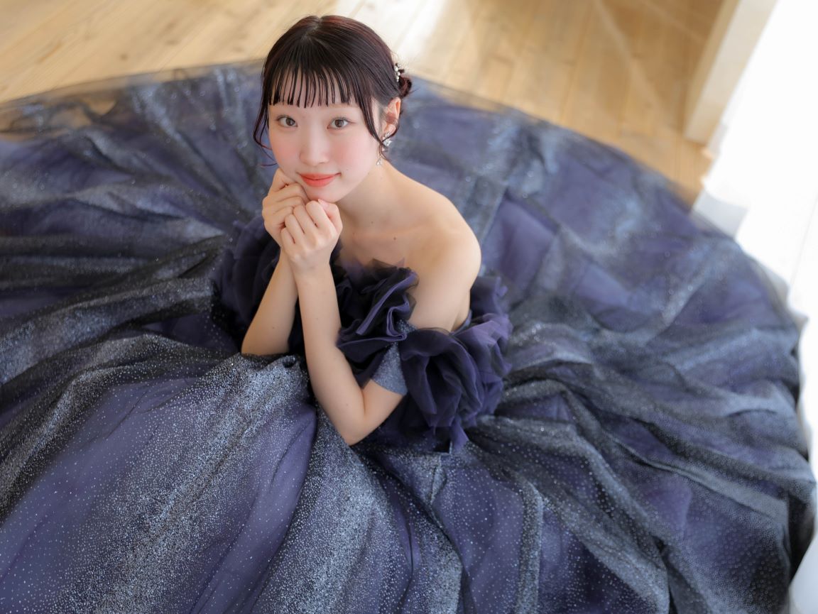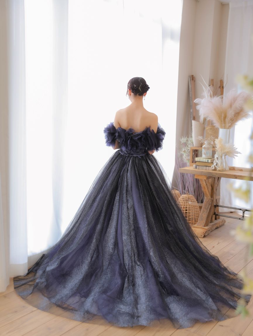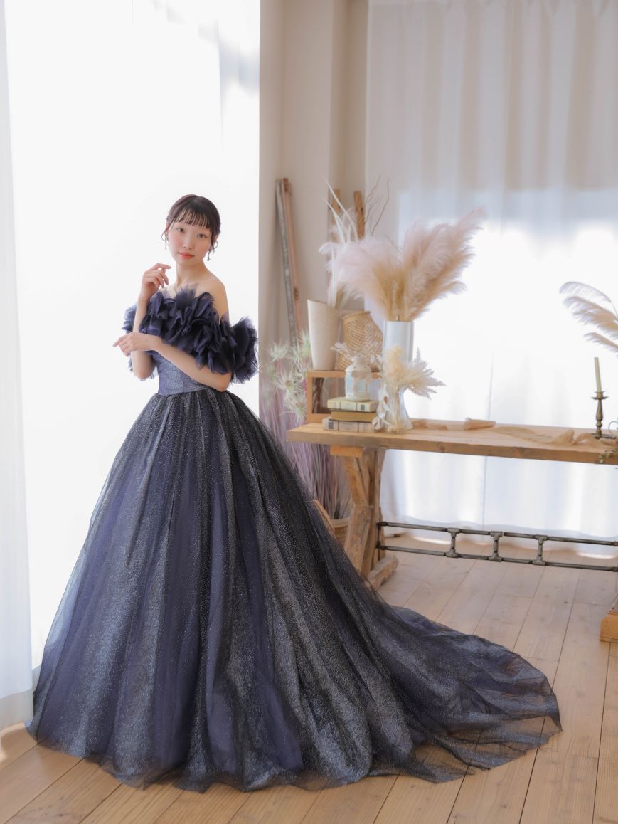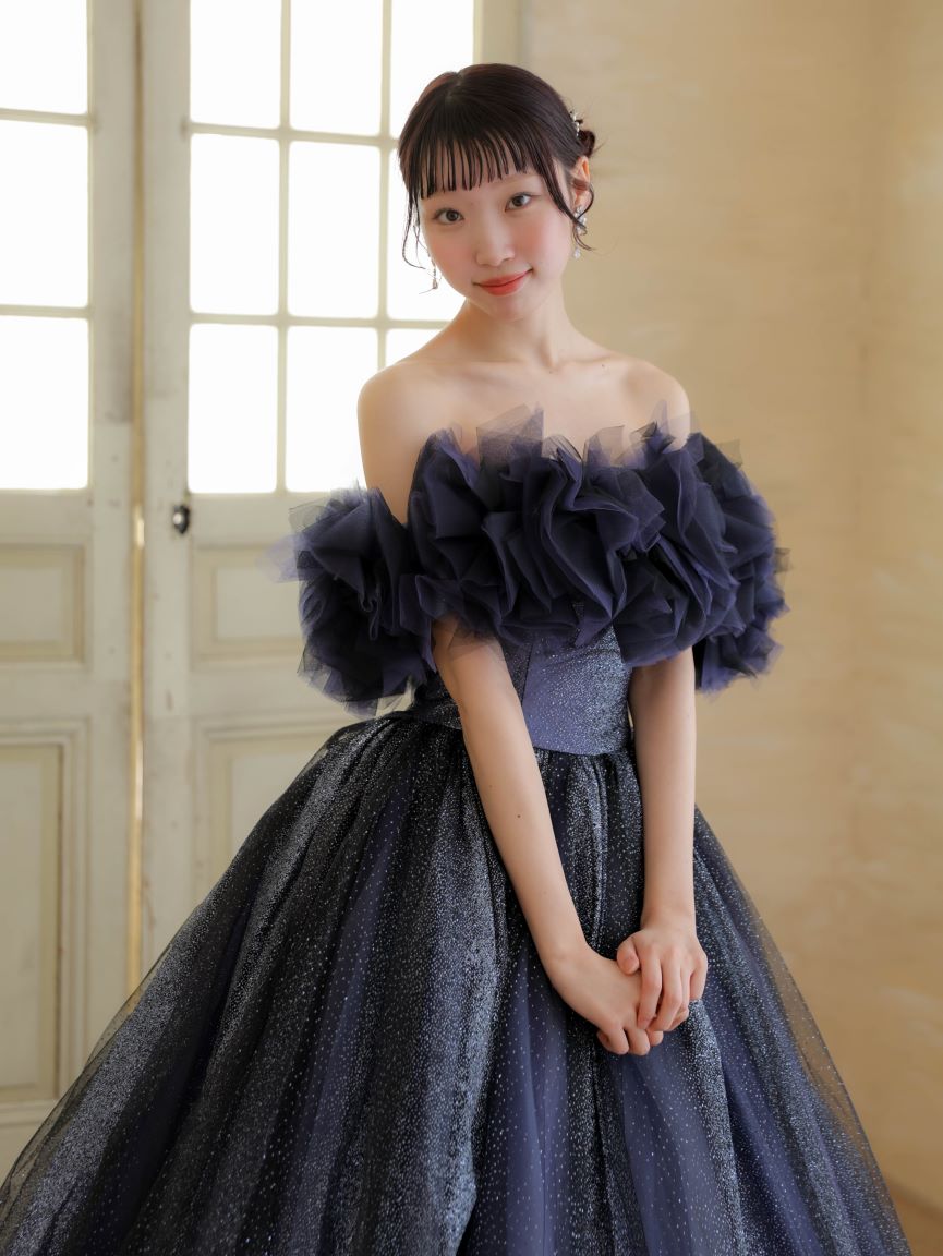 深みのあるネイビーカラーが印象的なカラードレス。ボリューミーなオフショルダーが二の腕をカバーしつつ、上半身を細くすっきりと見せてくれます。繊細なグリッターが全体にきらめき、ウエストから贅沢に広がるAラインシルエットが優雅でクラシカルな佇まいを演出。オフショルパーツを外すとシンプルなドレスとして2WAYでお楽しみいただける、洗練された大人の華やかさを叶える一着です。