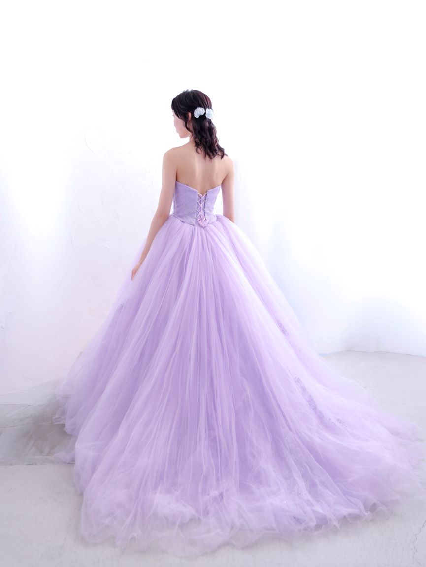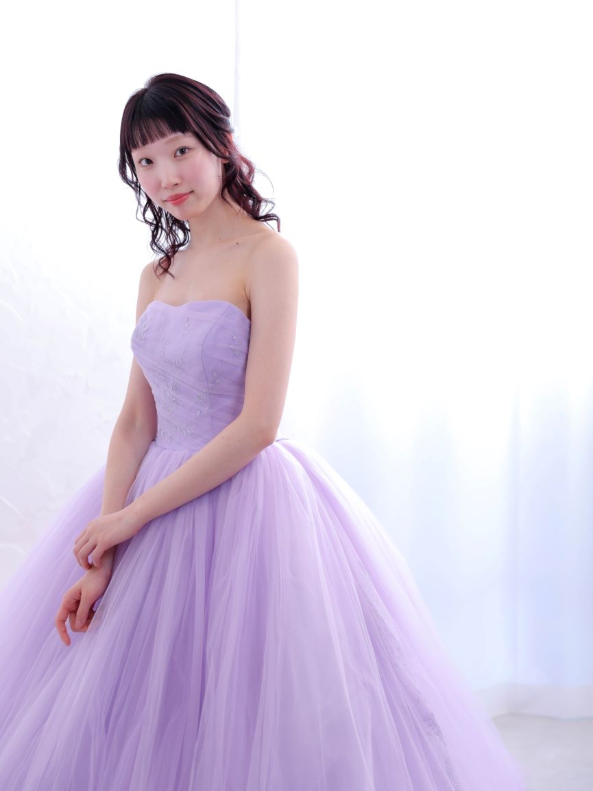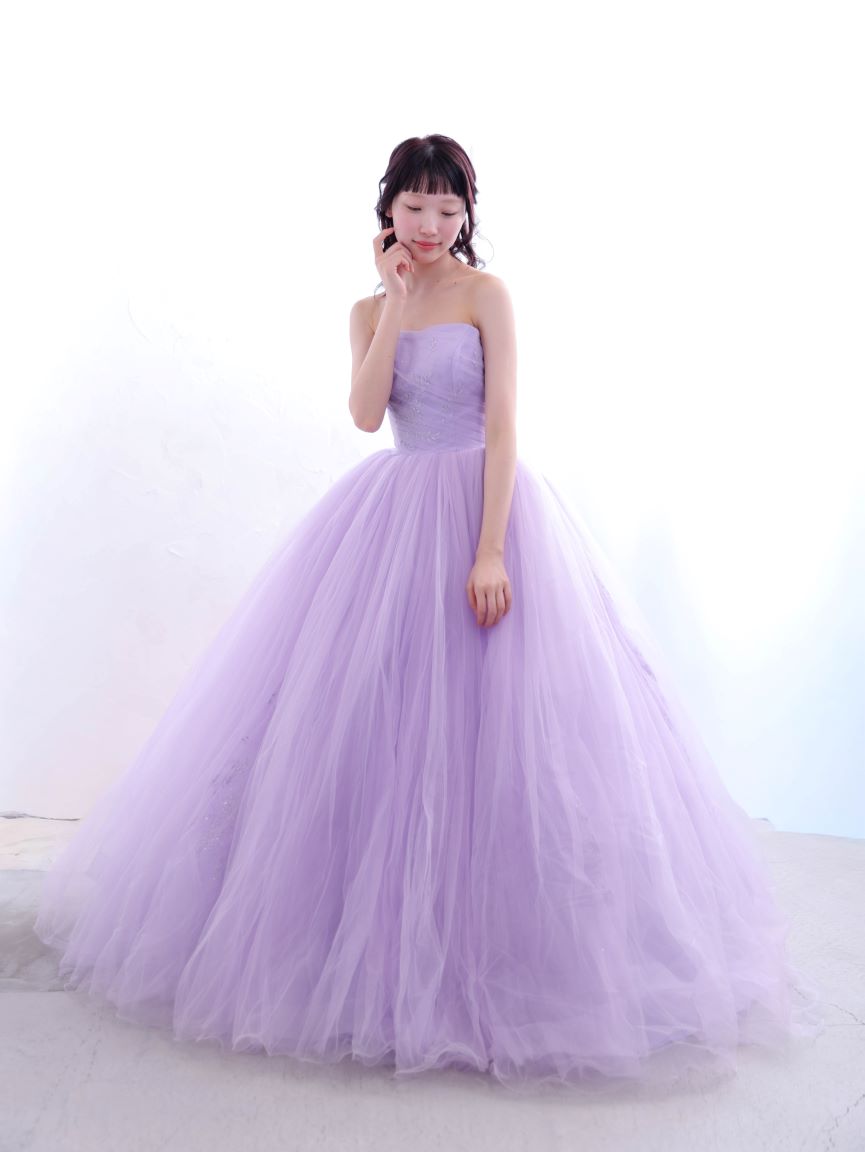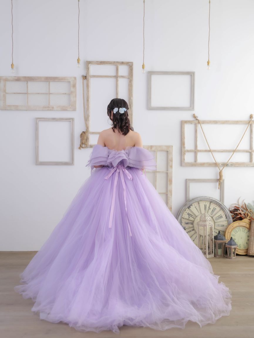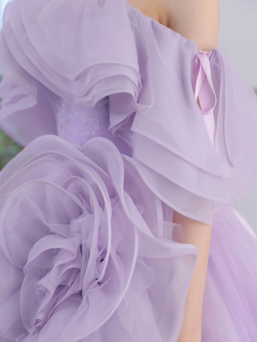 やわらかなラベンダーカラーが幻想的な雰囲気を纏うカラードレス。ボリュームたっぷりのオフショルダーフリルと、立体的にあしらわれた大きなフラワーモチーフが目を惹く華やかなデザインです。フラワーモチーフは外しても着用できる2WAY仕様。優雅でロマンティックな印象にも、可憐で透明感のある印象にも着用できる万能な1着です。
