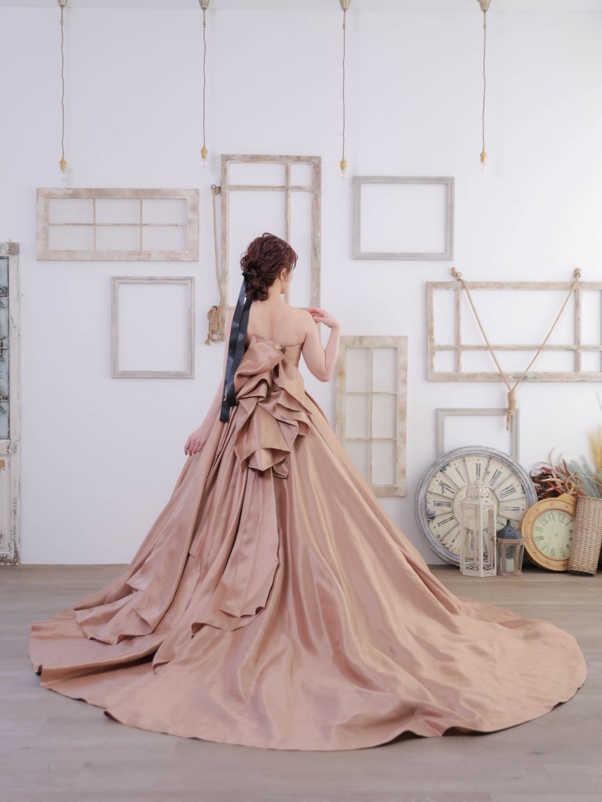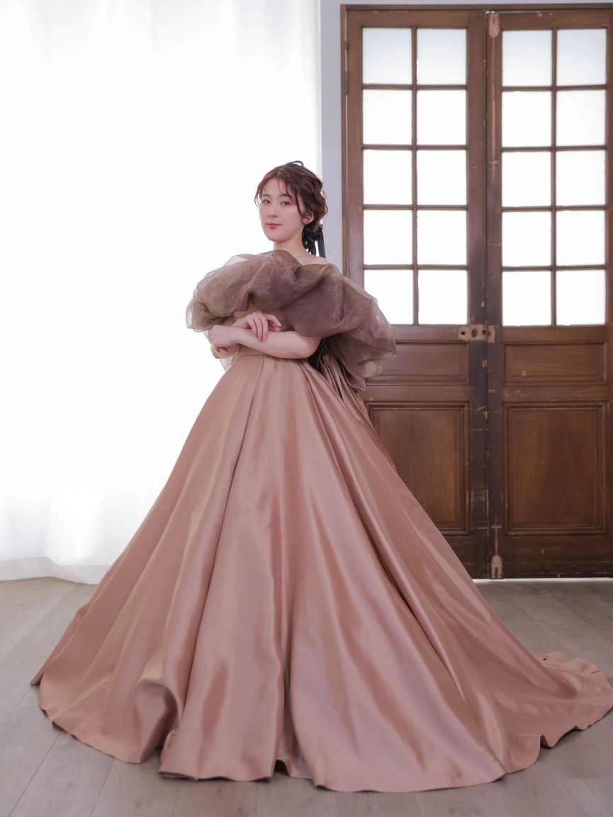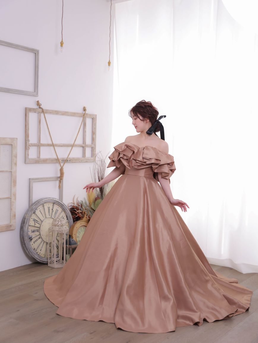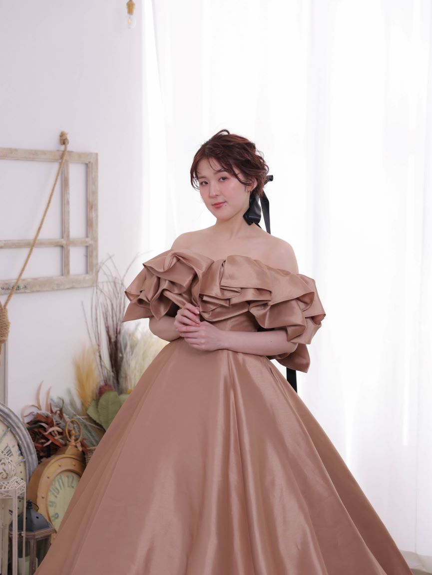 落ち着きのあるピンクゴールドが大人の気品を感じさせるカラードレス。立体的に重ねたボリュームフリルのオフショルダーデザインがデコルテを華やかに彩り、顔まわりを印象的に演出します。オーガンジー素材の別バージョンのオフショルダーもあり、3WAYでお楽しみいただけるドレスです。程よいハリと光沢のある素材が上質感を引き立て、ウエストから美しく広がるAラインシルエットが自然なスタイルアップ効果をもたらしてくれる、クラシカルで洗練された雰囲気を纏える一着です。