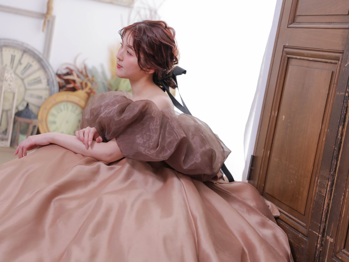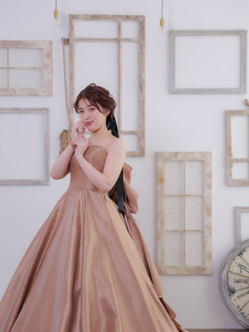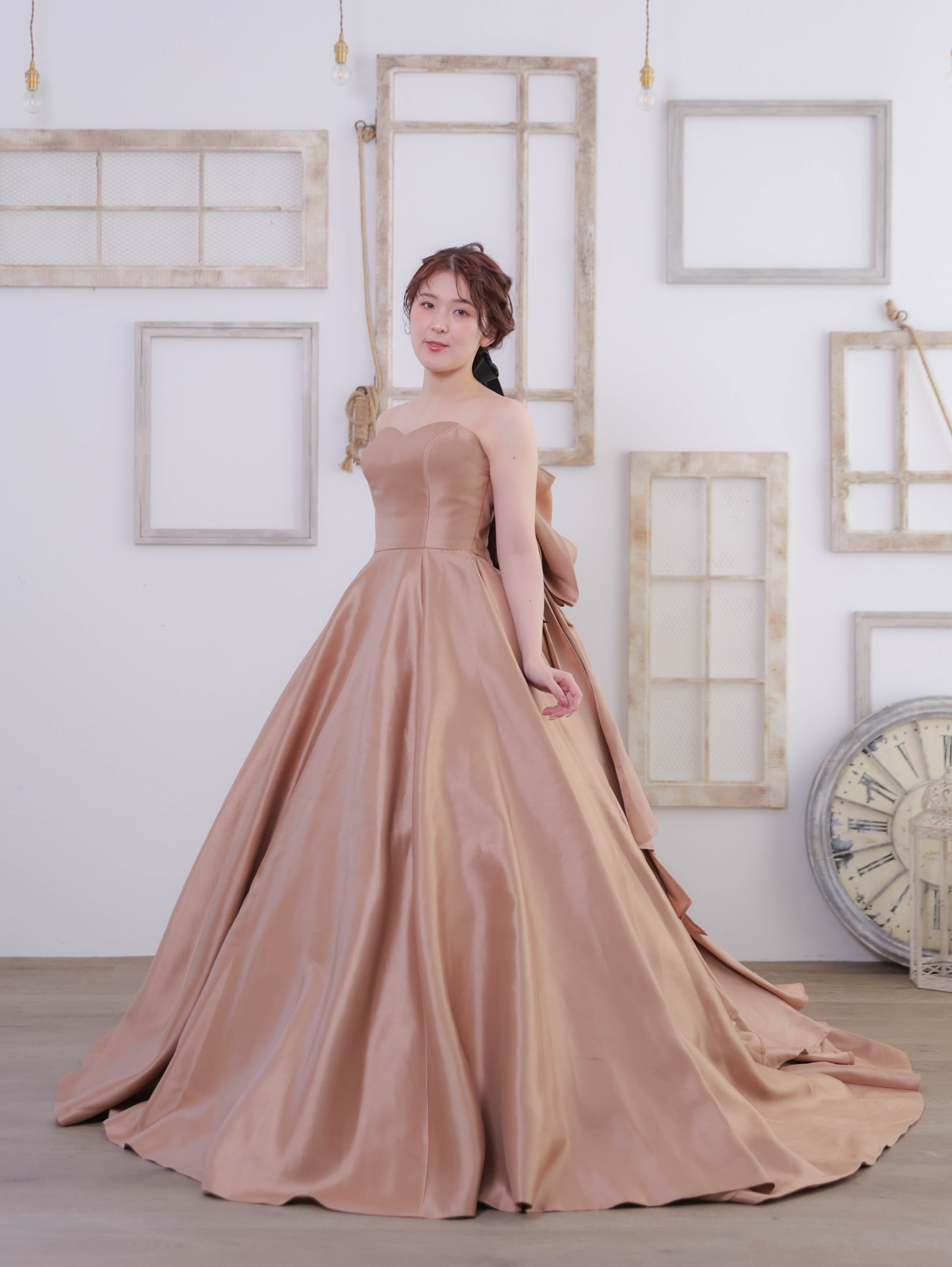 落ち着きのあるピンクゴールドが大人の気品を感じさせるカラードレス。立体的に重ねたボリュームフリルのオフショルダーデザインがデコルテを華やかに彩り、顔まわりを印象的に演出します。オーガンジー素材の別バージョンのオフショルダーもあり、3WAYでお楽しみいただけるドレスです。程よいハリと光沢のある素材が上質感を引き立て、ウエストから美しく広がるAラインシルエットが自然なスタイルアップ効果をもたらしてくれる、クラシカルで洗練された雰囲気を纏える一着です。