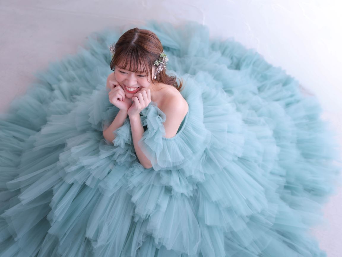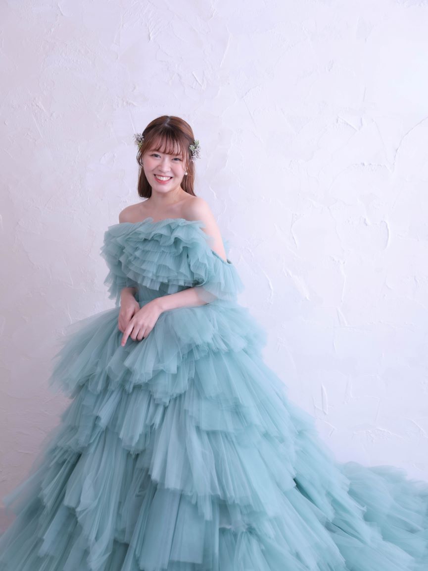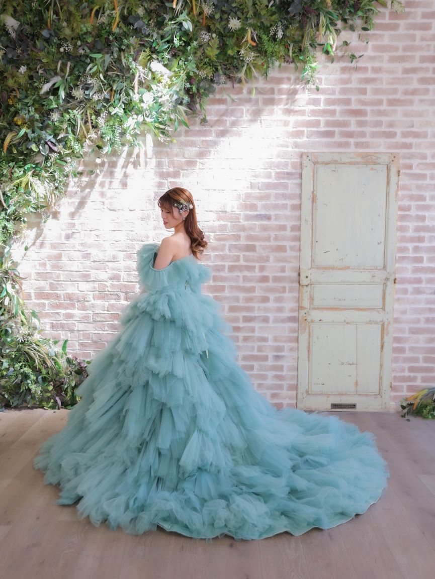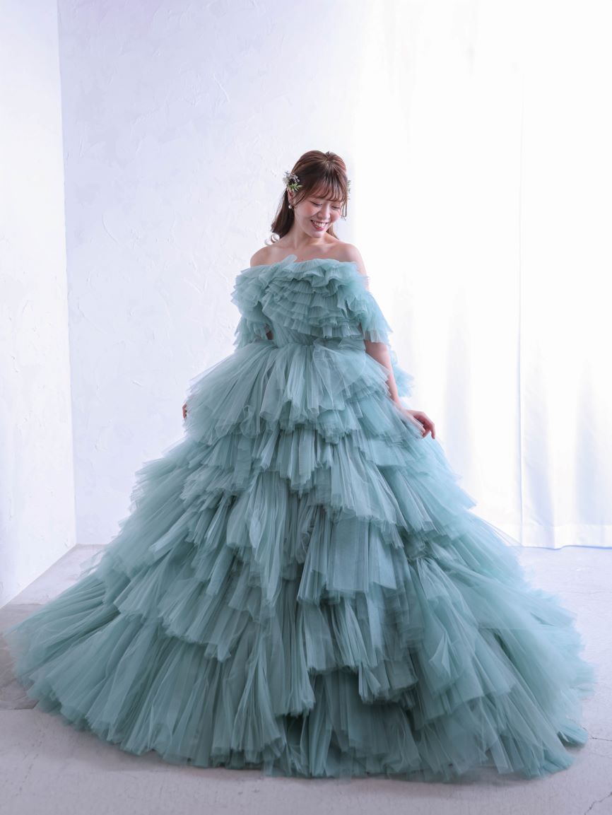 くすみ系のブルーグリーンが爽やかな、存在感あふれるカラードレス。幾重にも重ねたチュールフリルが立体感と軽やかさを生み出し、動くたびにふんわりと揺れる華やかな一着です。高めのウエスト位置とふんわりとしたティアードデザインが、腰回りやヒップラインを優しくカバーしながら、自然なスタイルアップを叶えてくれます。フリルのオフショルダーを外して2WAYでお楽しみいただける、華やかさと可憐さを兼ね備えた主役級のドレスです。