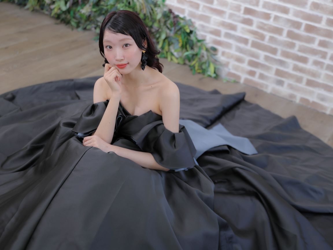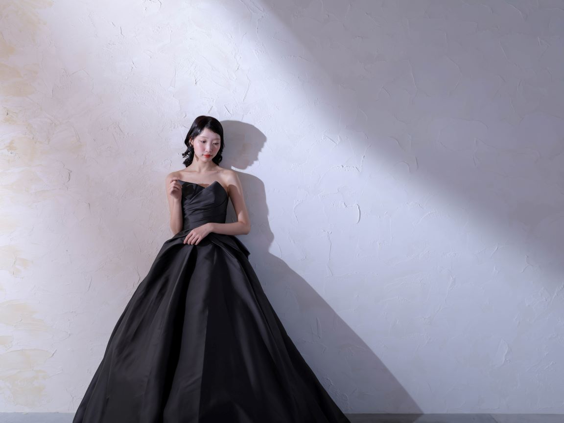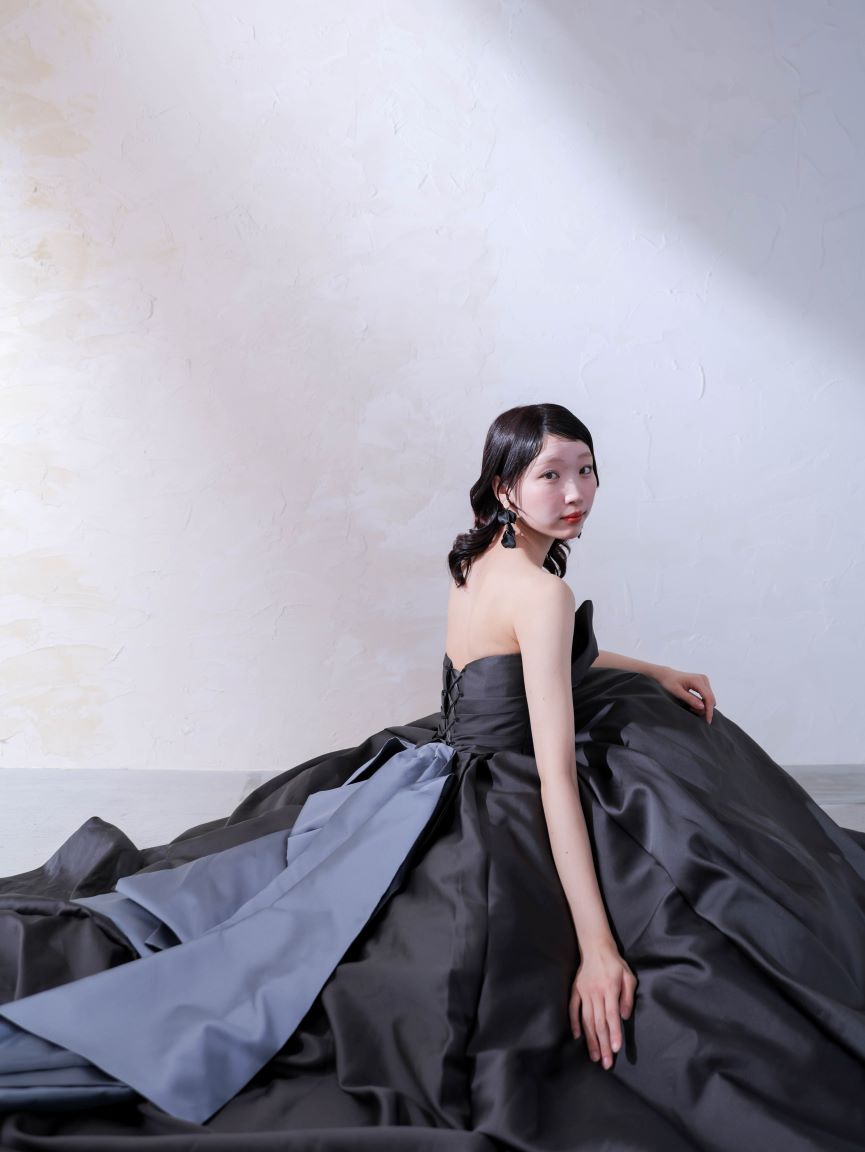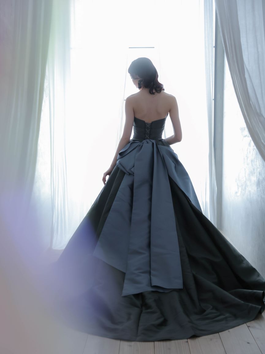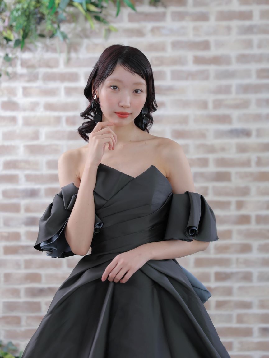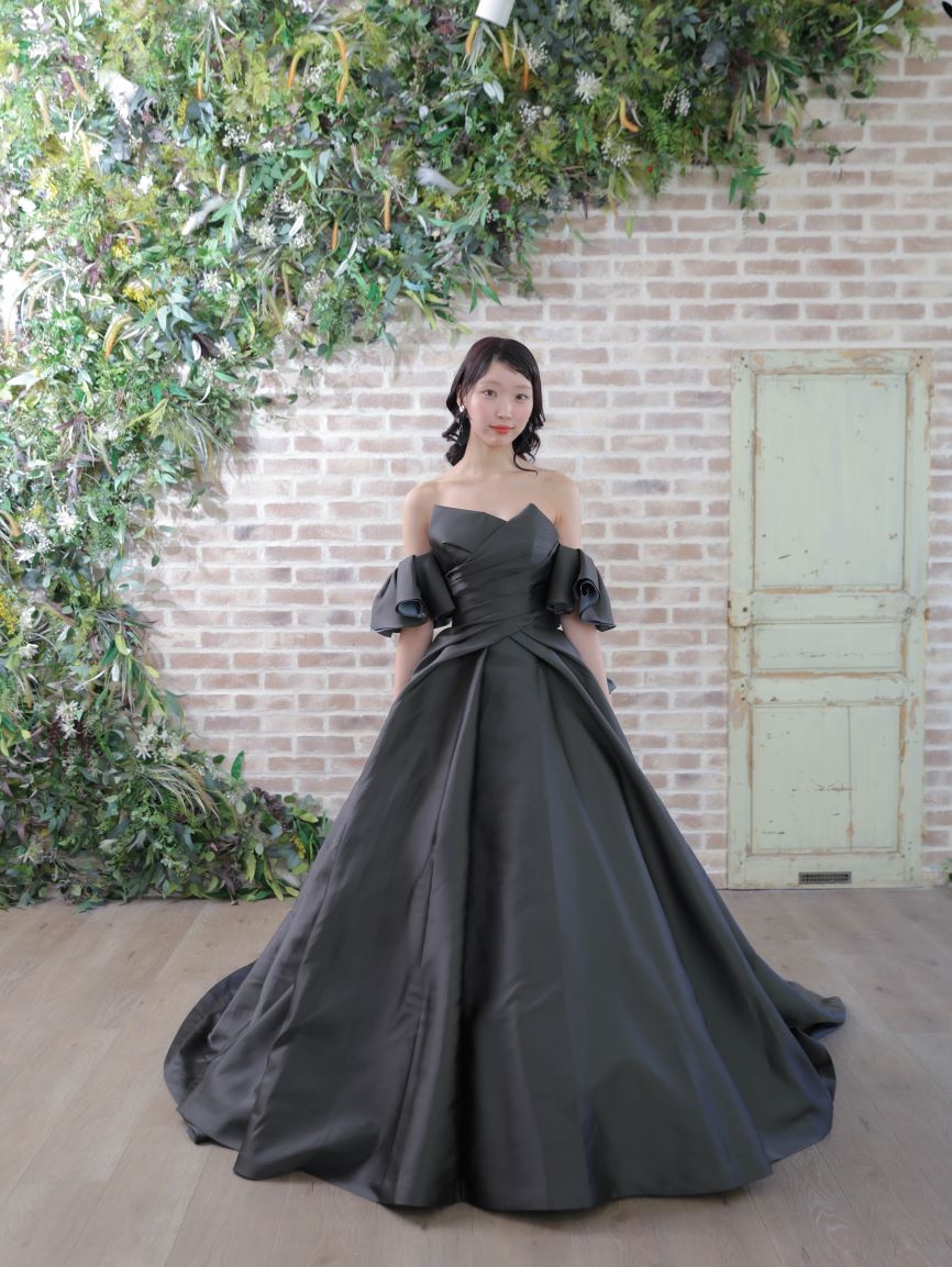 モダンな印象のチャコールブラックのカラードレス。程よいハリと光沢のある素材が、クラシカルでモードな雰囲気を演出します。ウエストに施された立体的なタッキングがシルエットを引き締め、付け外し可能なパフスリーブが二の腕を優しく包み込み、気になるラインをカバーしてくれるので、全体的なスタイルアップ効果が狙えます。パフスリーブをを外せば、凛とした気品が際立つビスチェスタイルへと表情を変える2WAY仕様です。