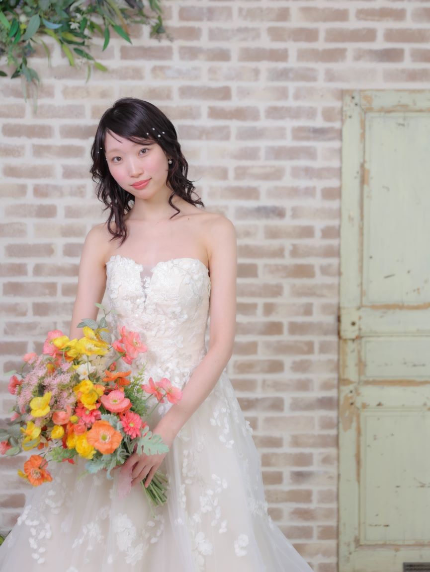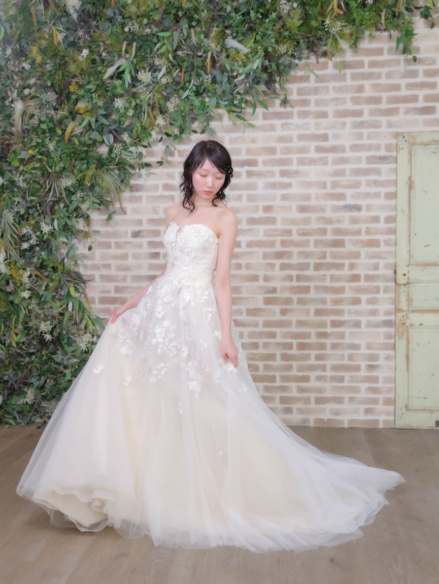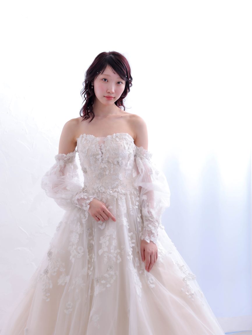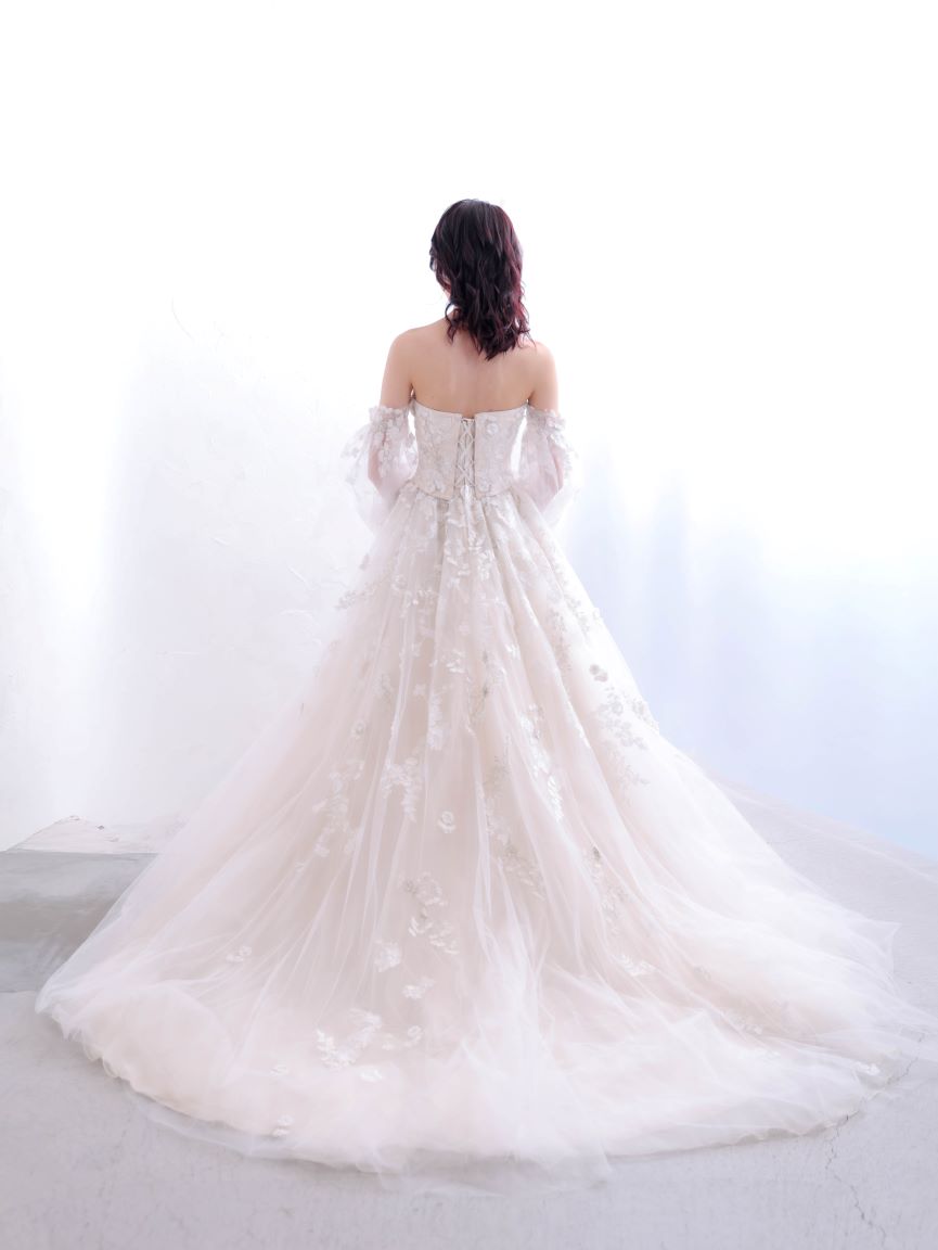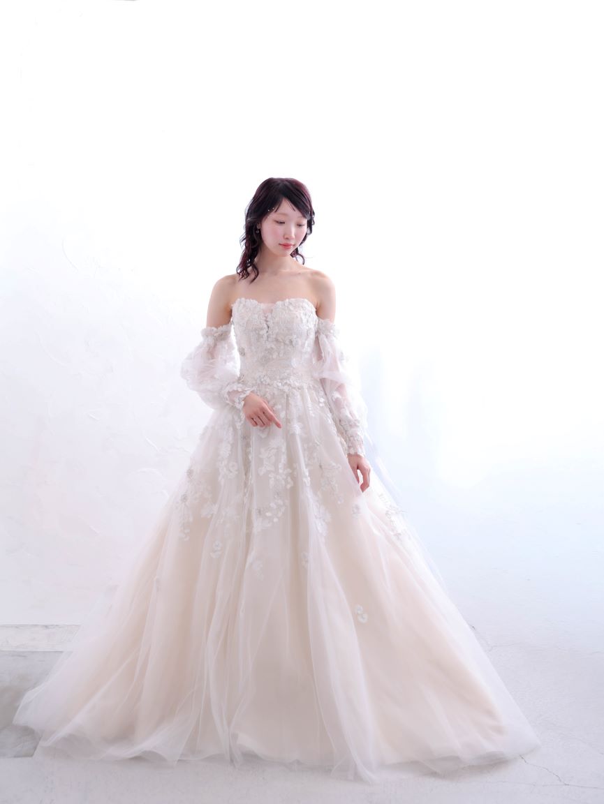 アイボリーカラーが優しい印象を創り出す、ロマンティックなウェディングドレス。繊細なフラワーレースを贅沢にあしらったビスチェはデコルテを美しく引き立て、つけ外し可能な透け感のあるオフショルダーのパフスリーブが可憐で上品な印象を演出します。ウエストからふんわりと広がるAラインシルエットは全体をすっきりと見せてくれる効果もあり、透け感のある素材が動くたびに柔らかな表情をプラス。気になる二の腕やヒップラインをさりげなくカバーしてくれるのも魅力的な、透明感と華やかさを兼ね備えた一着です。