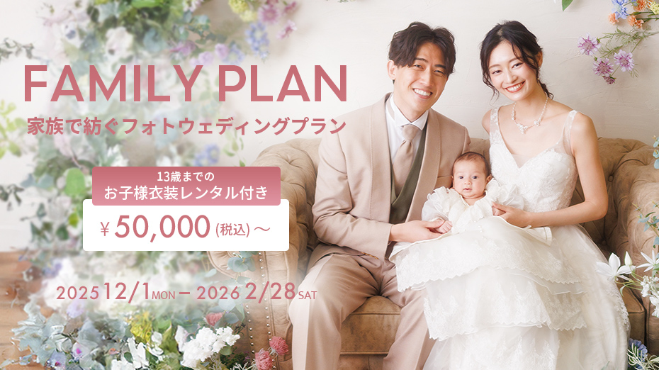キッズスタジオ併設でお子様用衣装も豊富なためファミリーでの後撮りや、結婚記念日のアニバーサリーフォトなども人気です。