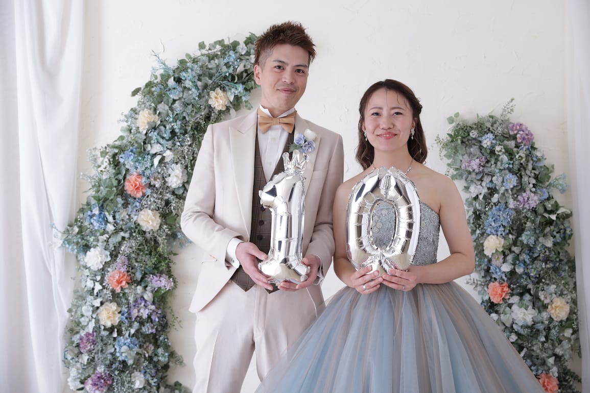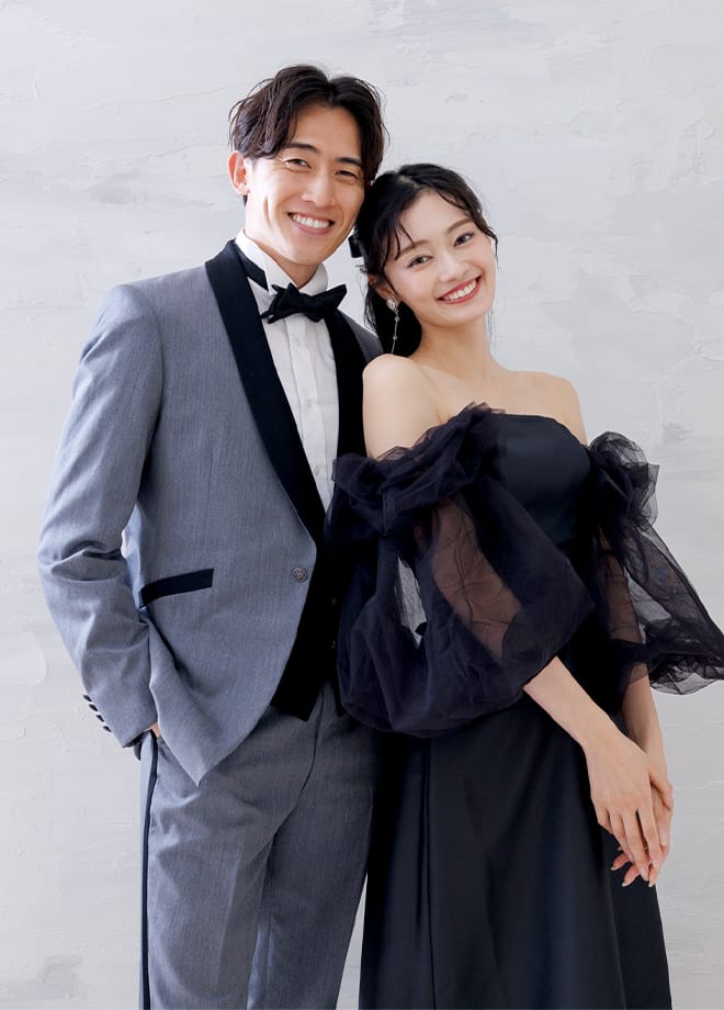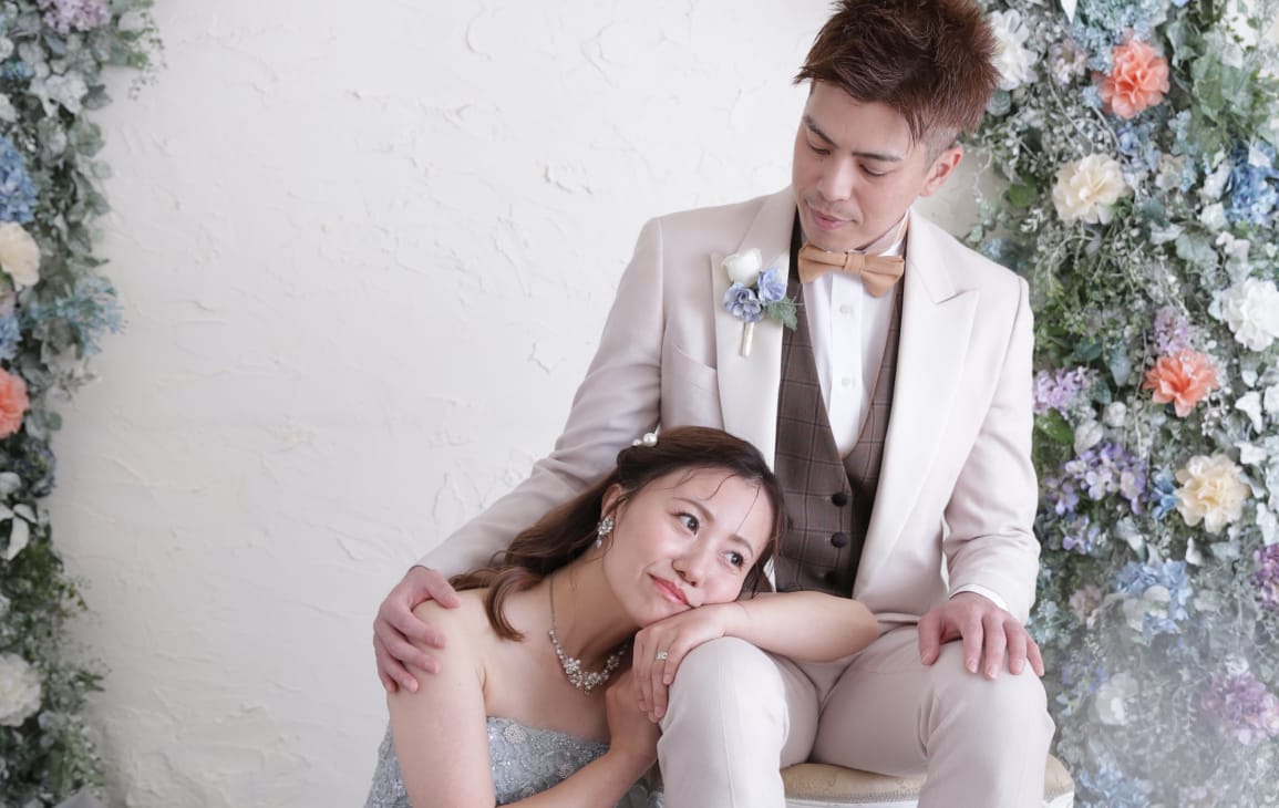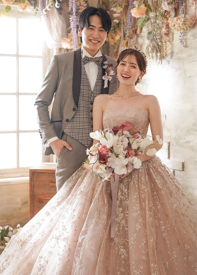 ドレスやワンピース、ジャケットスタイルなどセミフォーマルな私服で来ていただくと、お二人がお揃いの衣装合わせを演出できます。よりドレスアップしたい方には、ナチュラルで落ち着いたラインのウエディングドレスやカラードレスなどもおすすめです。スタジオ背景はシンプルな白バックだけでなく、映画のセットのような世界観を作り込んだスタジオでの撮影も可能です。